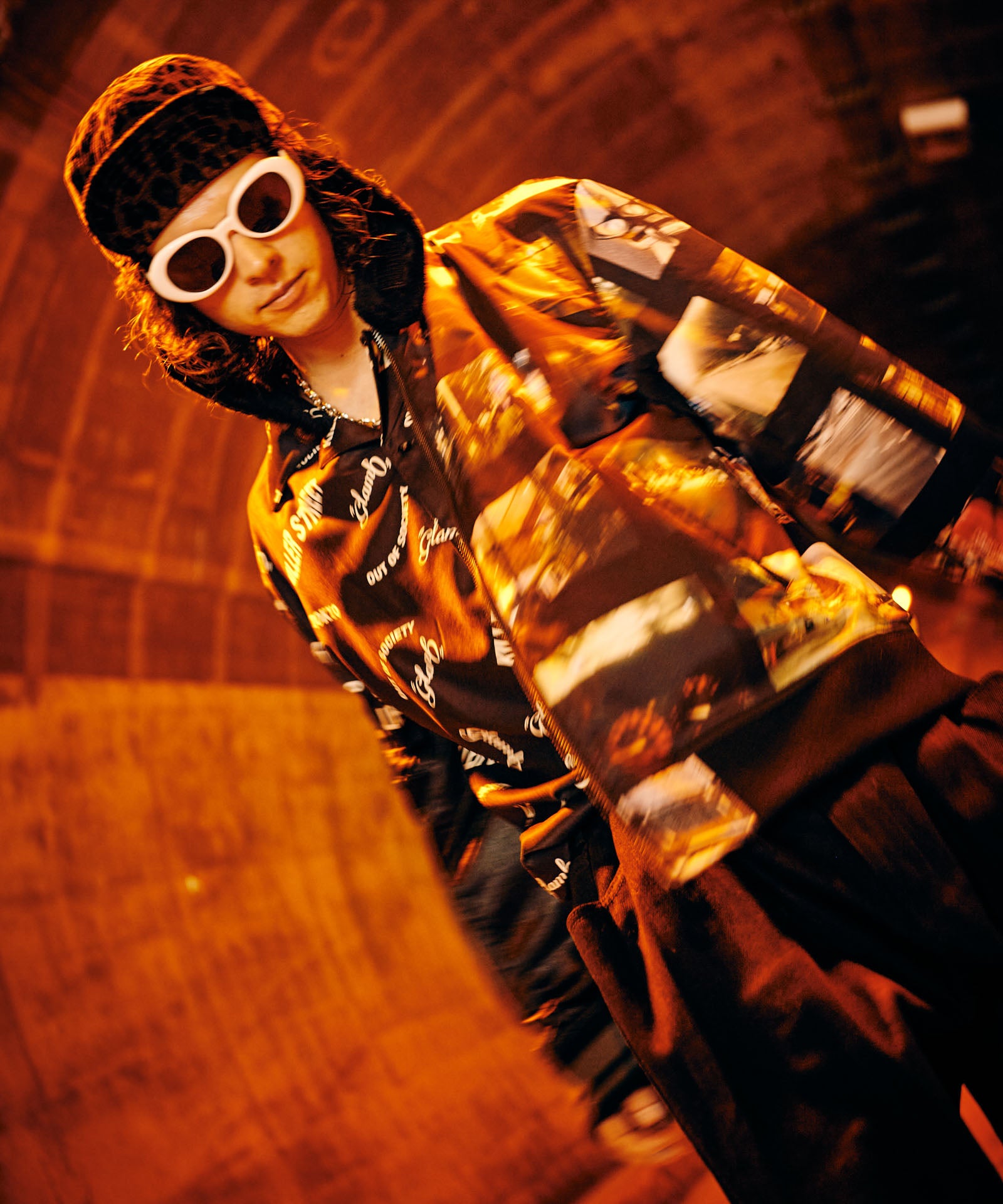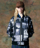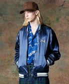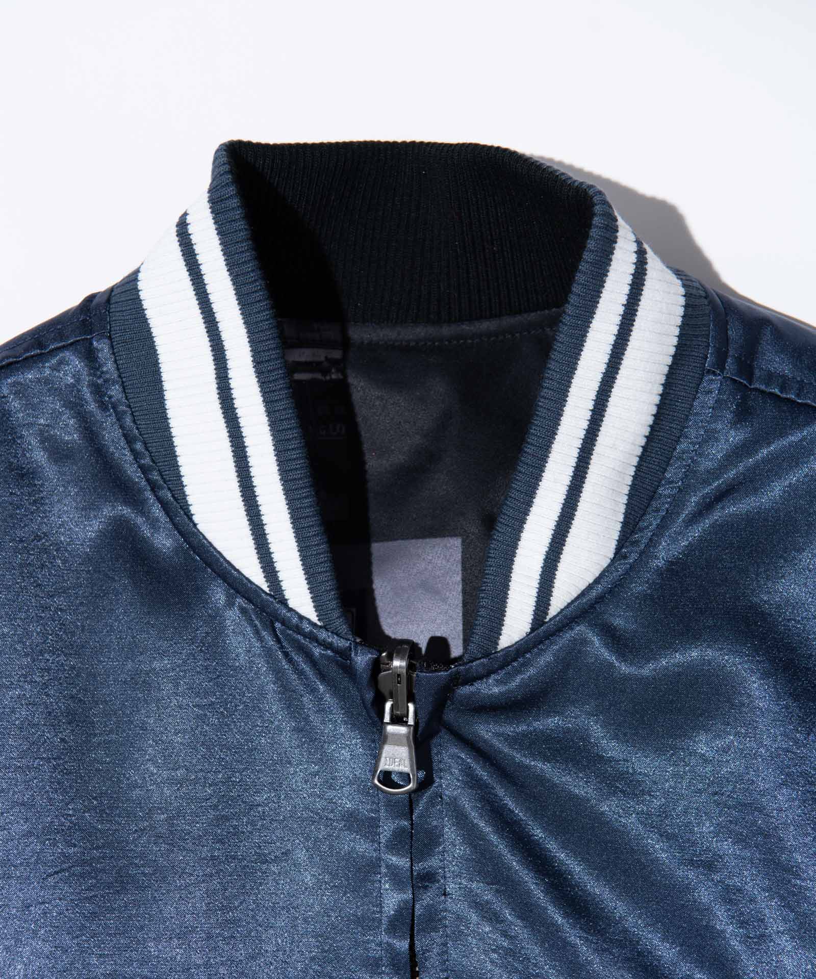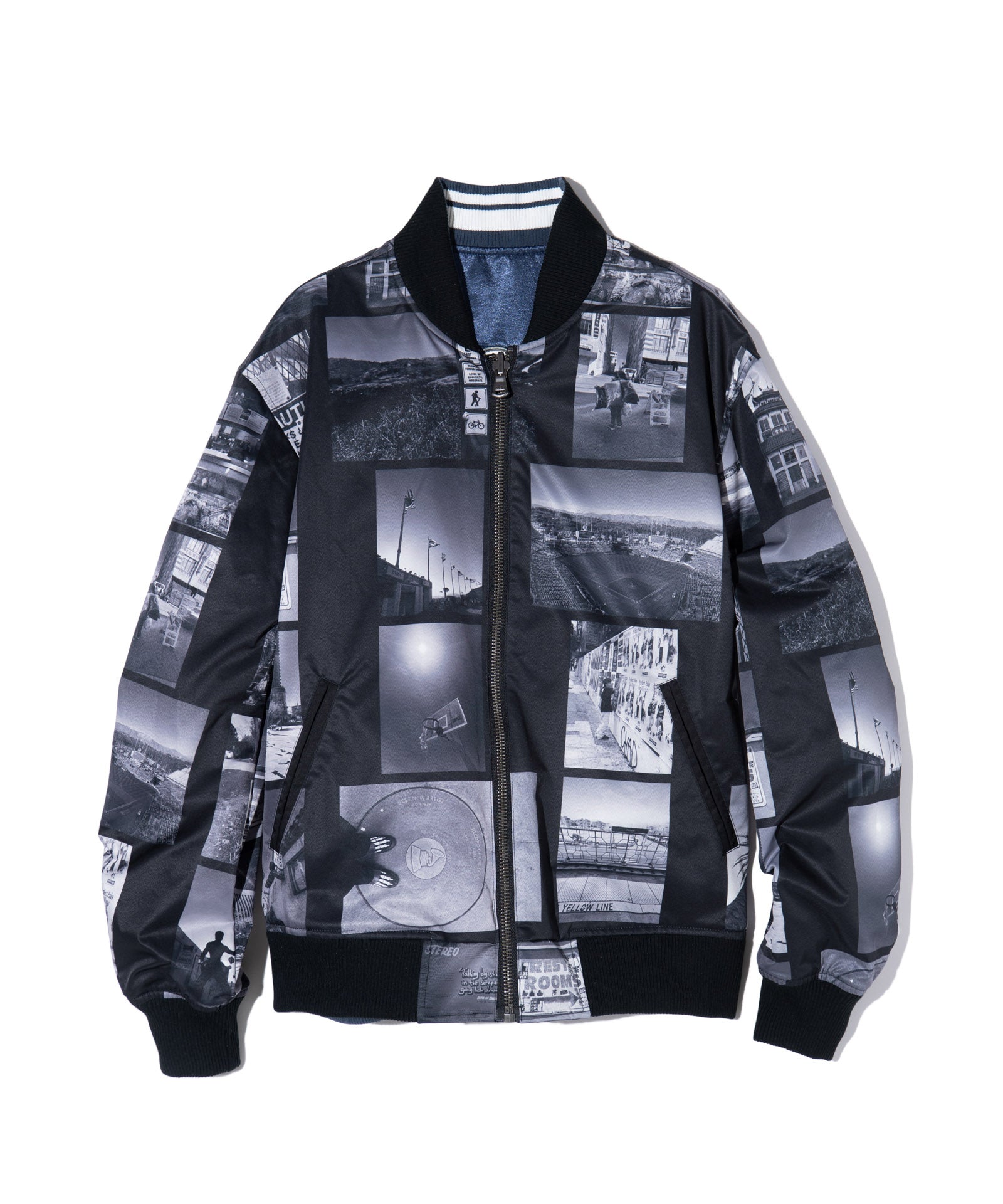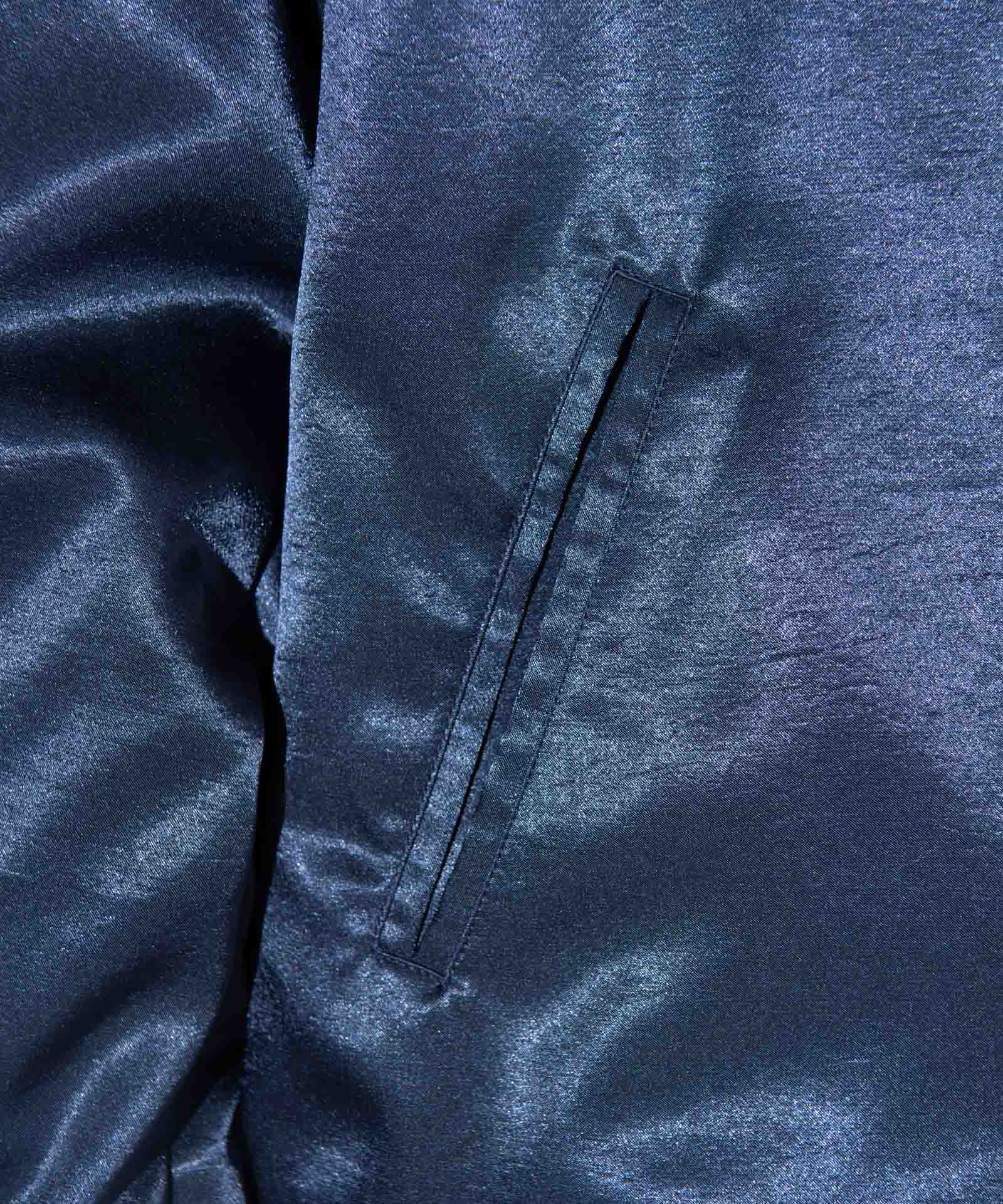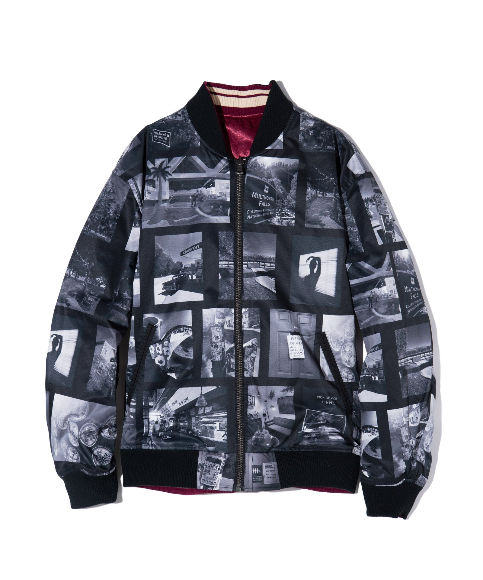 ブランドのデザイナーが今季のコレクションの構想にあたって過ごした3つの都市の空気感をリバーシブルボディで表現したReversible City Blouson。ヴィンテージサテンをテキスタイルに使用した無地面はバックスタイルにテーマとなった都市名をワッペンと刺繍のコンビネーション使いで刻印。裏返すとその都市の光景が総柄使いとなって現れるというストーリー性あるリバーシブルデザインとなっています。ラインリブは細線と太線を組み合わせたオリジナルピッチ。武骨な印象を見せる8号ファスナーもスタイリングにタフなニュアンスを与えます。