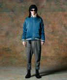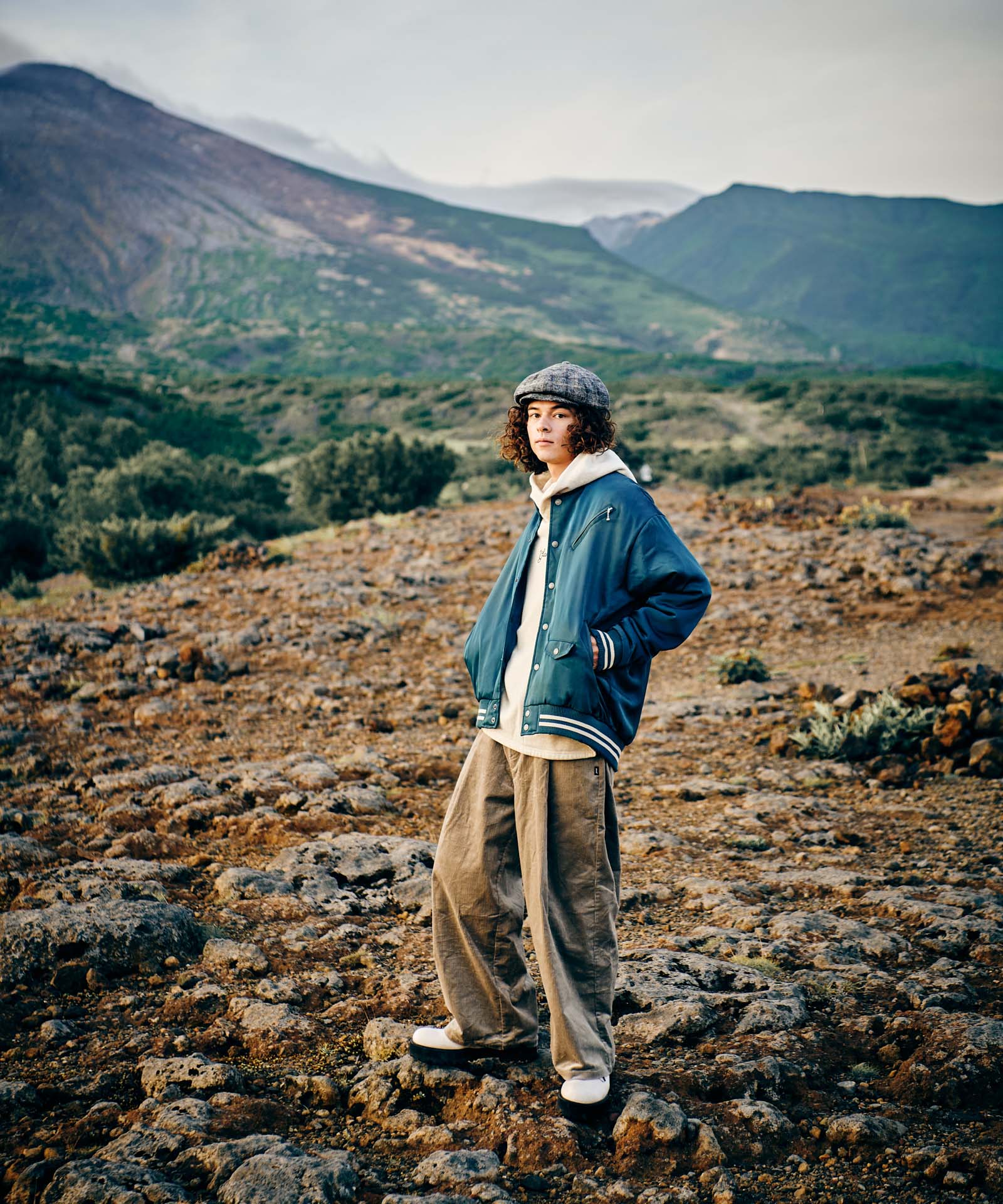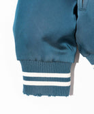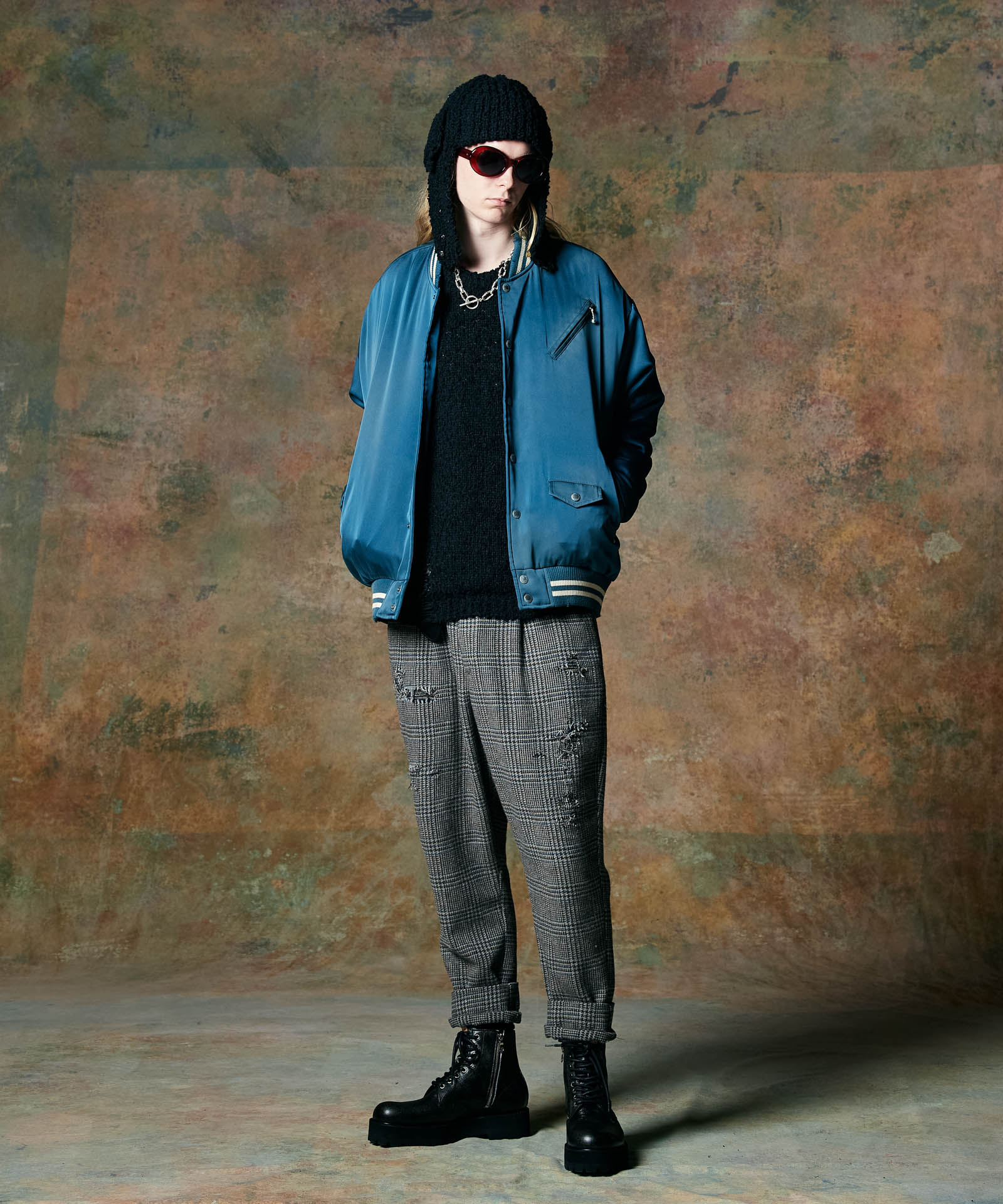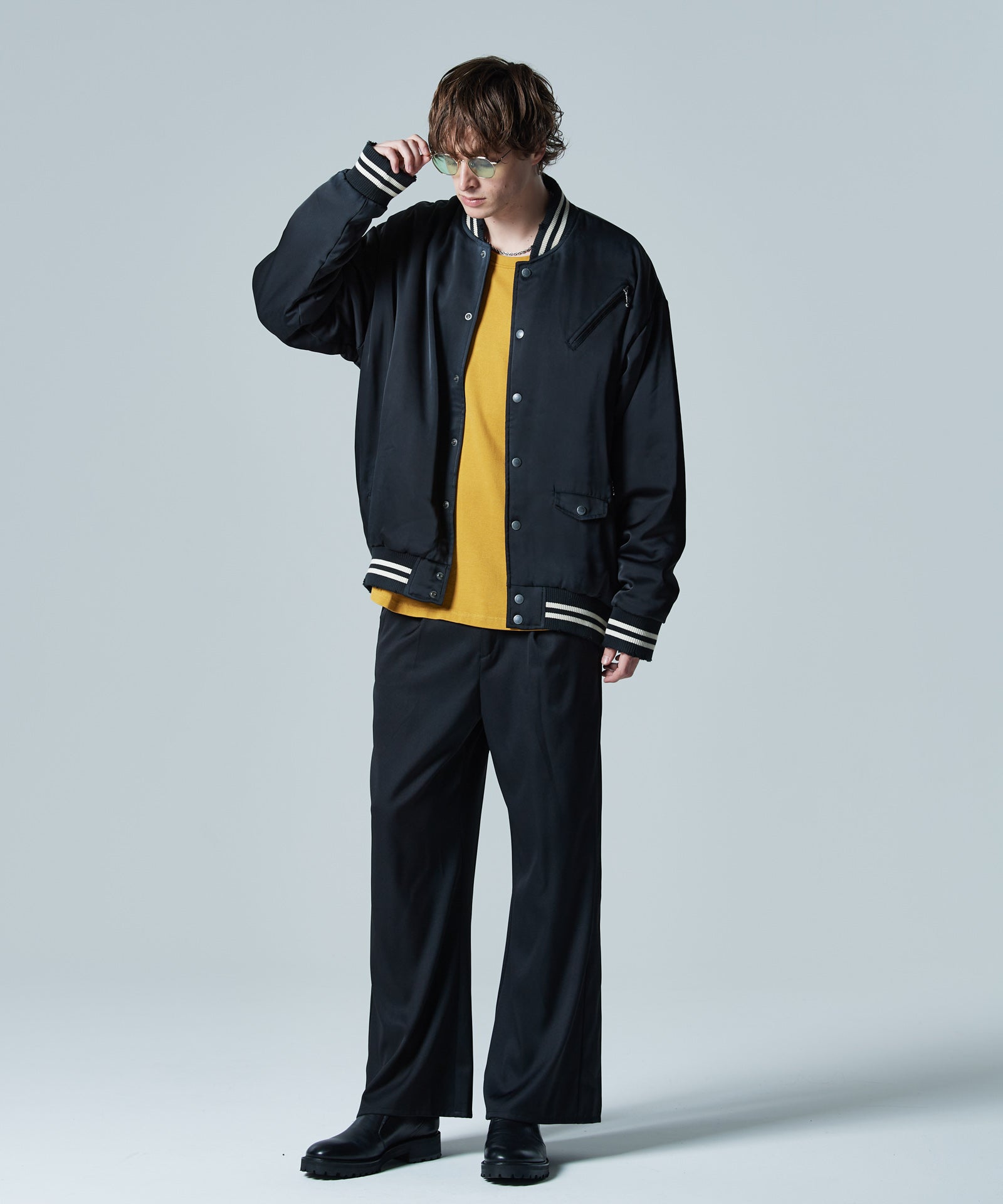 スタジアムジャンパーにライダースジャケットの意匠を組み合わせたシュルレアリスティックなバランスが魅力となるZip Pocket Stadium Jumper。オーバーサイズシルエットのボディは前身頃にバイカー仕様のジップポケットとサブポケットが。仕上げにリブ部分にさりげなくダメージを加えた上、洗い加工を施すことでこなれた佇まいにまとめています。テキスタイルには抑制の効いた光沢感を備えた生地を使用。ミニマルさの中に漂うロックのニュアンスはアダルトなアウタースタイリングを叶えます。