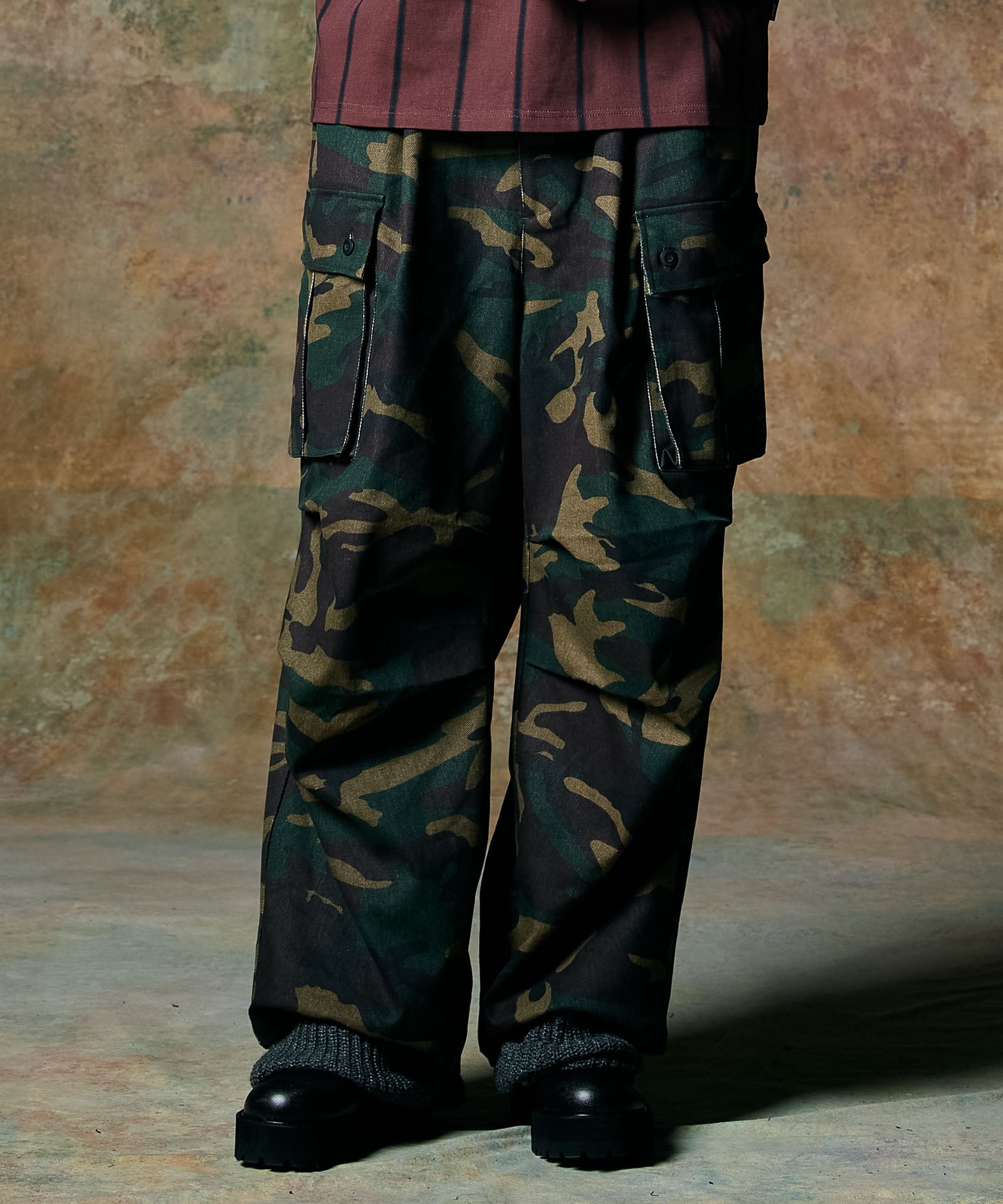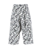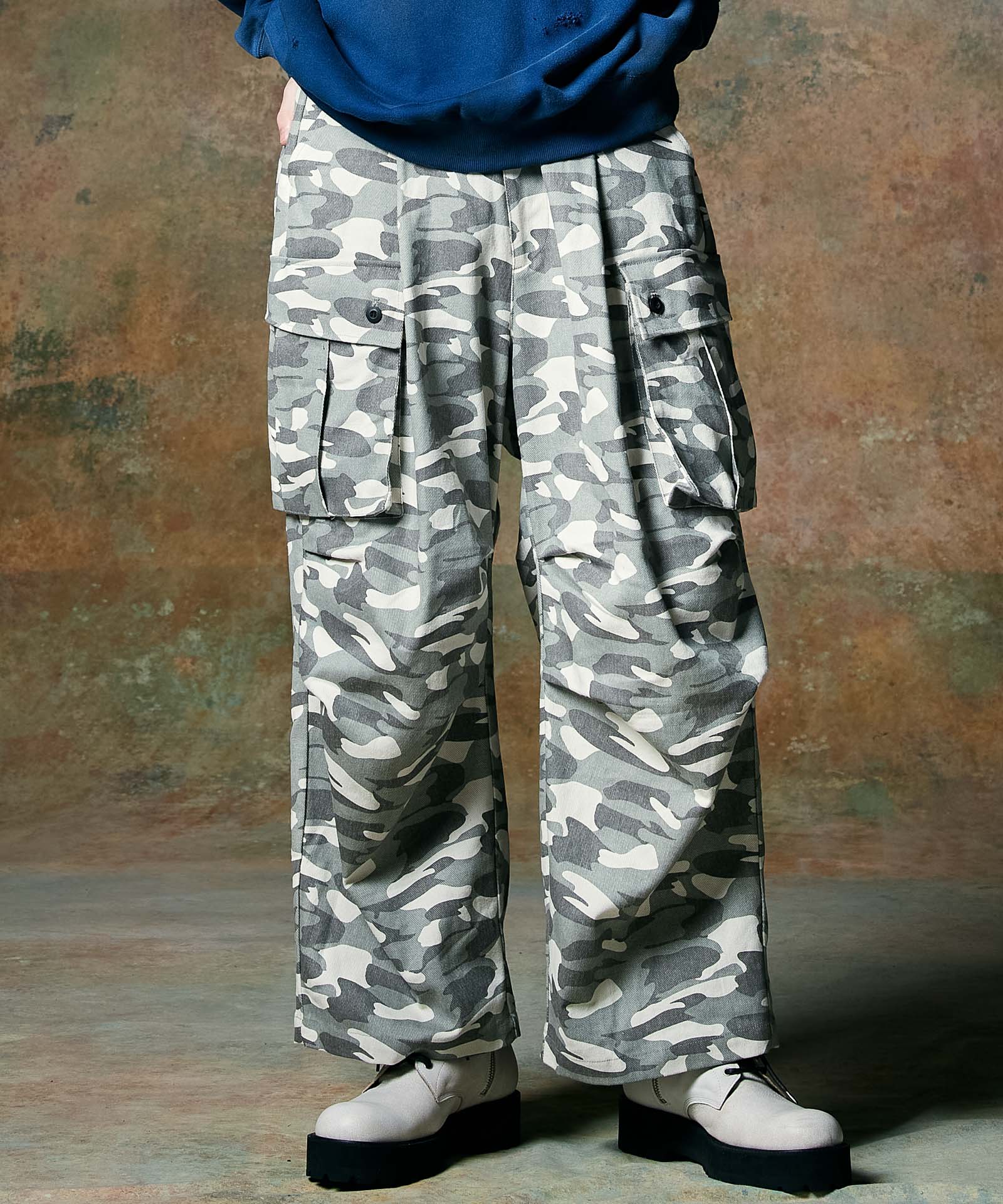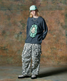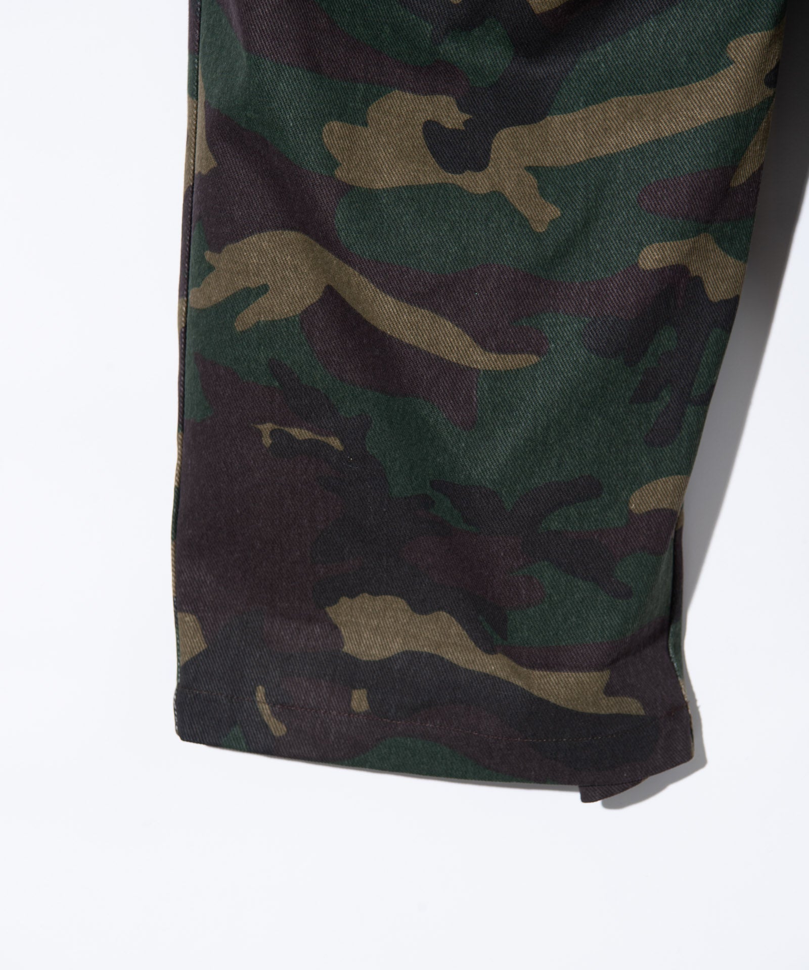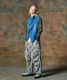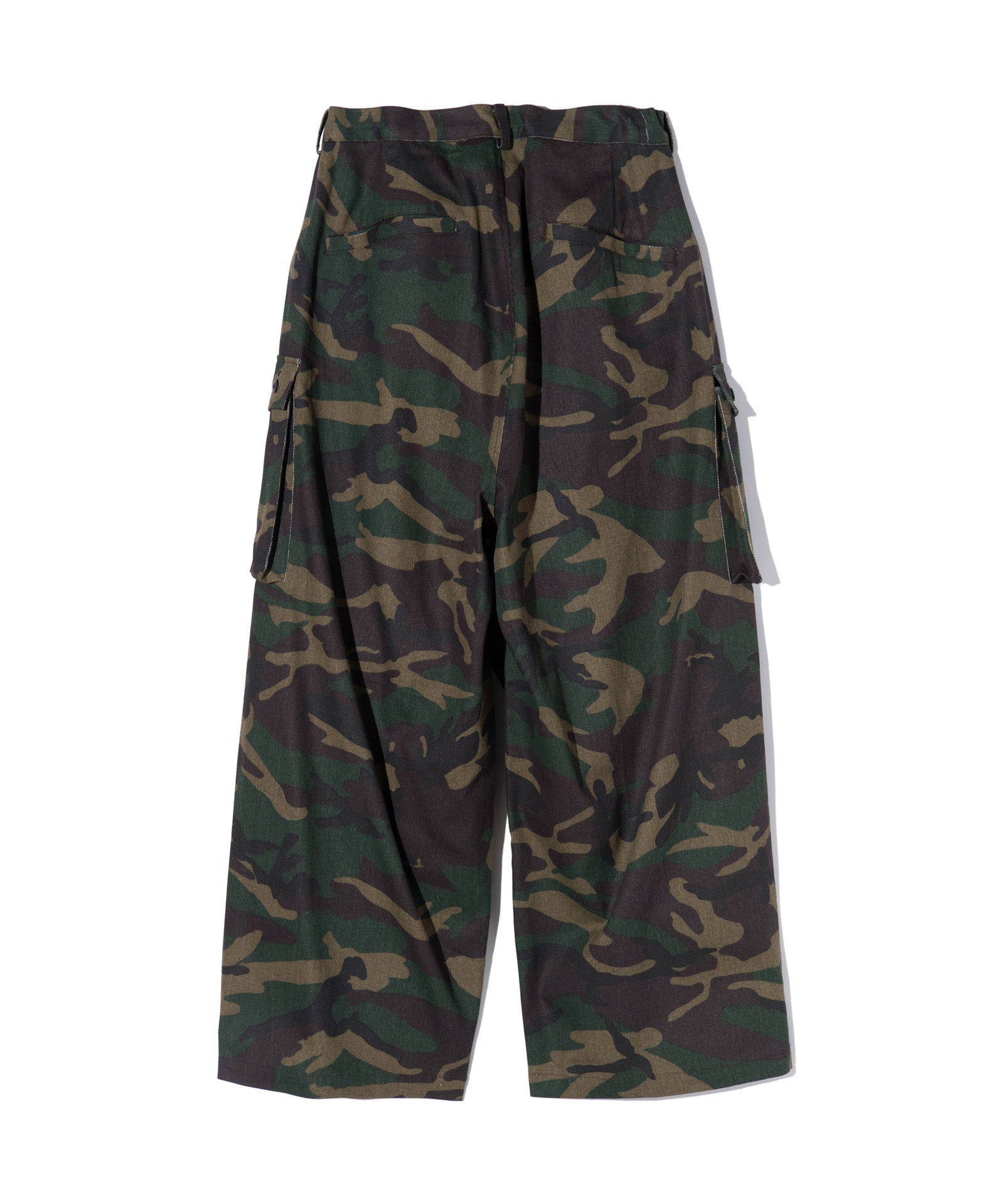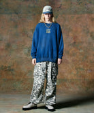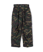 ボリュームある素材使いでミリタリーをデザインコンシャスなウェアへと昇華したWide Military Pants。カモ柄を総柄にあしらったボディは腰元に1タックを取ったワイドシルエット。サイドにはマチ付きカーゴポケットをあしらい、膝には2タックを取ってさらなるボリュームを演出。テキスタイルに打ち込みの強いコットンツイルを用いてタフな印象に仕上げました。ウエスト内側にはドローストリングを内蔵。ヴィジュアルとは裏腹にイージーな着用を実現しています。