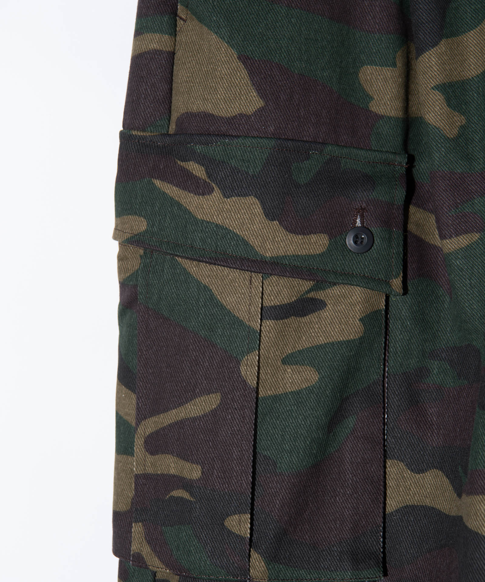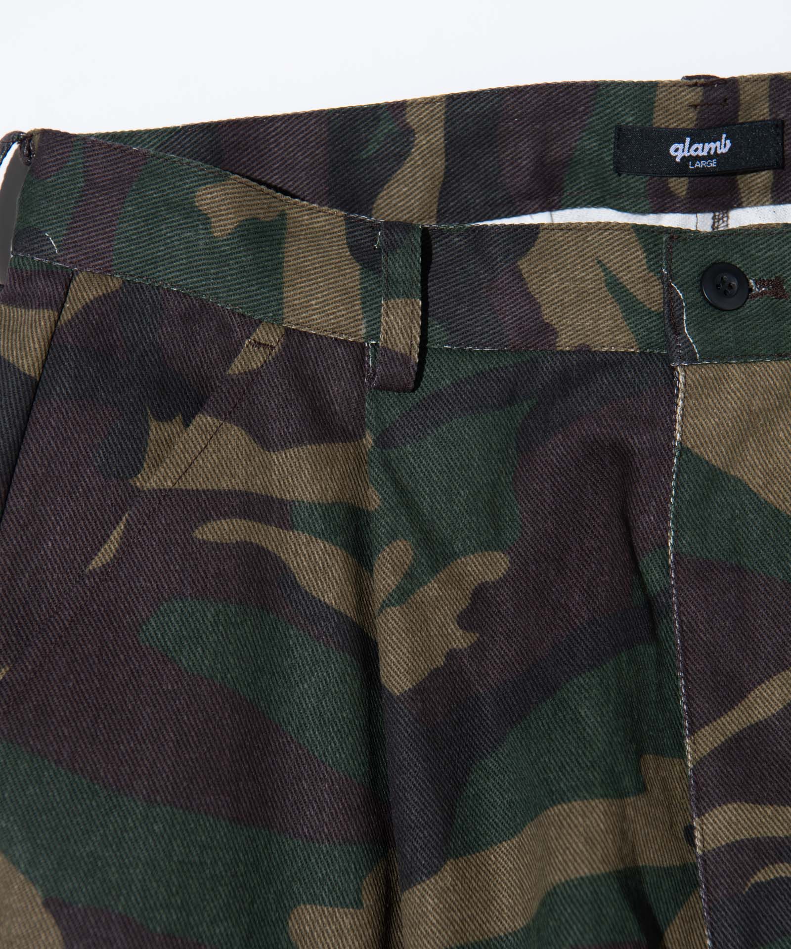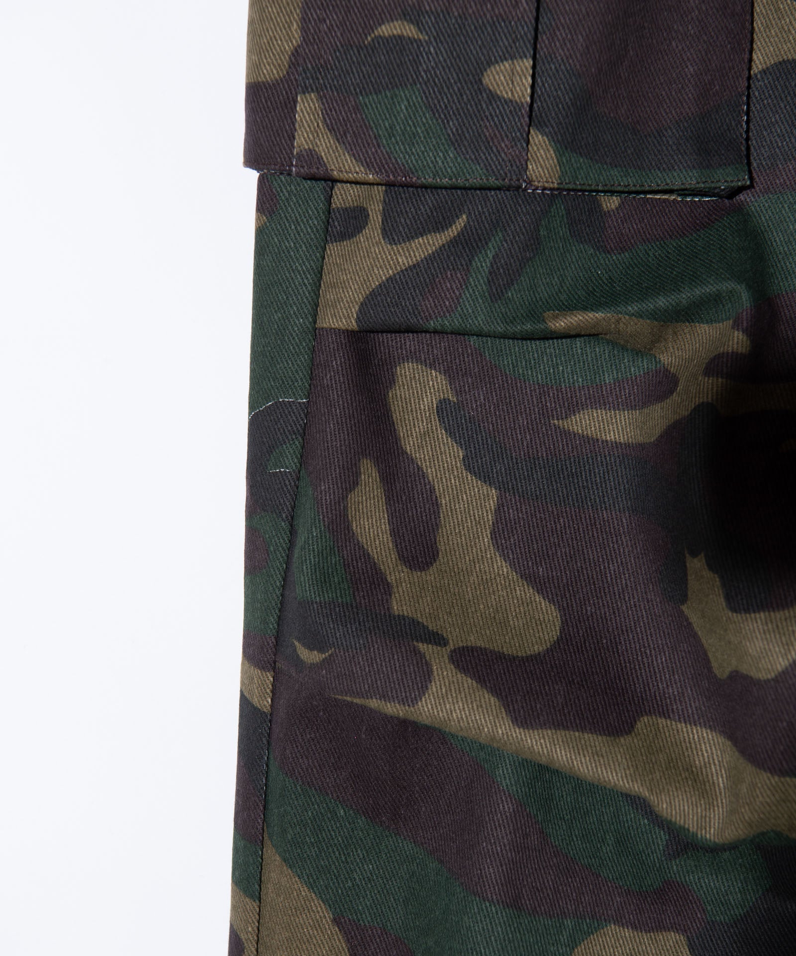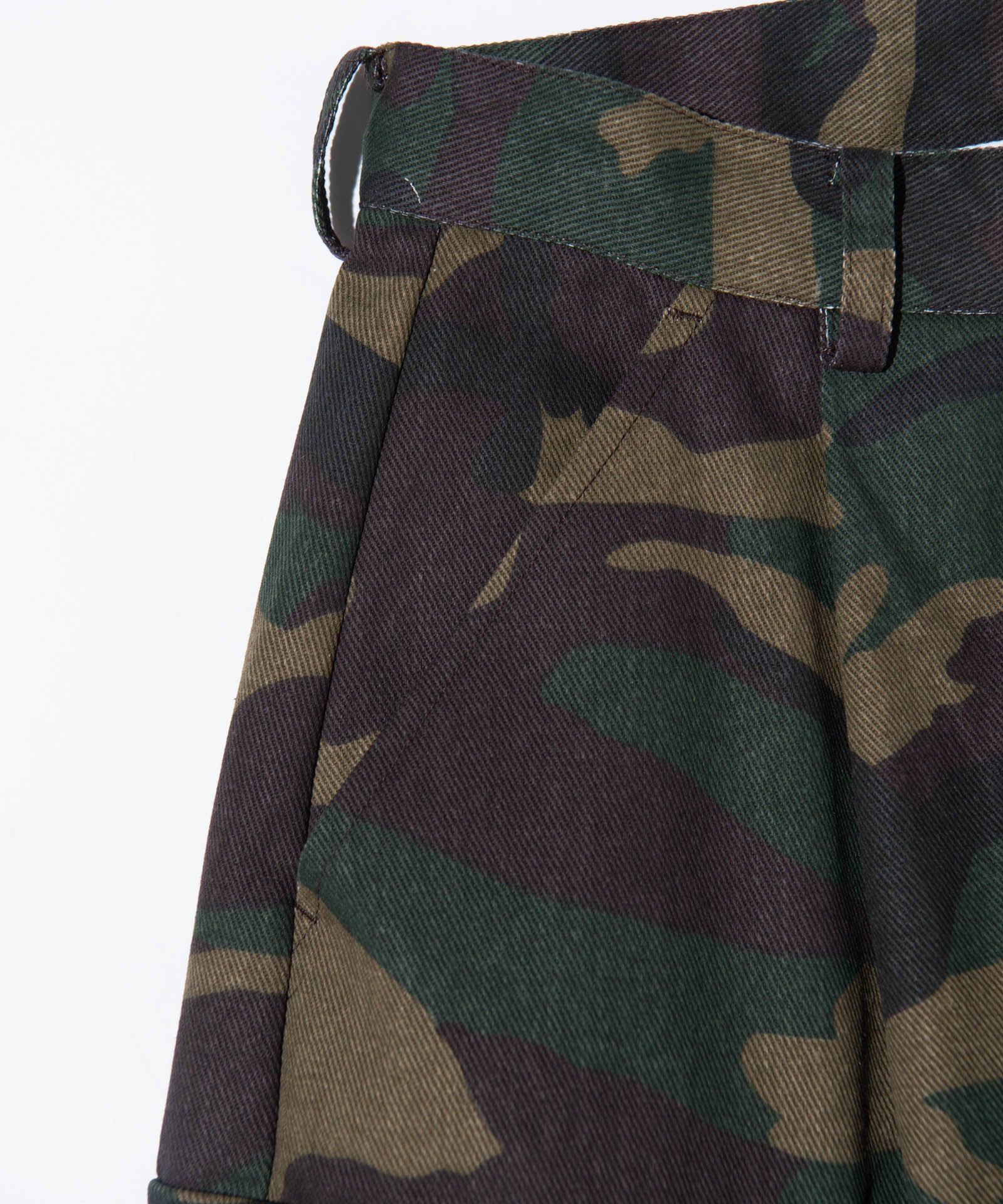 ボリュームある素材使いでミリタリーをデザインコンシャスなウェアへと昇華したWide Military Pants。カモ柄を総柄にあしらったボディは腰元に1タックを取ったワイドシルエット。サイドにはマチ付きカーゴポケットをあしらい、膝には2タックを取ってさらなるボリュームを演出。テキスタイルに打ち込みの強いコットンツイルを用いてタフな印象に仕上げました。ウエスト内側にはドローストリングを内蔵。ヴィジュアルとは裏腹にイージーな着用を実現しています。