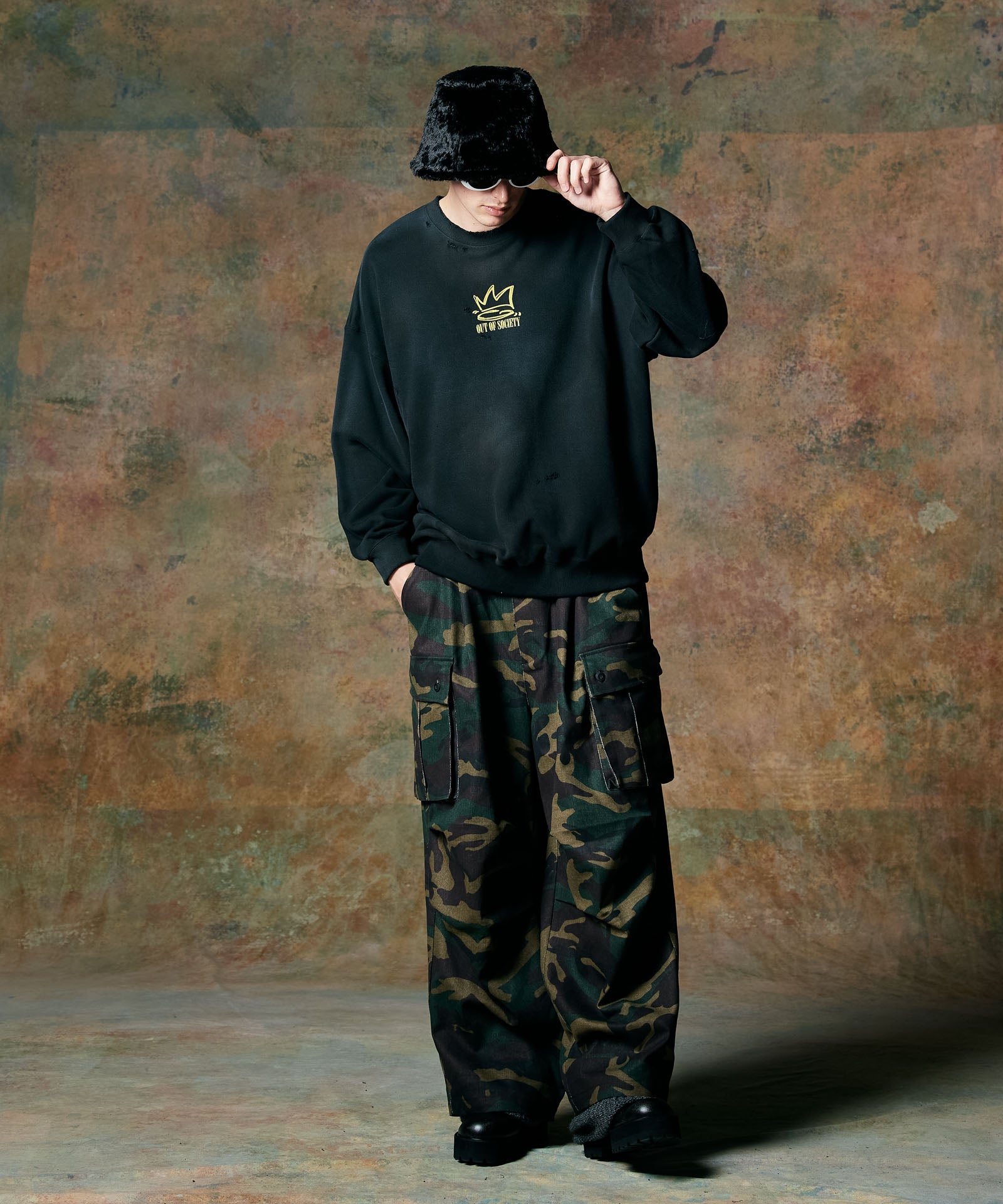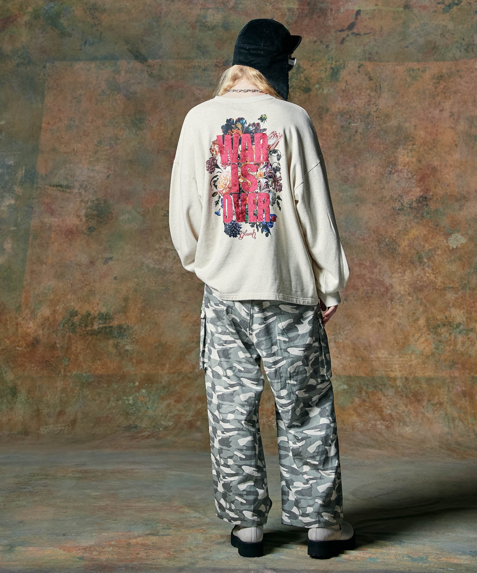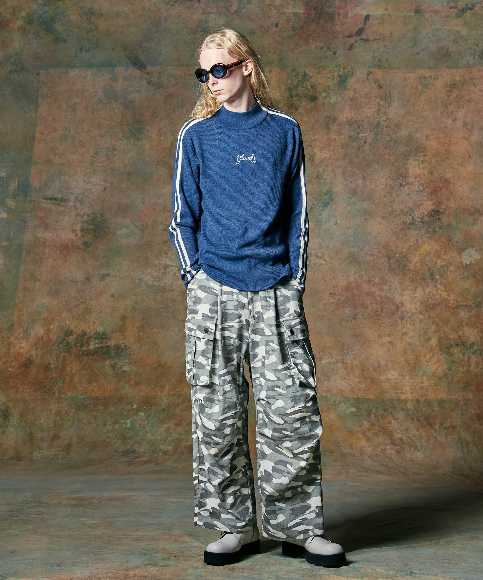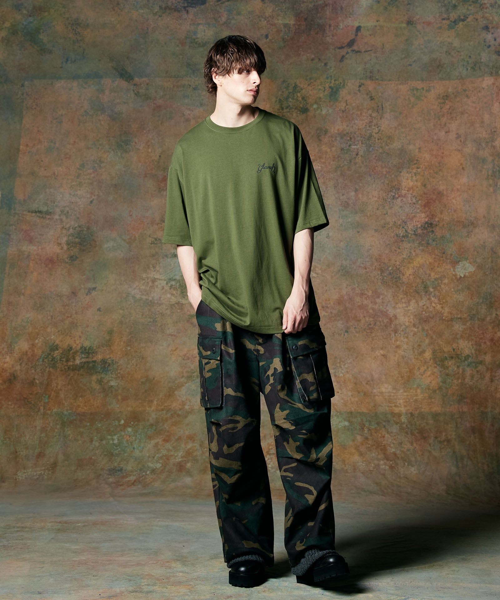 ボリュームある素材使いでミリタリーをデザインコンシャスなウェアへと昇華したWide Military Pants。カモ柄を総柄にあしらったボディは腰元に1タックを取ったワイドシルエット。サイドにはマチ付きカーゴポケットをあしらい、膝には2タックを取ってさらなるボリュームを演出。テキスタイルに打ち込みの強いコットンツイルを用いてタフな印象に仕上げました。ウエスト内側にはドローストリングを内蔵。ヴィジュアルとは裏腹にイージーな着用を実現しています。