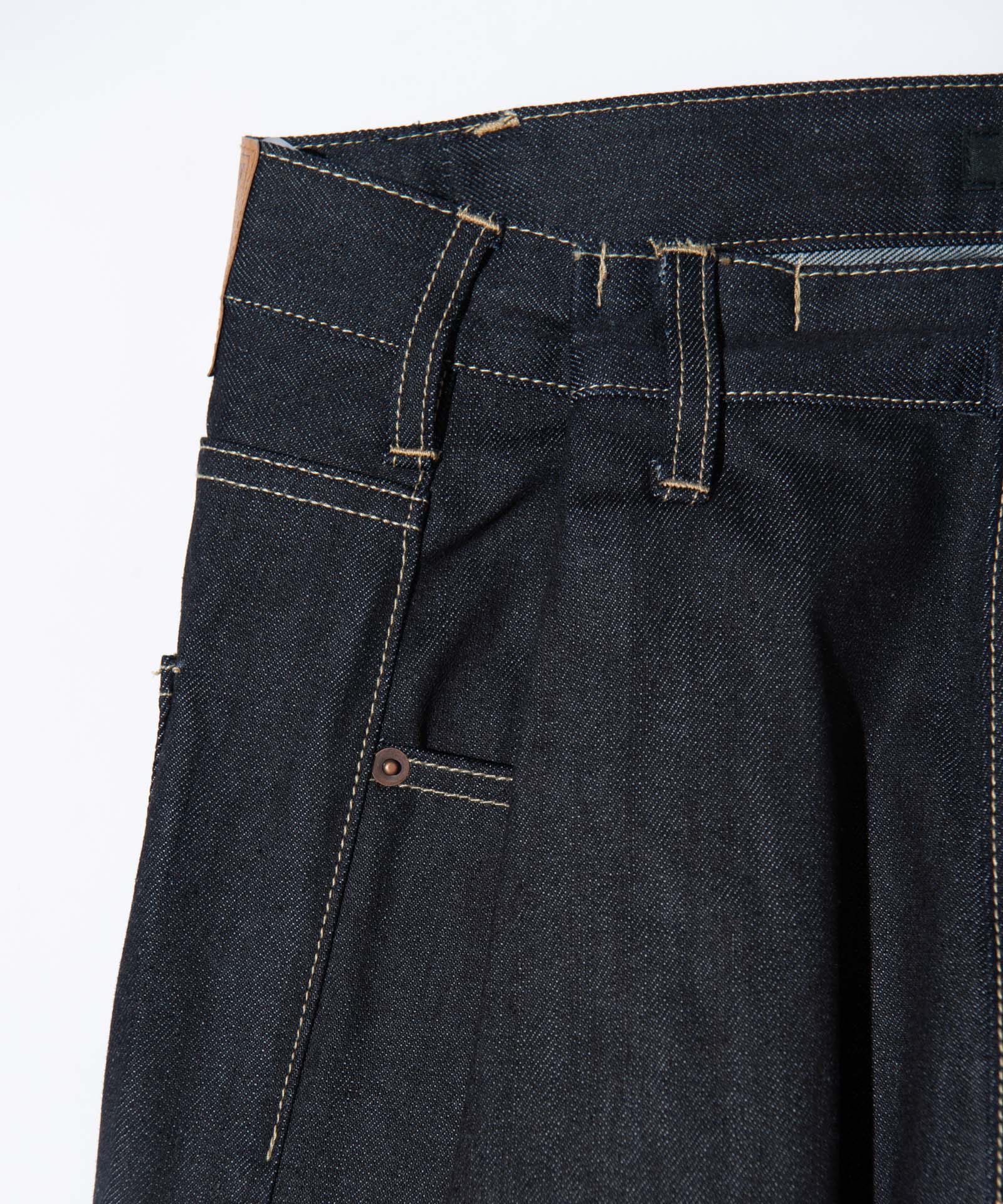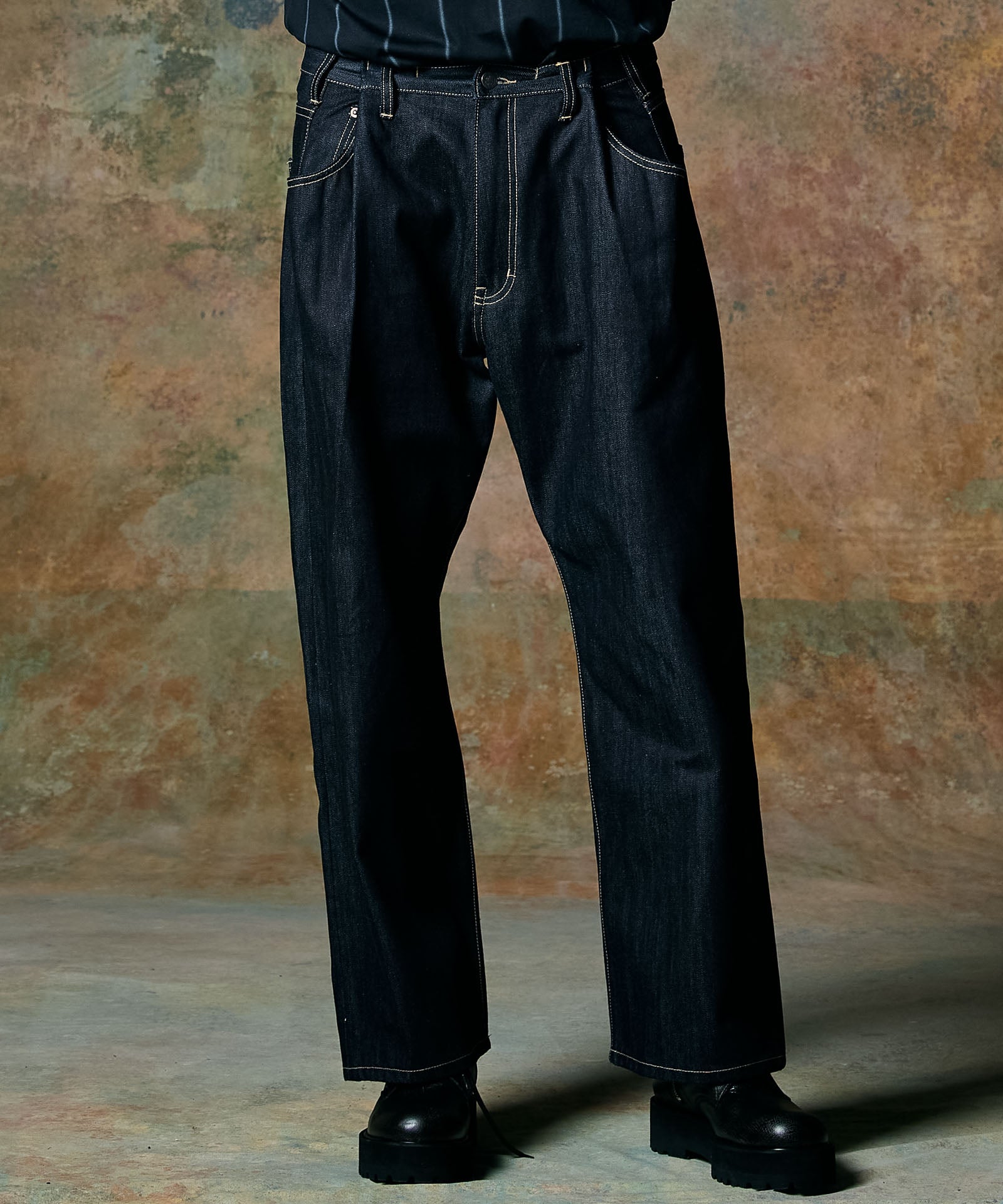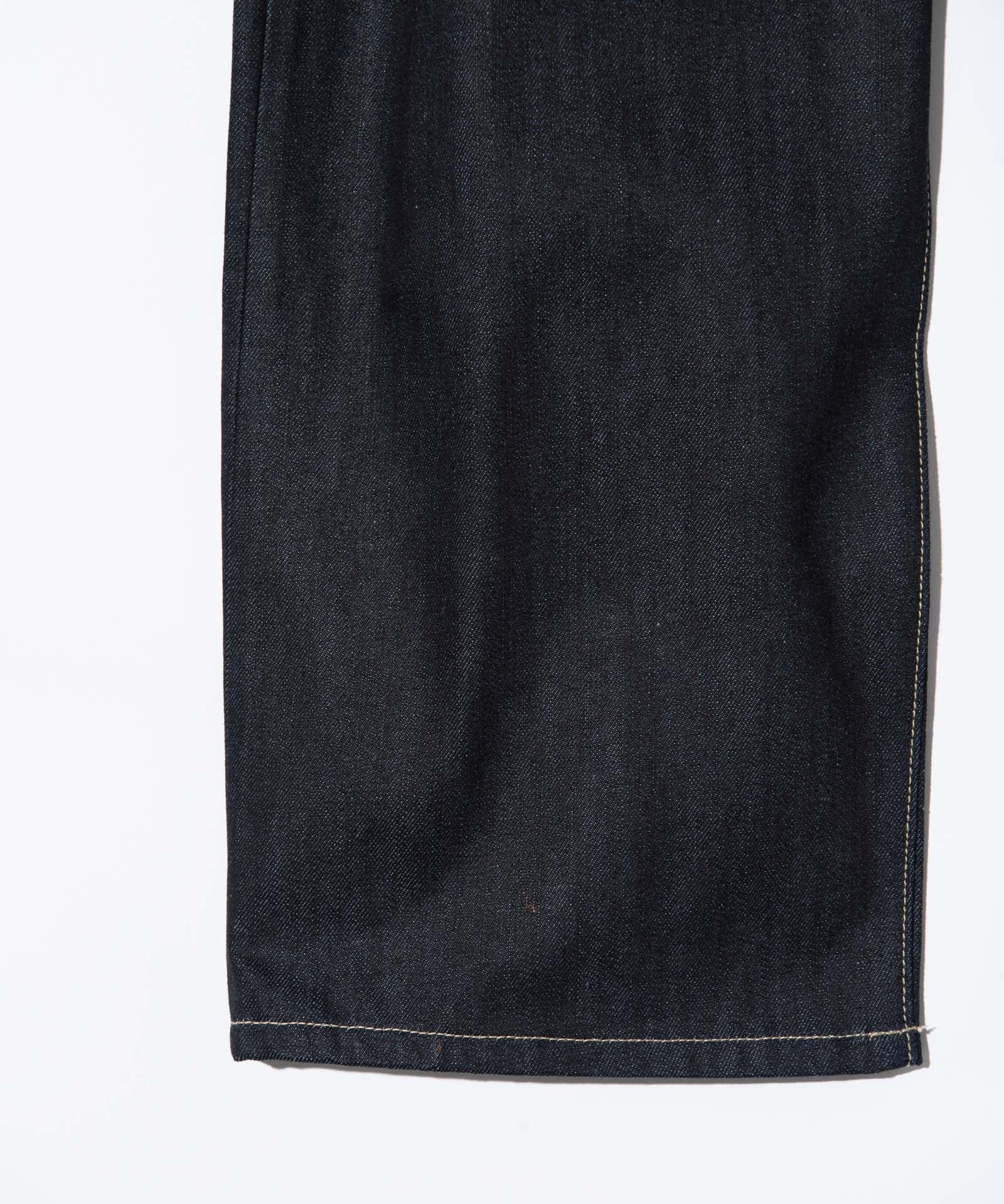 90‘sデニムスタイルを現代のストリートに再提案するBack Print Baggy Denim。シルエットはオーバーサイズボディの腰元を折りたたむ要領でタックを形成した、リメイク調のニュアンス溢れるもの。そこに東京ストリートカルチャーのエッセンスを色濃く漂わせるバックプリントをあしらいました。テキスタイルにはリジッドデニムを使用。穿き込むことで素材とプリントのそれぞれに刻まれていく経年変化をお楽しみください。