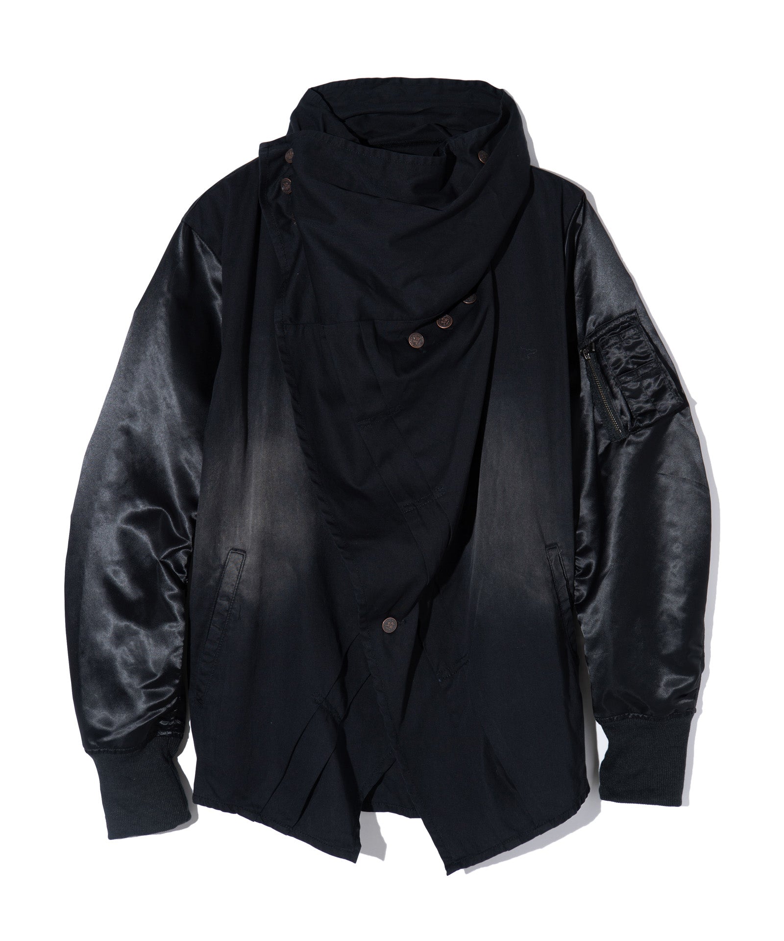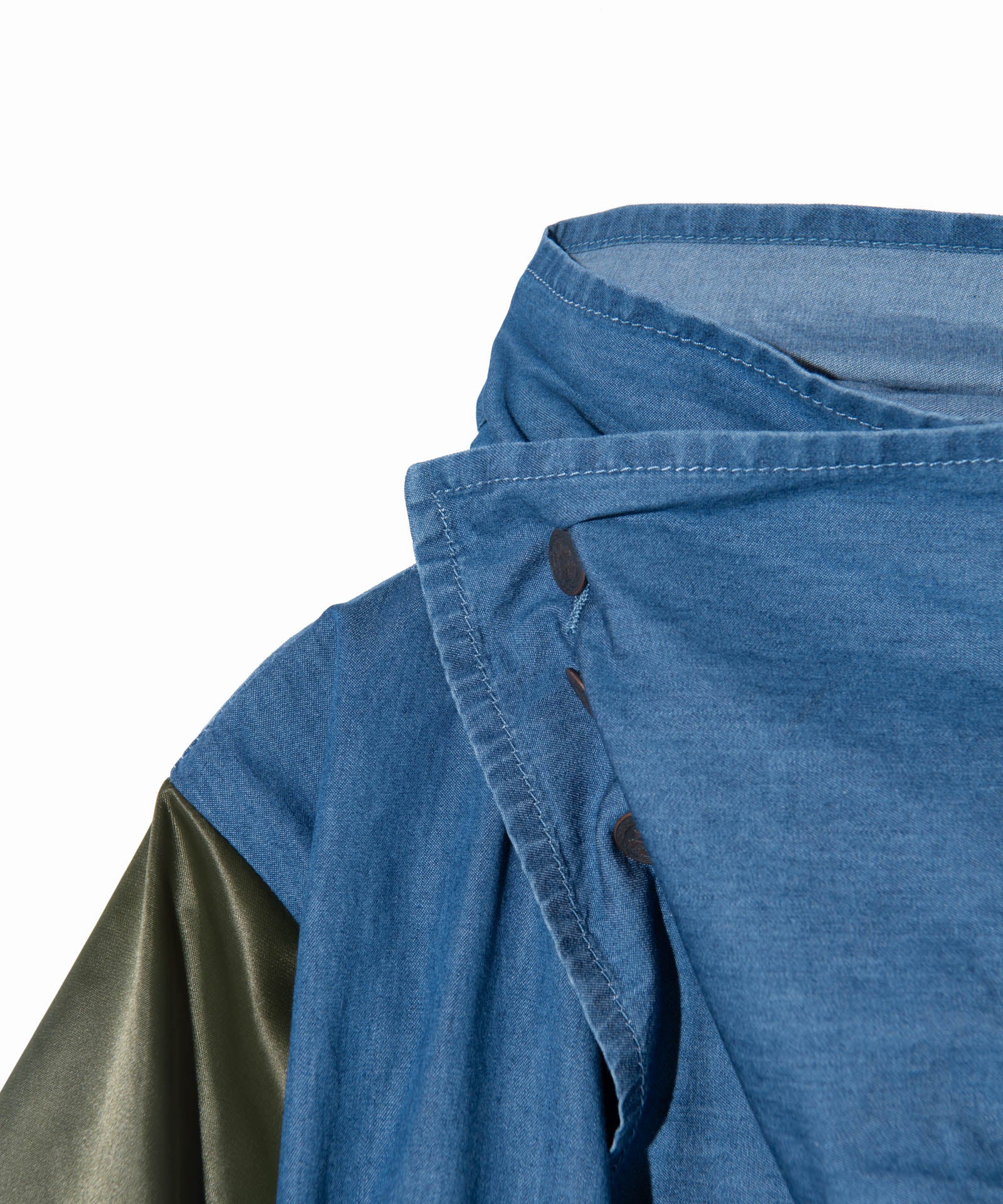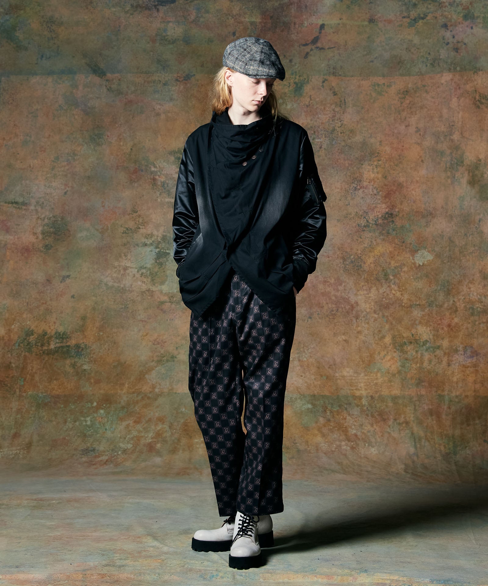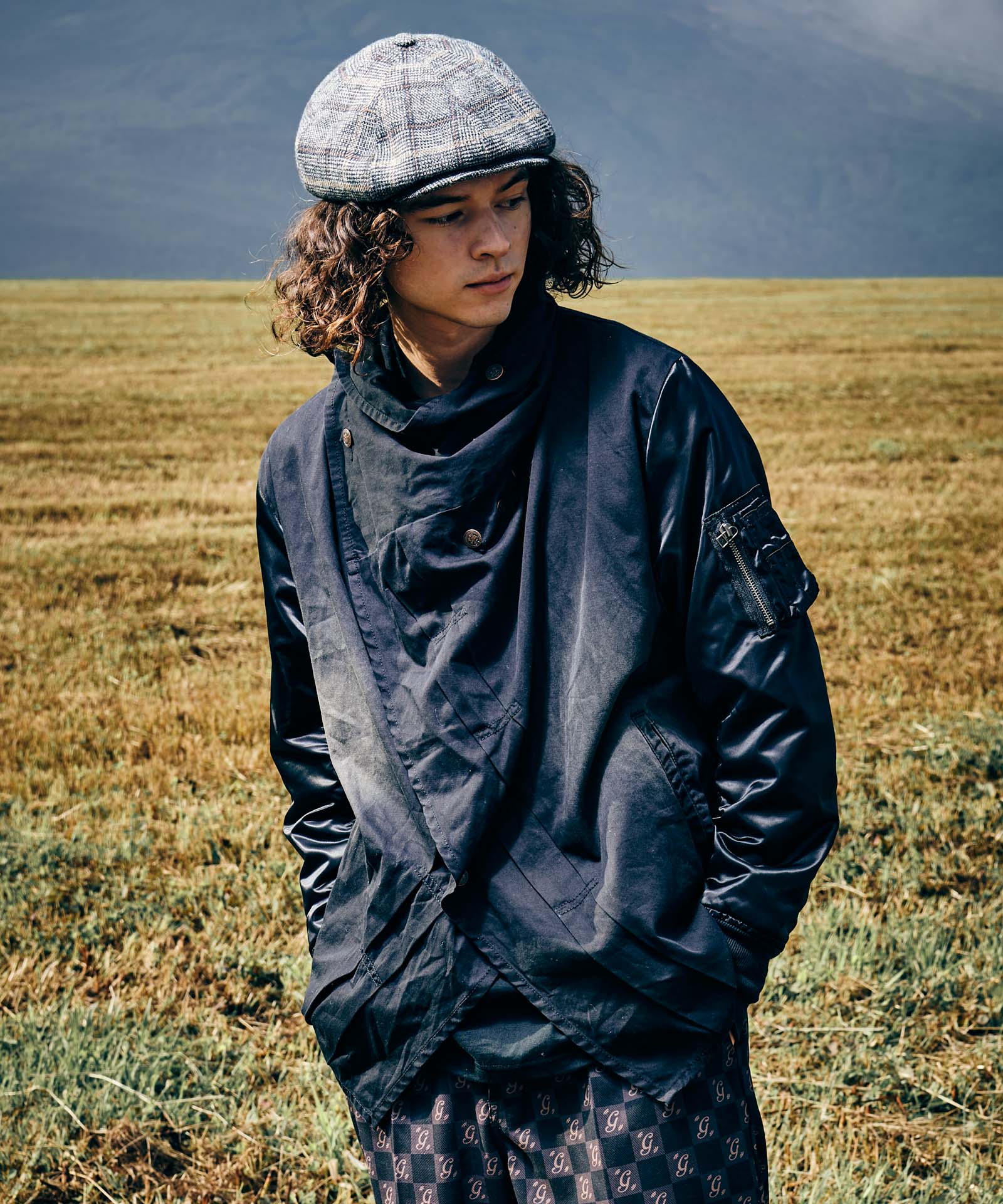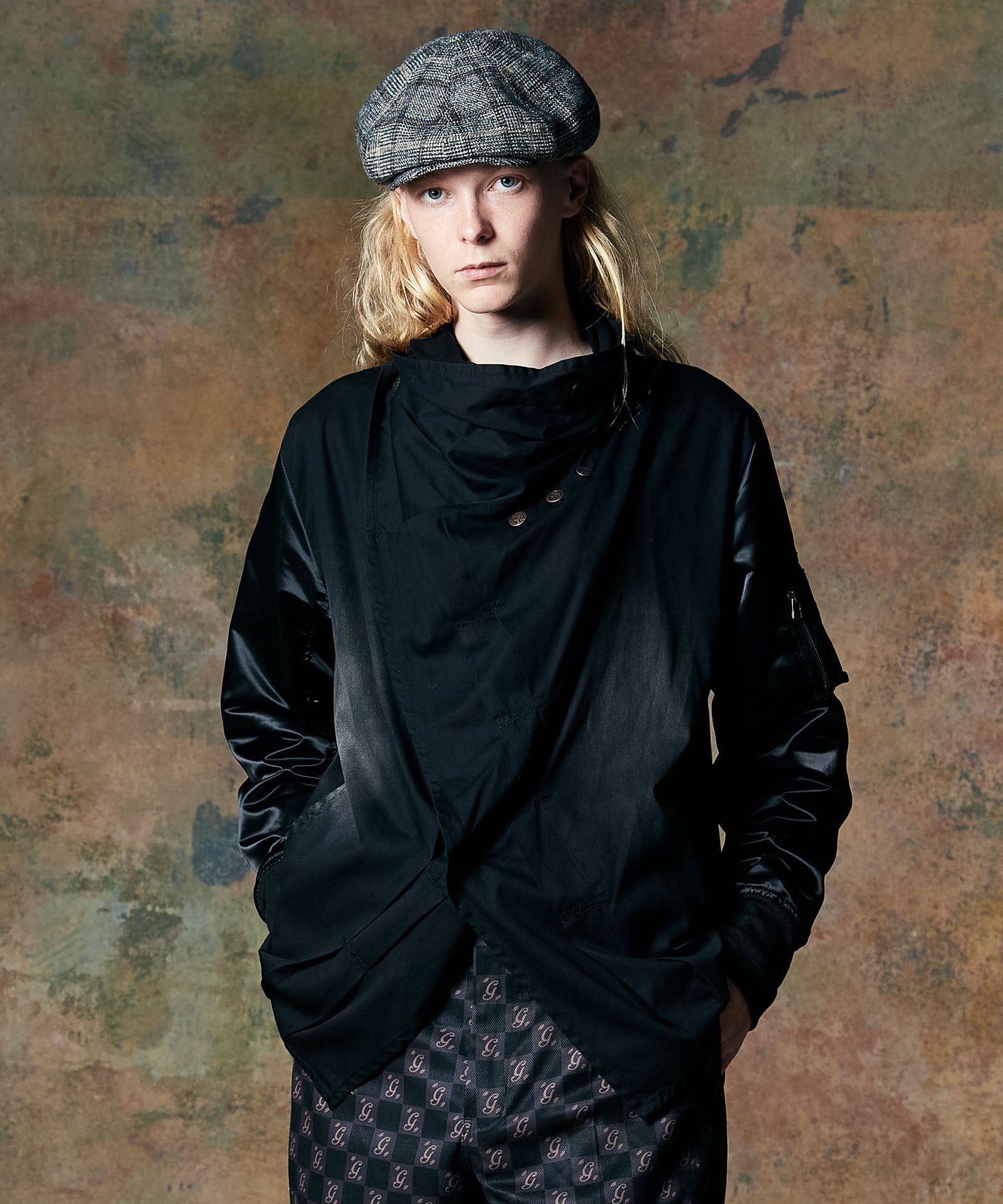 2010年代のglambを代表するシリーズであったMist Shirt。“Out of Society”をコレクションテーマにした今季、そのテーマ性を込めたリミックスとともに再登場。首回りに生まれるエアリーなドレープシルエットはブランドが調整を重ねた緻密なパターンワークによるもの。首元のボタンは設定通りに閉じるのみならず、敢えて段違いから始めるなど着用時のフィーリングでアレンジいただけます。さらに今季はアームをMA-1パーツに切り替え。マントとミリタリーウェアをレイヤードしたかのビジュアルは都市に生きるアウトサイダーという今回のコレクションのムードを色濃く反映したものとなっております。