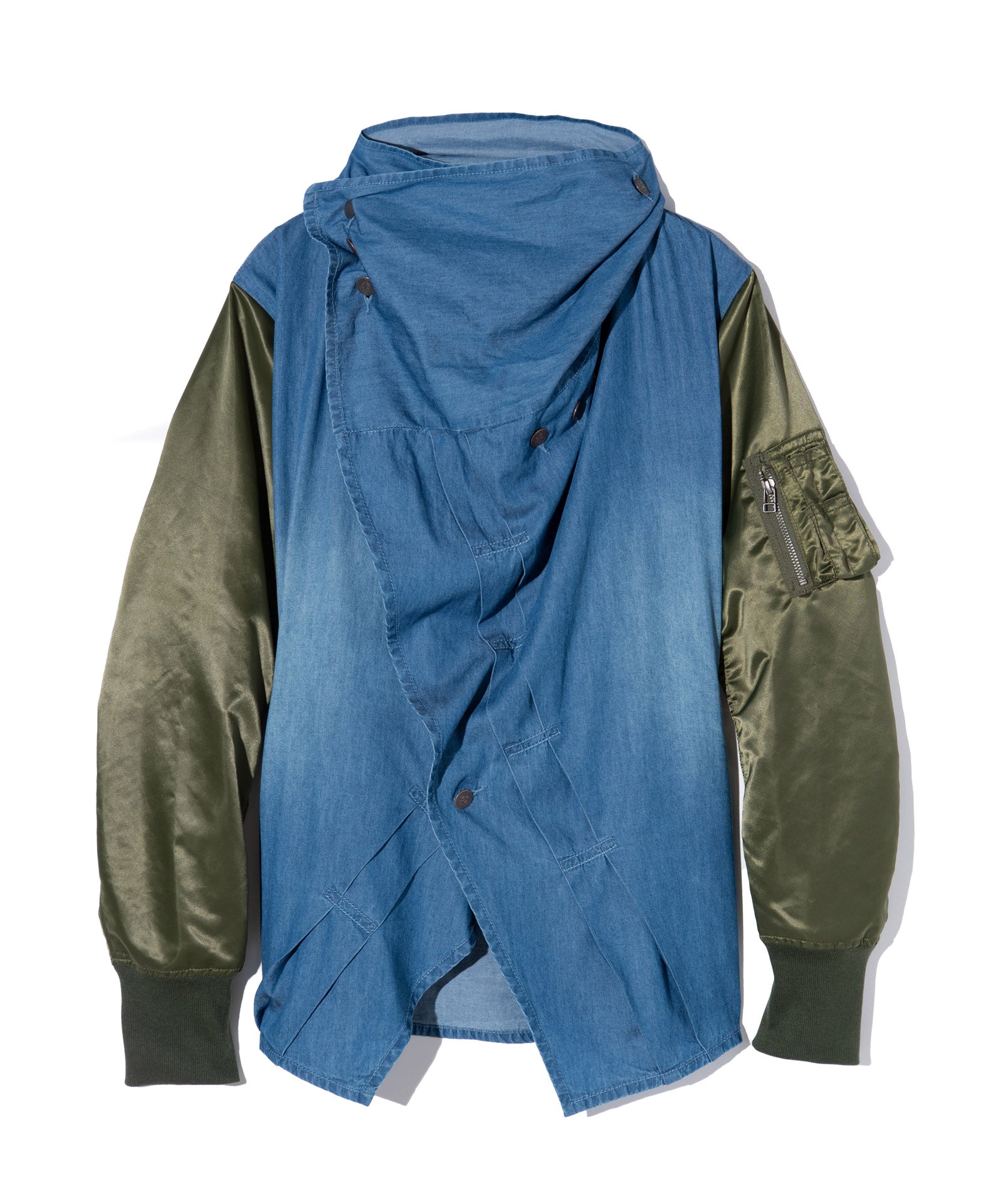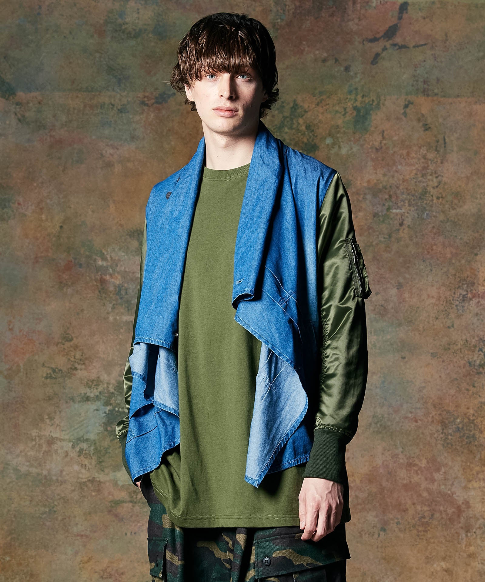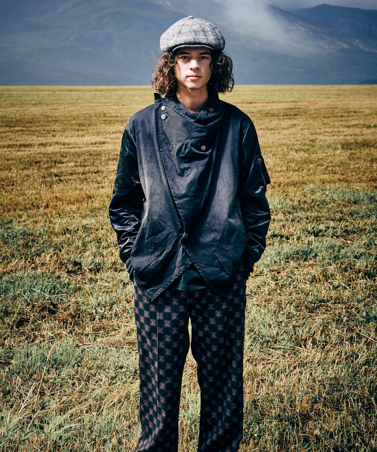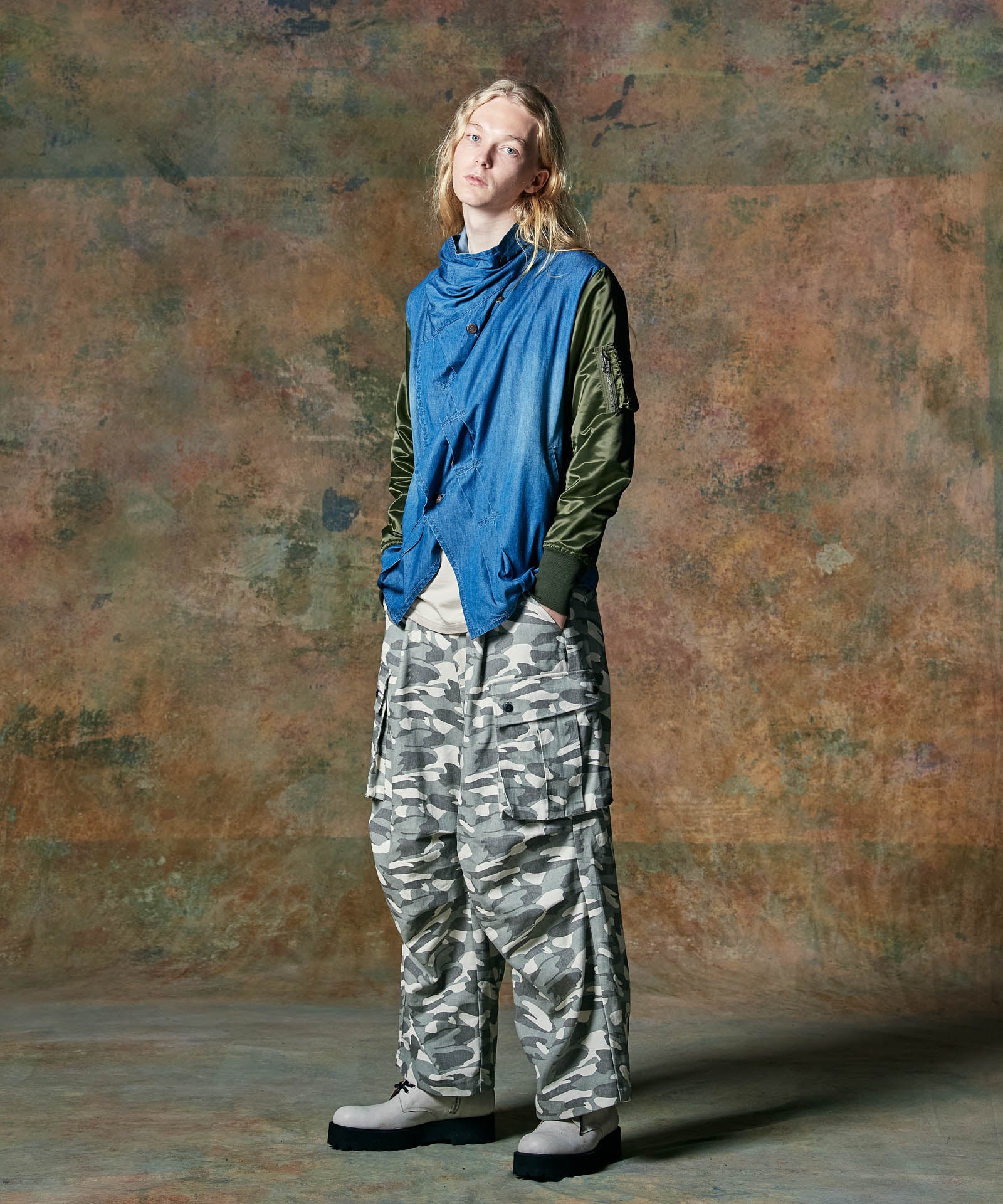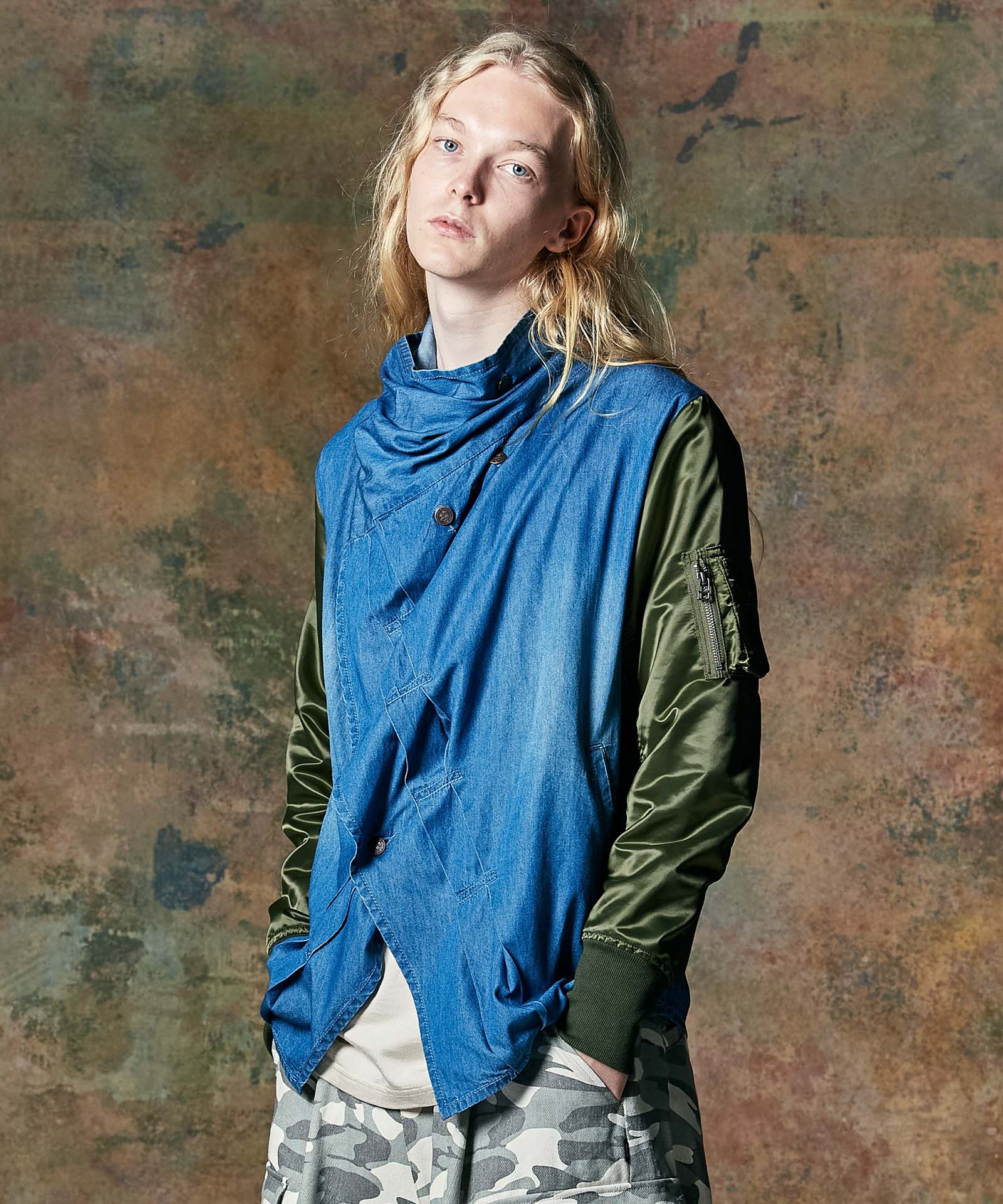 2010年代のglambを代表するシリーズであったMist Shirt。“Out of Society”をコレクションテーマにした今季、そのテーマ性を込めたリミックスとともに再登場。首回りに生まれるエアリーなドレープシルエットはブランドが調整を重ねた緻密なパターンワークによるもの。首元のボタンは設定通りに閉じるのみならず、敢えて段違いから始めるなど着用時のフィーリングでアレンジいただけます。さらに今季はアームをMA-1パーツに切り替え。マントとミリタリーウェアをレイヤードしたかのビジュアルは都市に生きるアウトサイダーという今回のコレクションのムードを色濃く反映したものとなっております。