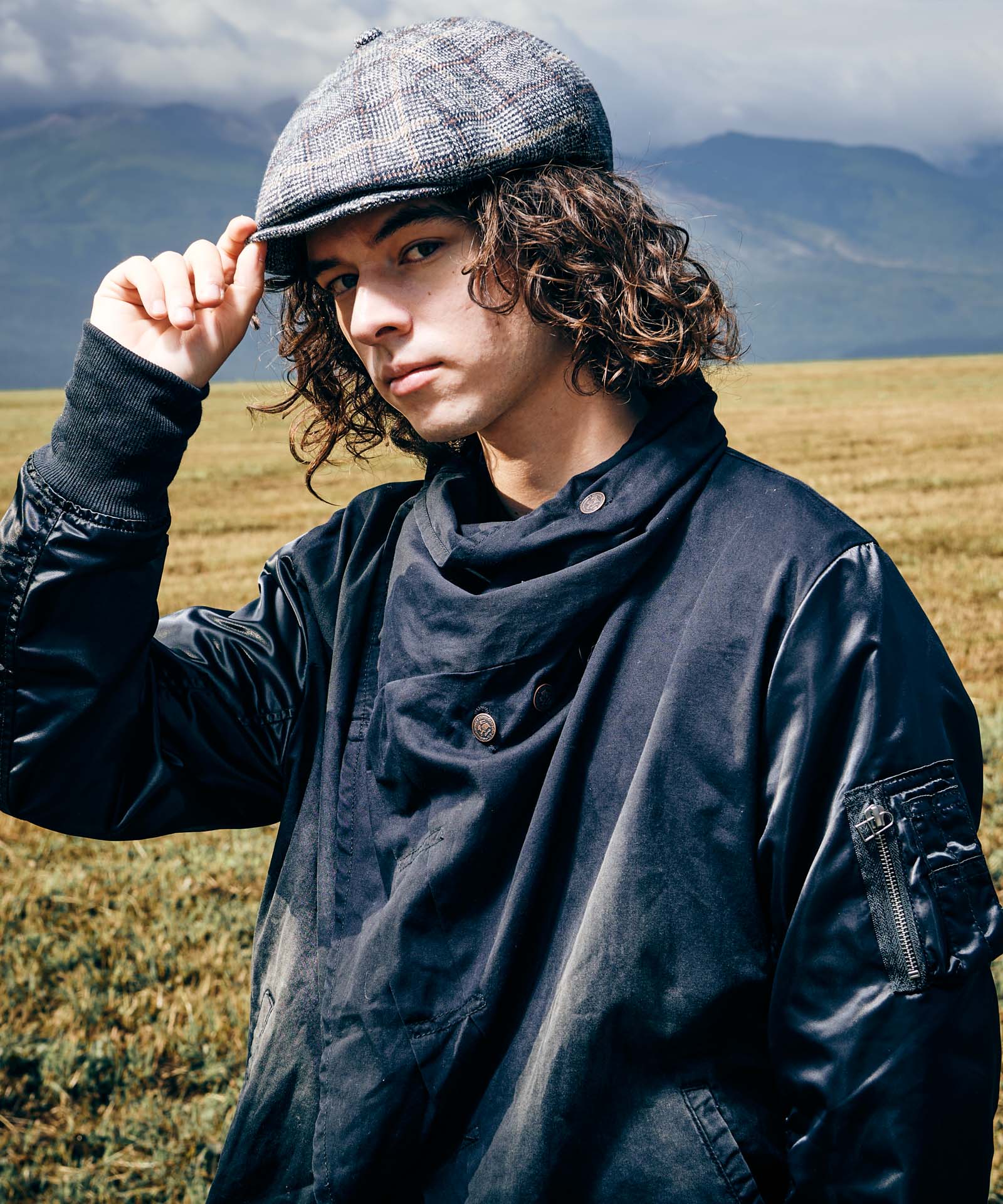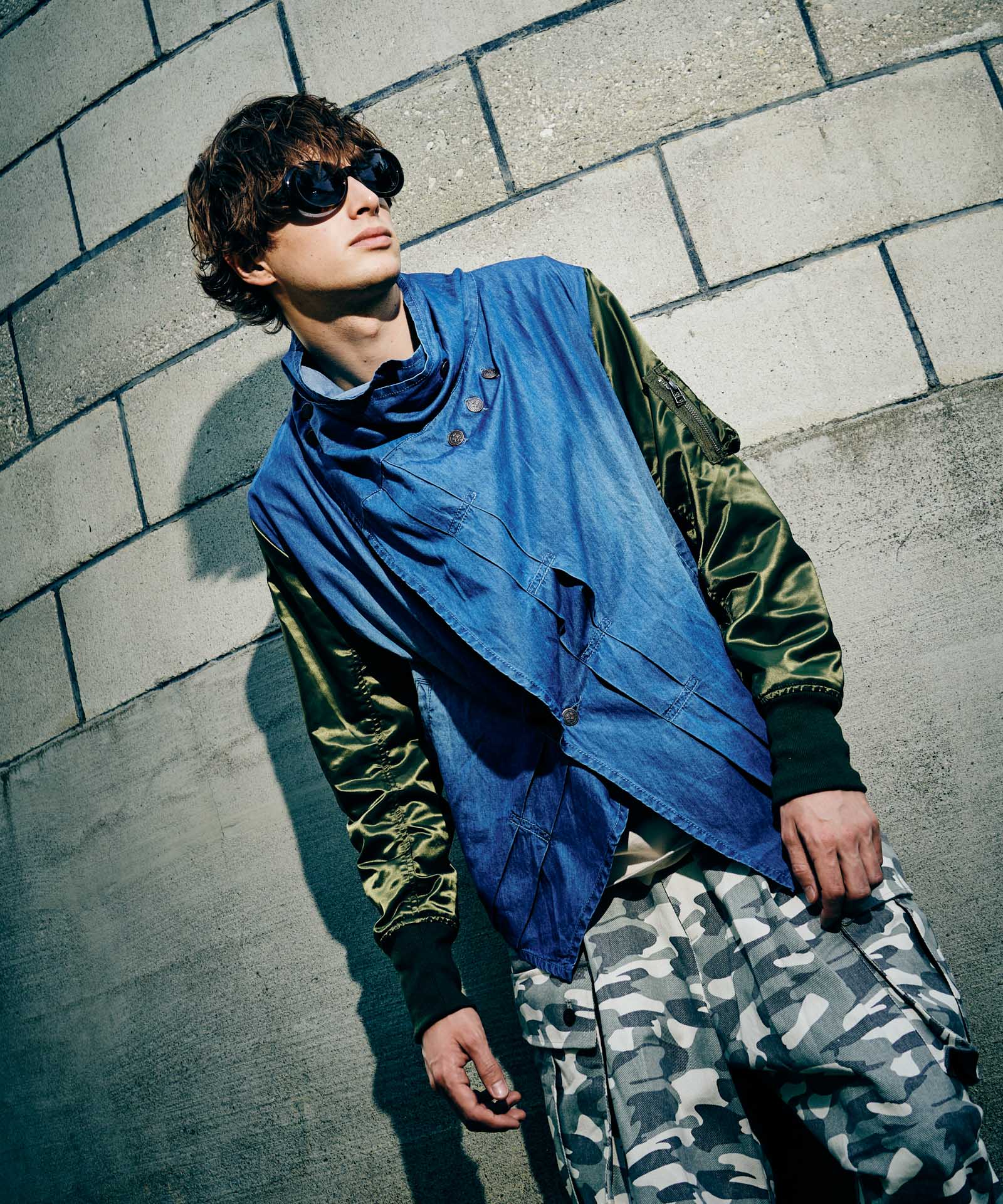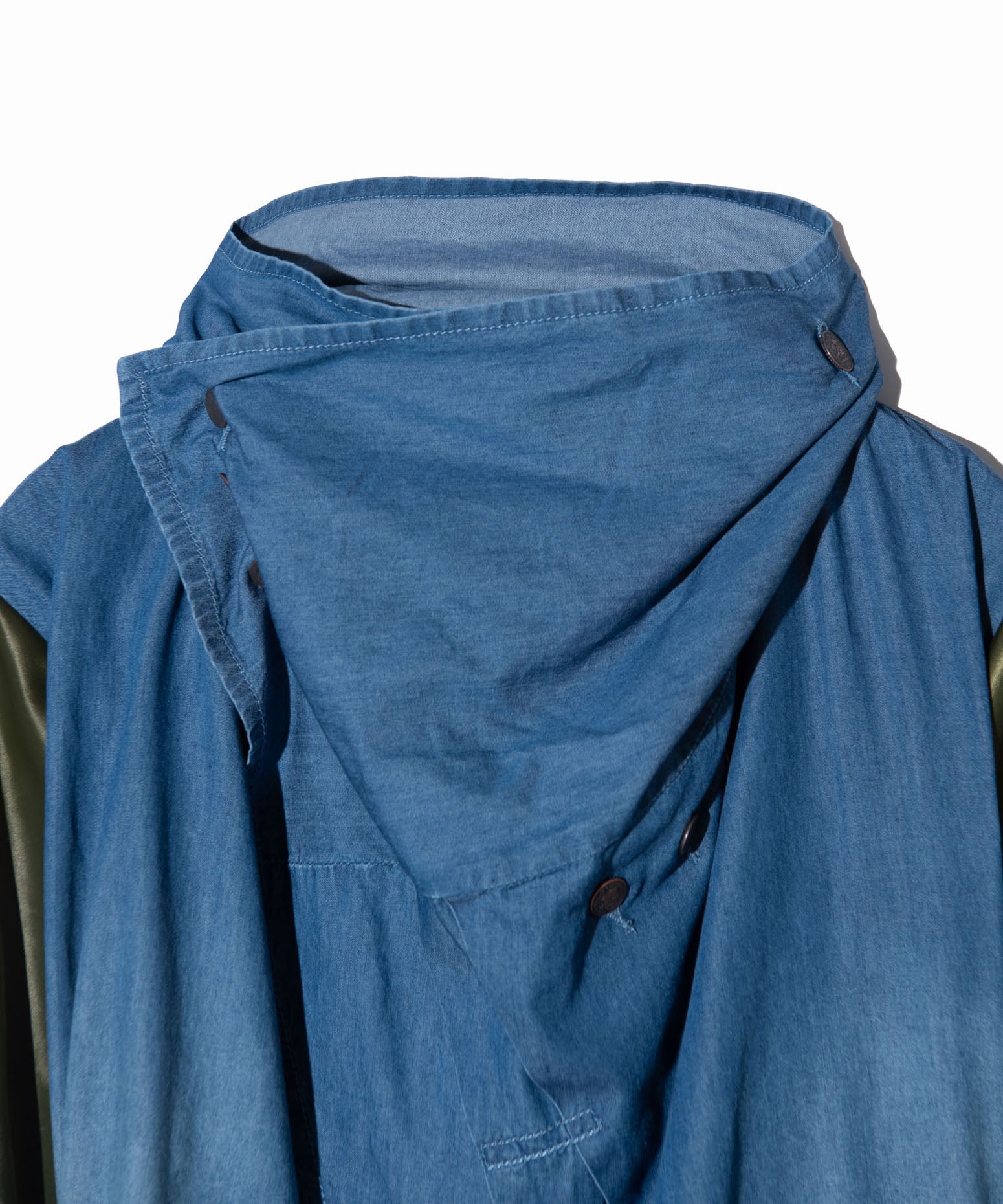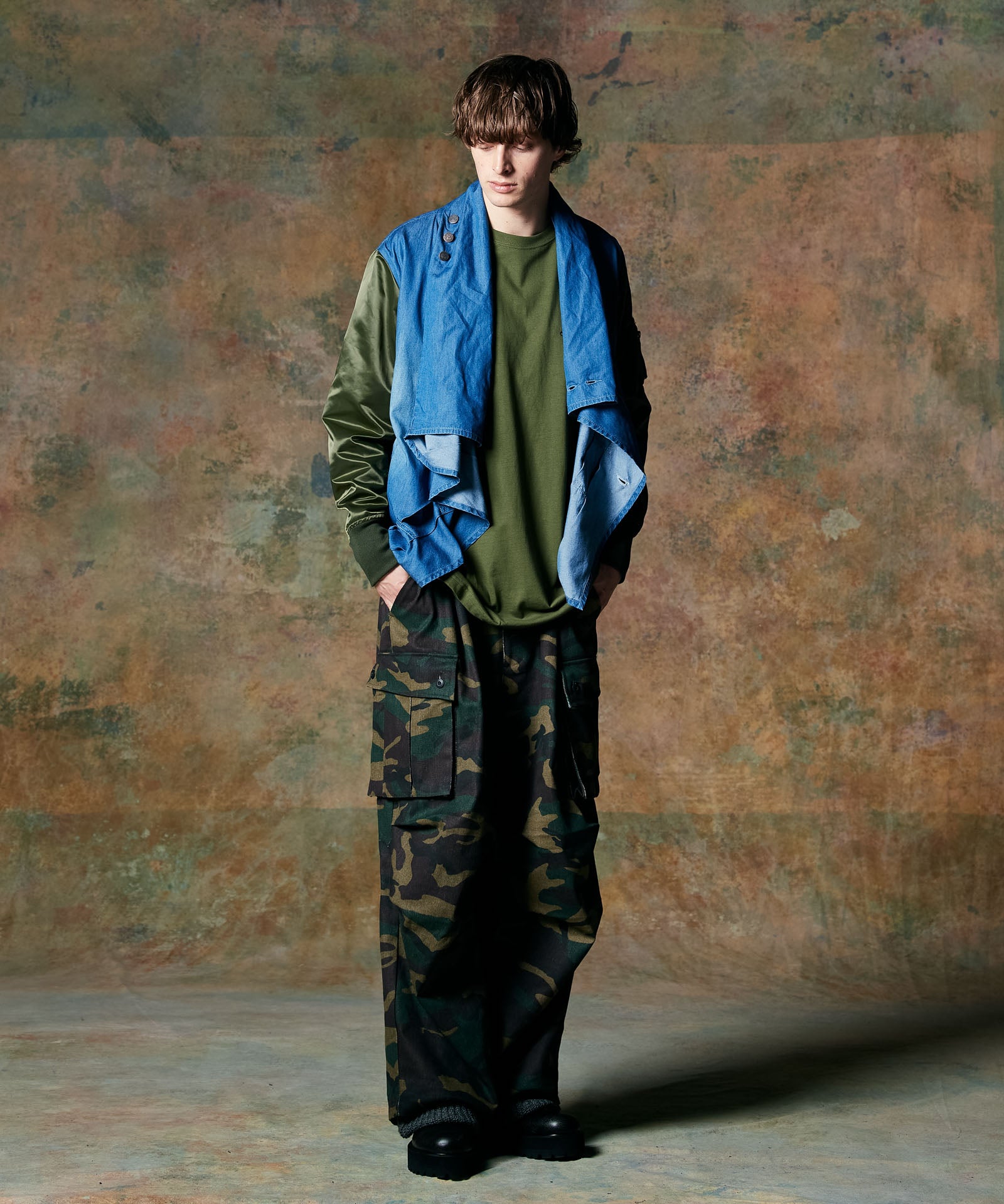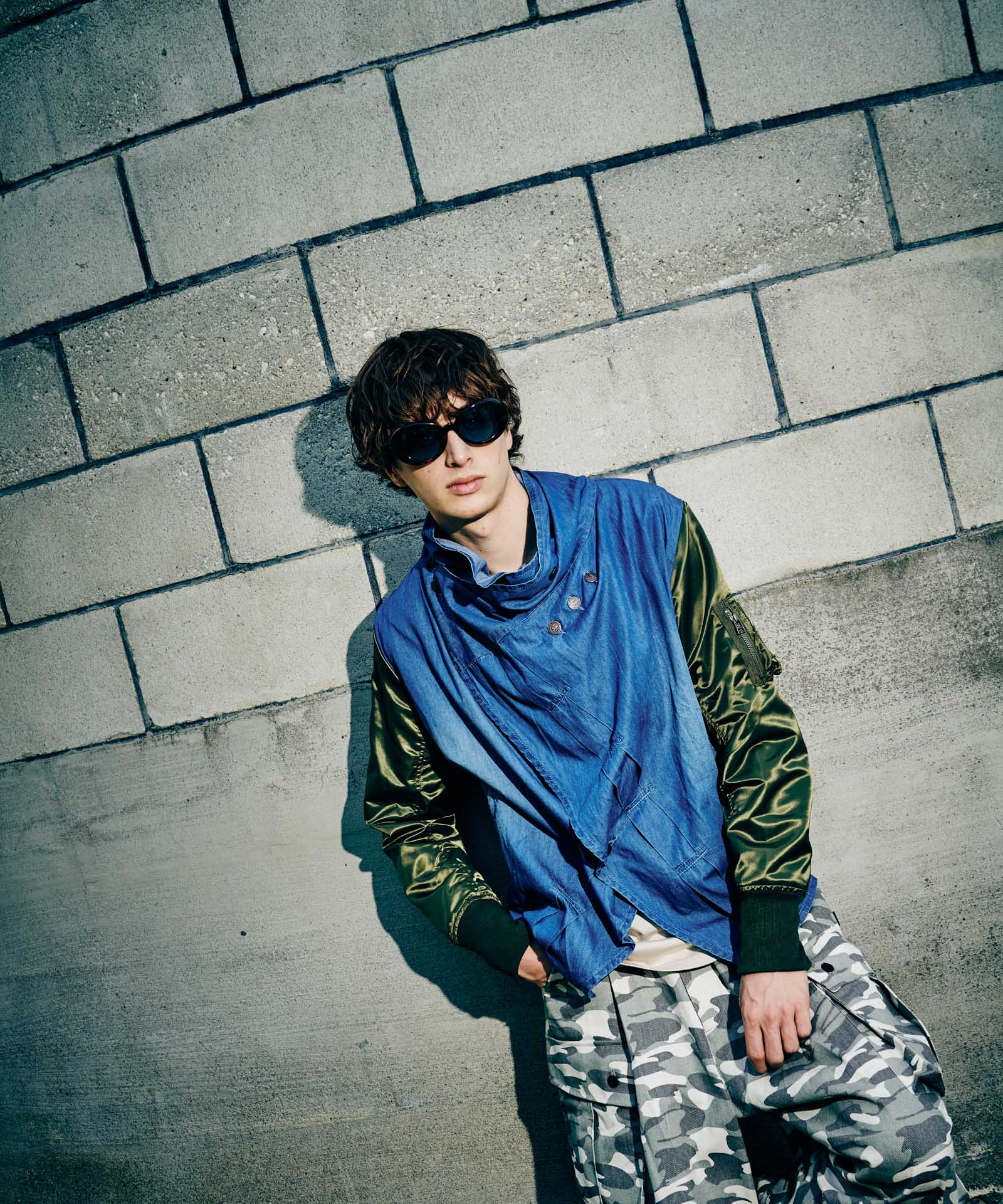 2010年代のglambを代表するシリーズであったMist Shirt。“Out of Society”をコレクションテーマにした今季、そのテーマ性を込めたリミックスとともに再登場。首回りに生まれるエアリーなドレープシルエットはブランドが調整を重ねた緻密なパターンワークによるもの。首元のボタンは設定通りに閉じるのみならず、敢えて段違いから始めるなど着用時のフィーリングでアレンジいただけます。さらに今季はアームをMA-1パーツに切り替え。マントとミリタリーウェアをレイヤードしたかのビジュアルは都市に生きるアウトサイダーという今回のコレクションのムードを色濃く反映したものとなっております。