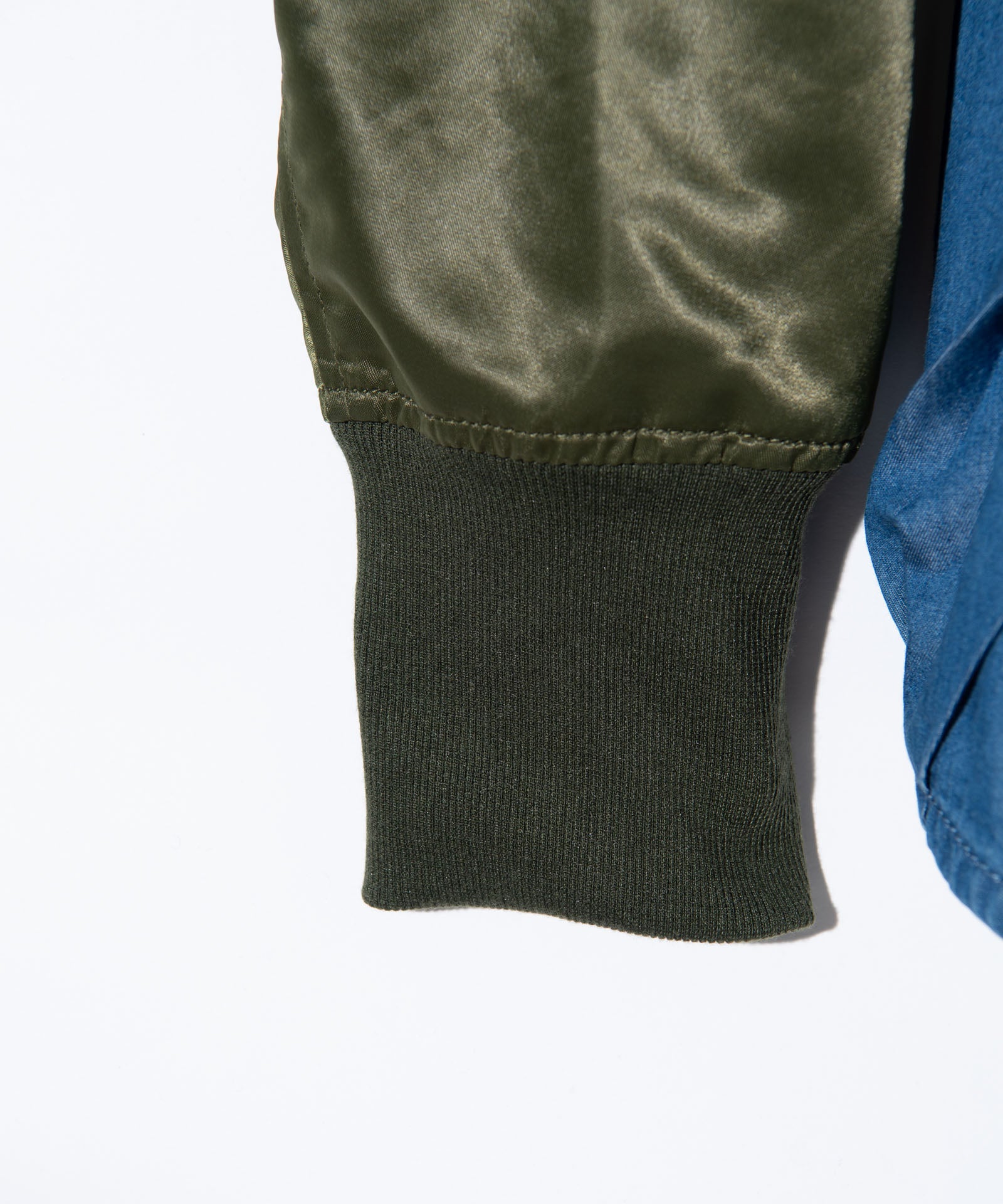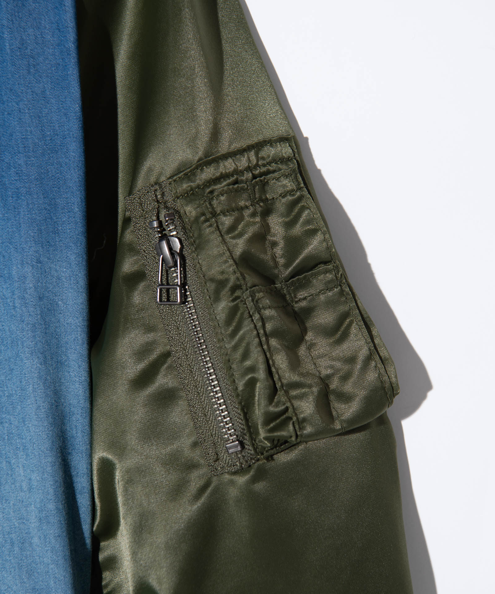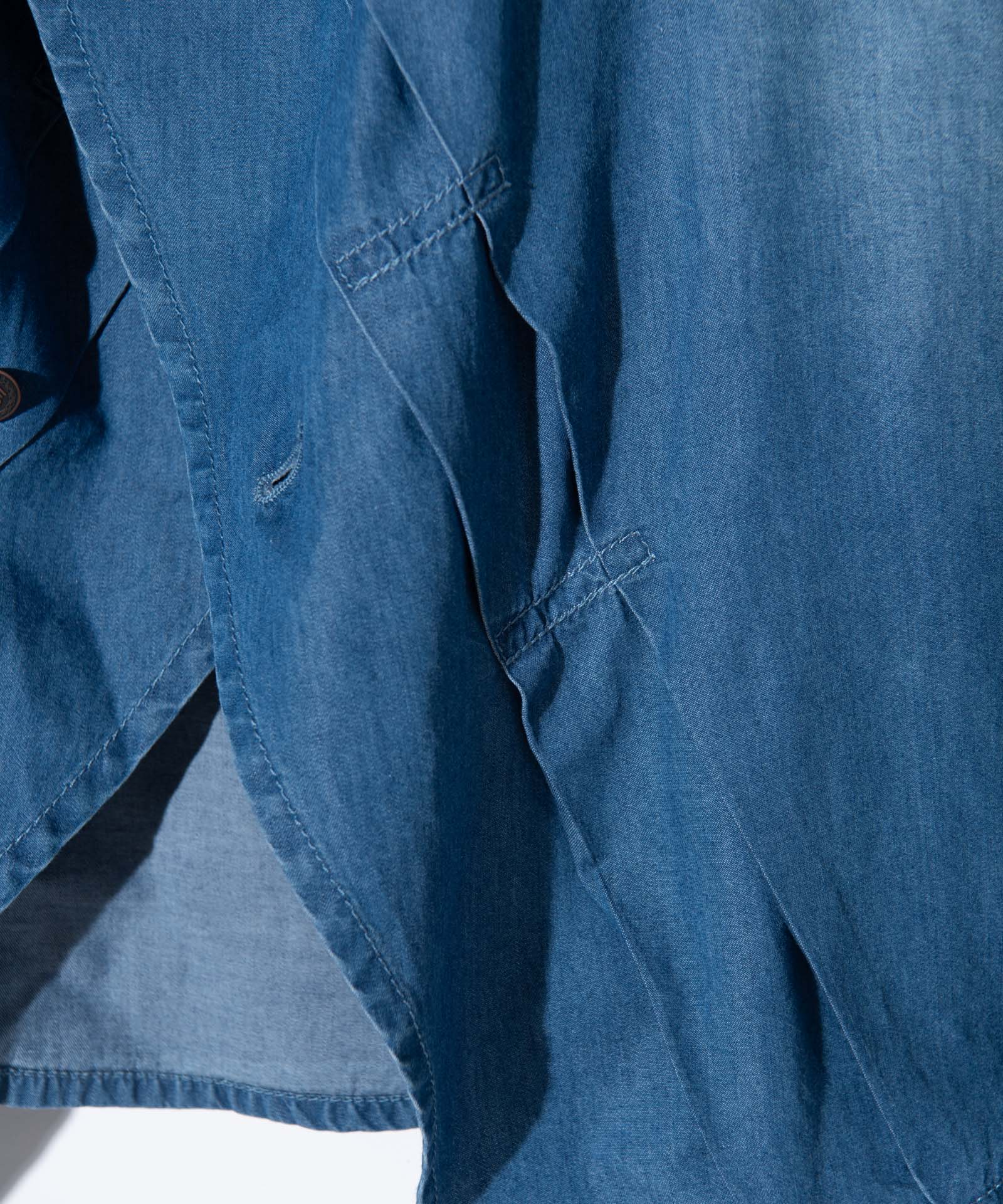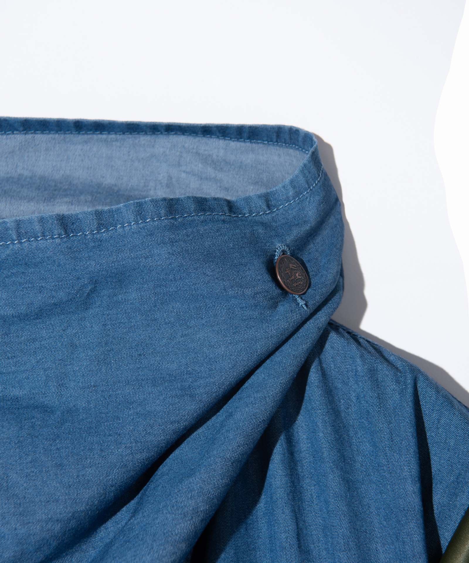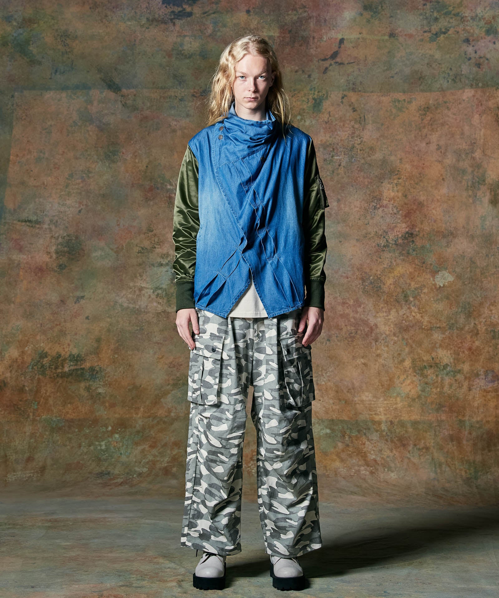 2010年代のglambを代表するシリーズであったMist Shirt。“Out of Society”をコレクションテーマにした今季、そのテーマ性を込めたリミックスとともに再登場。首回りに生まれるエアリーなドレープシルエットはブランドが調整を重ねた緻密なパターンワークによるもの。首元のボタンは設定通りに閉じるのみならず、敢えて段違いから始めるなど着用時のフィーリングでアレンジいただけます。さらに今季はアームをMA-1パーツに切り替え。マントとミリタリーウェアをレイヤードしたかのビジュアルは都市に生きるアウトサイダーという今回のコレクションのムードを色濃く反映したものとなっております。