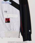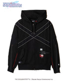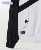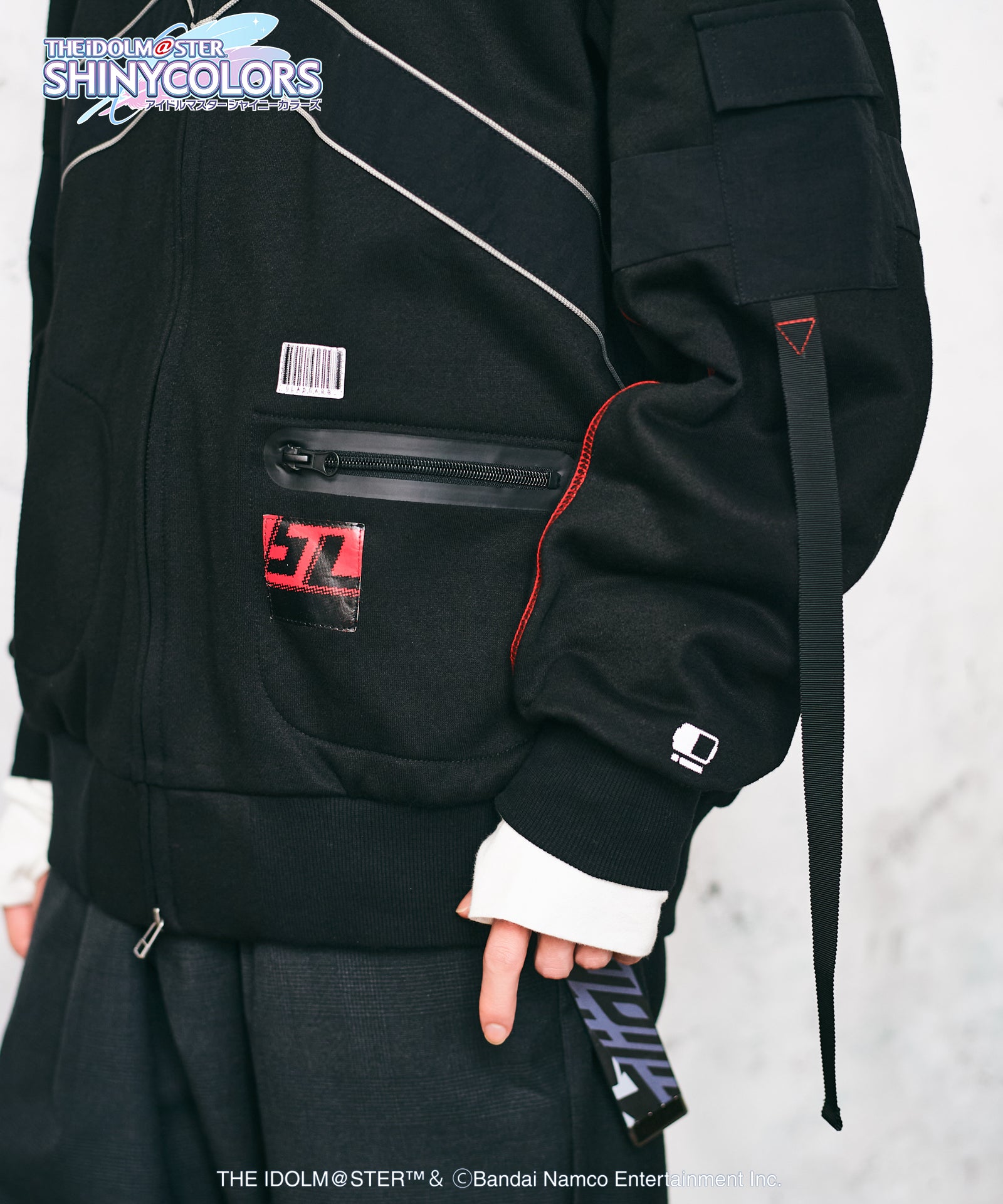 テックウェア調のモチーフを洋服作りに落とし込むにあたり、gladgarbが提案するのはミリタリーとアウトドアのミックス。ボディ前後にわたるクロスはUSアーミーのフィットネスジャケットをイメージ、ポケットはナイロン調のフラップを叩きつけたり止水ファスナー調のジップをあしらったりと、タフなムードを持たせています。左身頃に配したgladgarbバーコードやユニットロゴは敢えて目を粗くすることでストリートな印象に。ストリートウェアの技法を駆使しながらも首元のハトメを片側のみレッドにしたり、腕のポケットの下に続くテープパーツを三角ステッチで留めたりと、オリジナル衣装のデザインも細部に至るまでしっかりとすくい上げています。