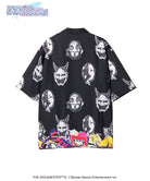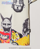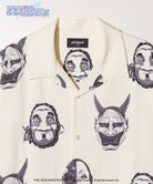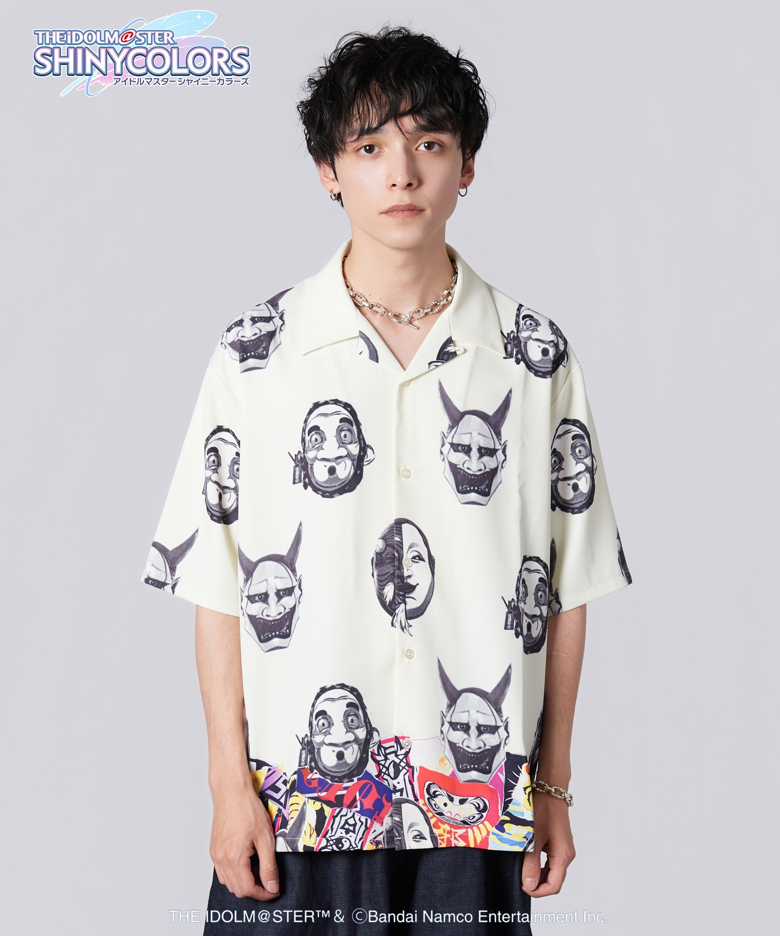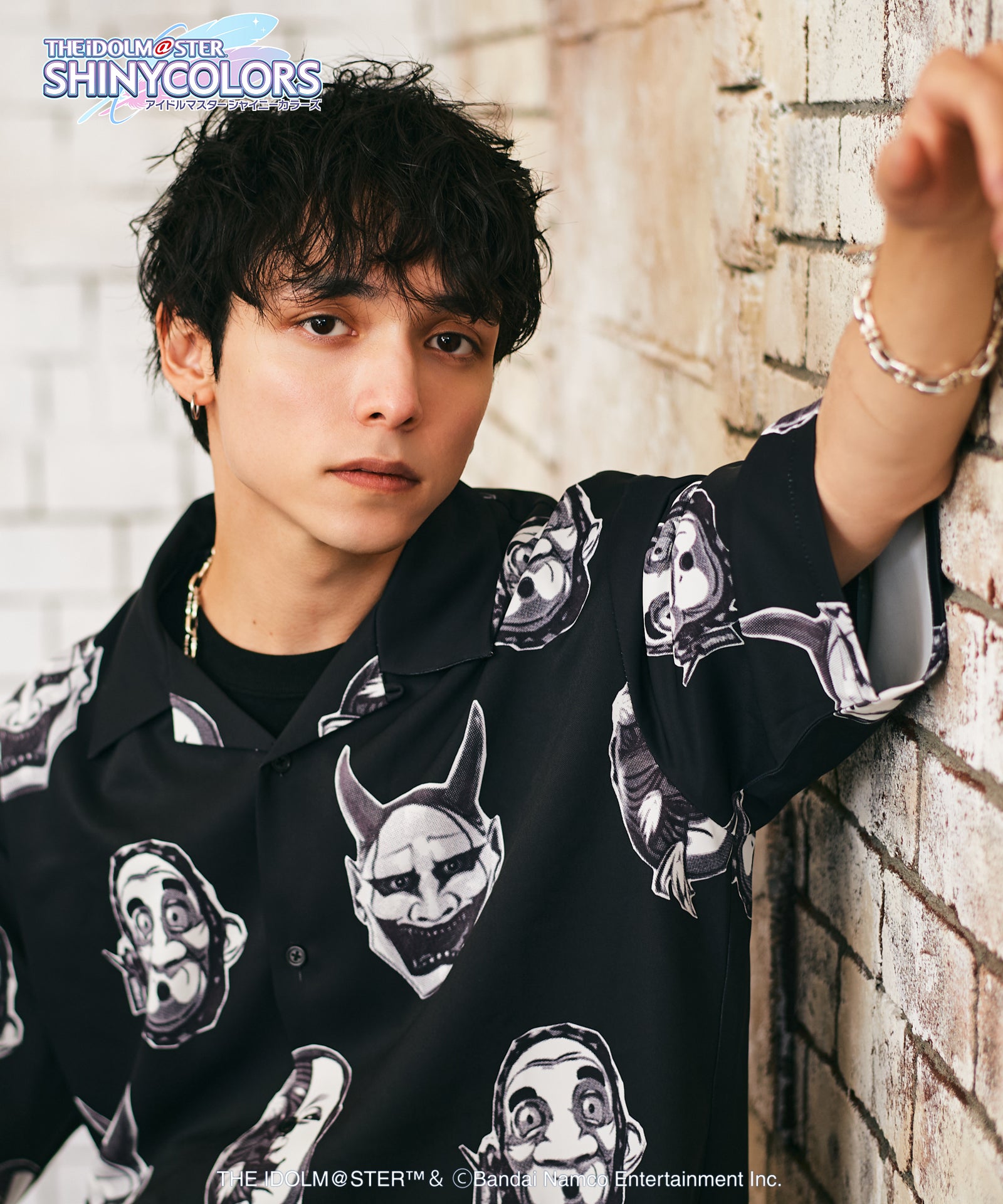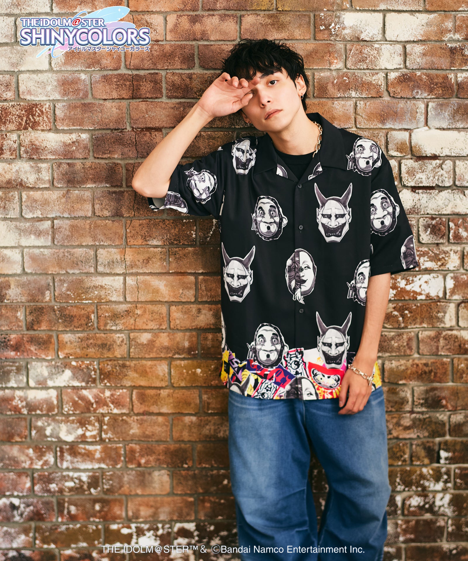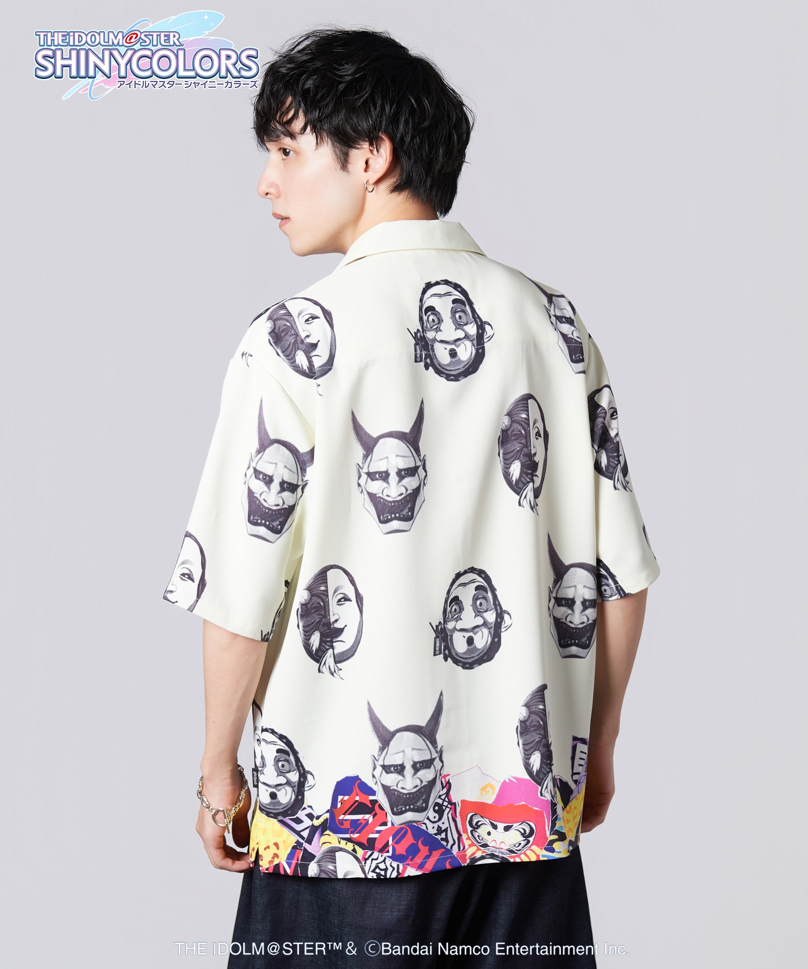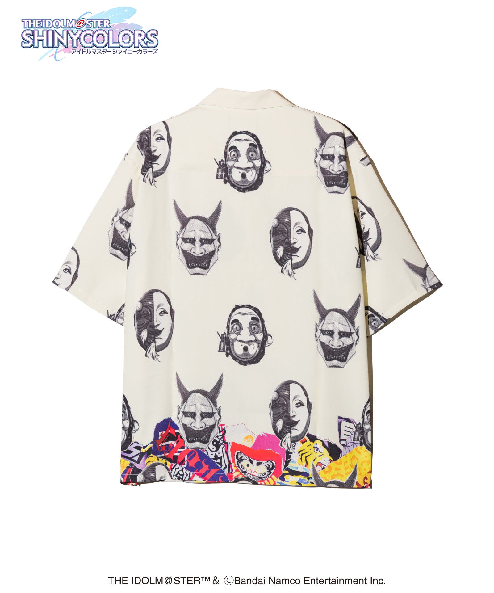 ルードなオープンカラーボディに総柄であしらったのは3人がそれぞれ着用するお面。ホリゾンタルパターンが反映された裾部分には衣装に用いられている柄を散りばめており、紙をちぎったような質感を加えることでコラージュアートの面持ちに仕上げました。