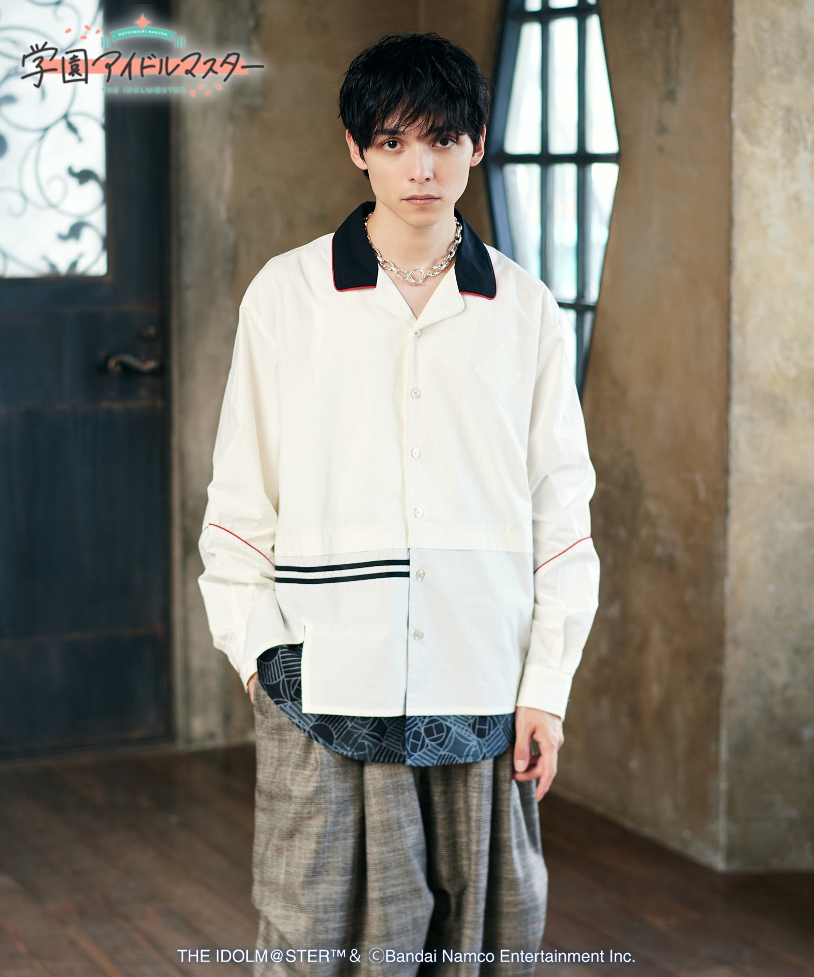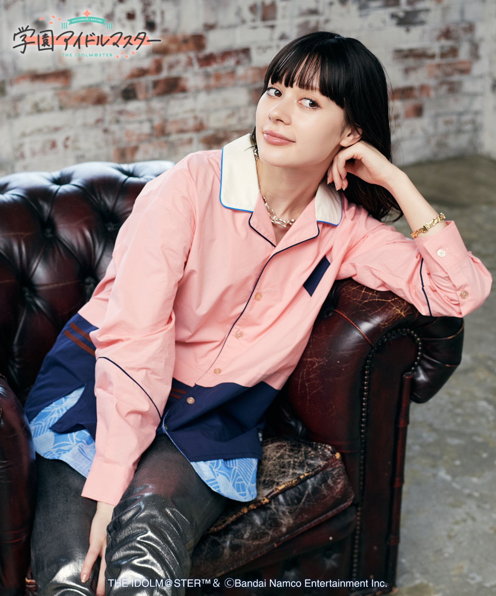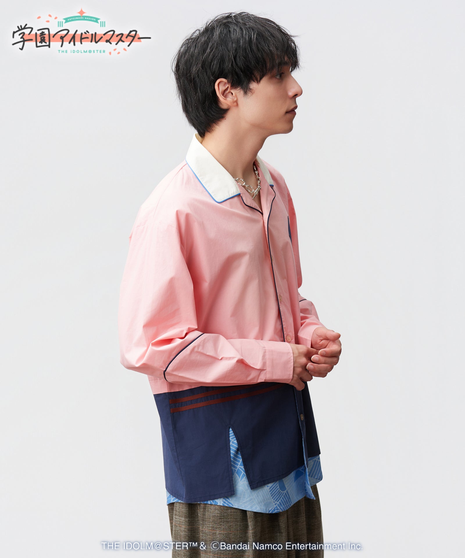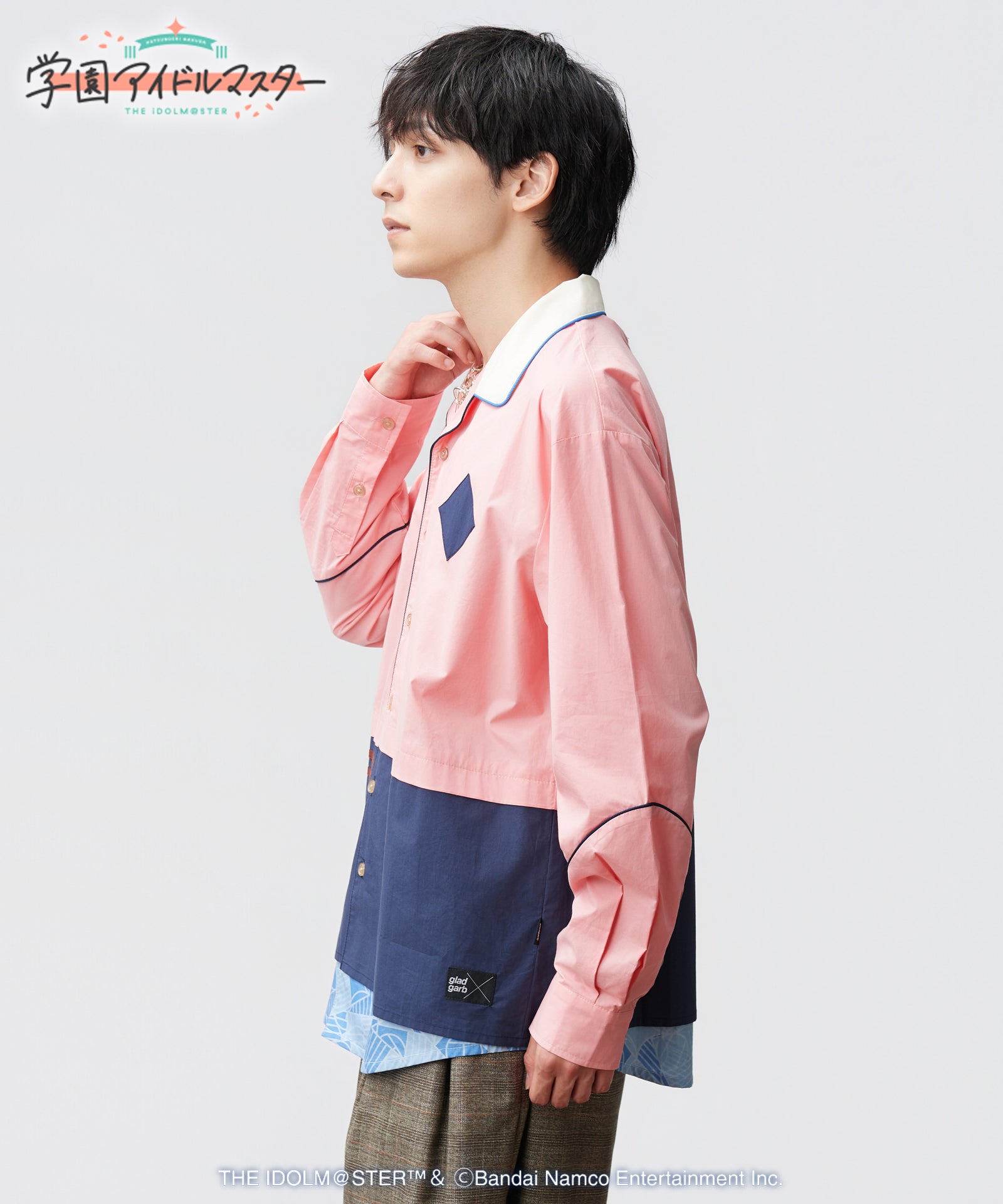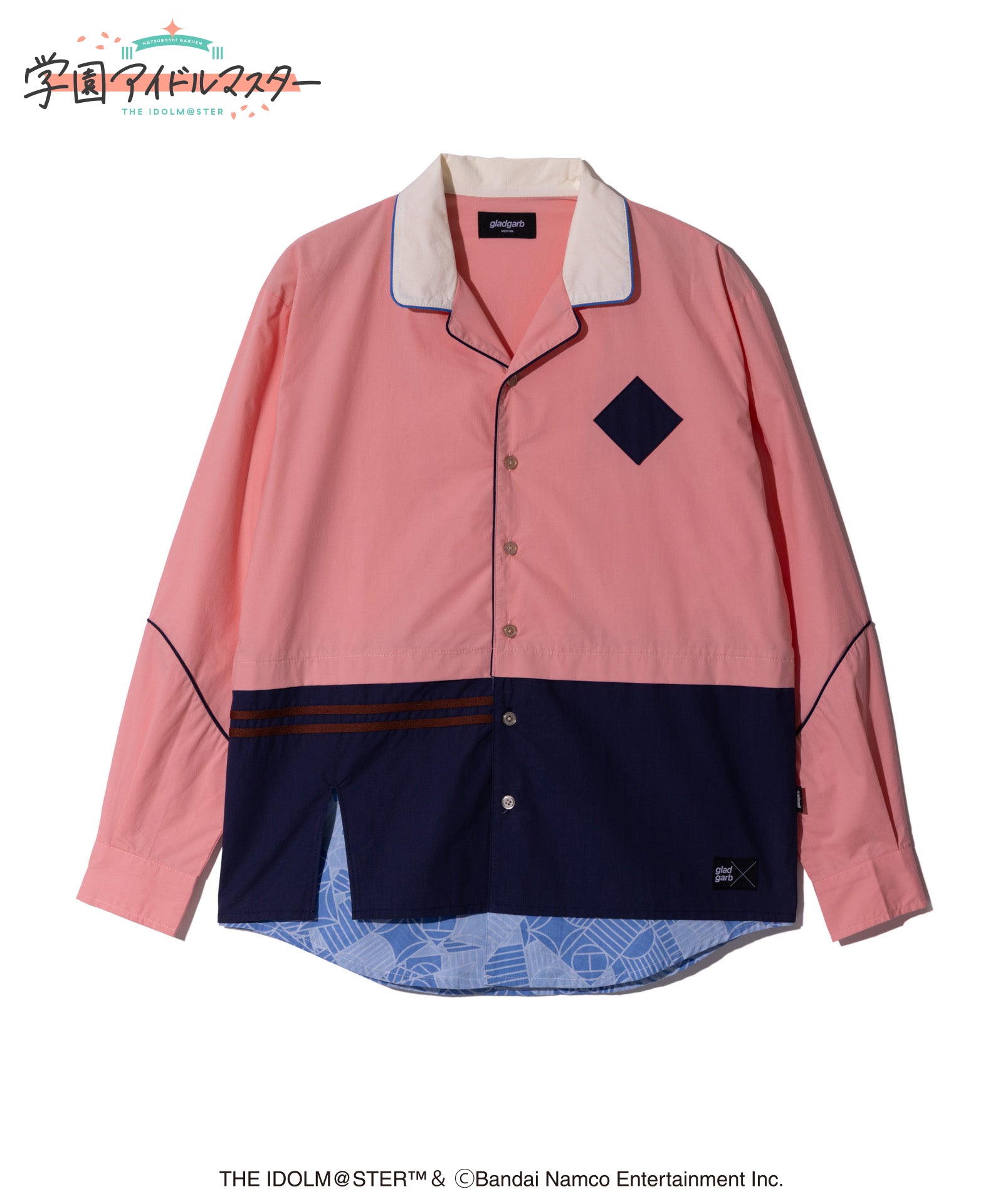 gladgarbと『学園アイドルマスター』がコラボレーション。花海咲季のベーシックコスチュームを1枚のシャツへと再構築したSaki Shirt。上下で切り替えたボディは、トップスを表現した部分にパイピングをあしらってボウリングシャツを思わせるストリートなムードに。ワッペンを模したパーツは敢えて無地であしらうことでモードな印象を持たせています。フェイクレイヤードしたスカート部分には初星学園の校章をアレンジした柄を散りばめて、作品へのリスペクトを込めました。シルエットは着丈長め、身幅広めのビッグシルエット。2つのカラーバリエーションはPinkはオリジナルの配色、WhiteはSaki Blousonと合わせることで楽曲『初』における花海咲季の着こなしを再現するものとなっております。