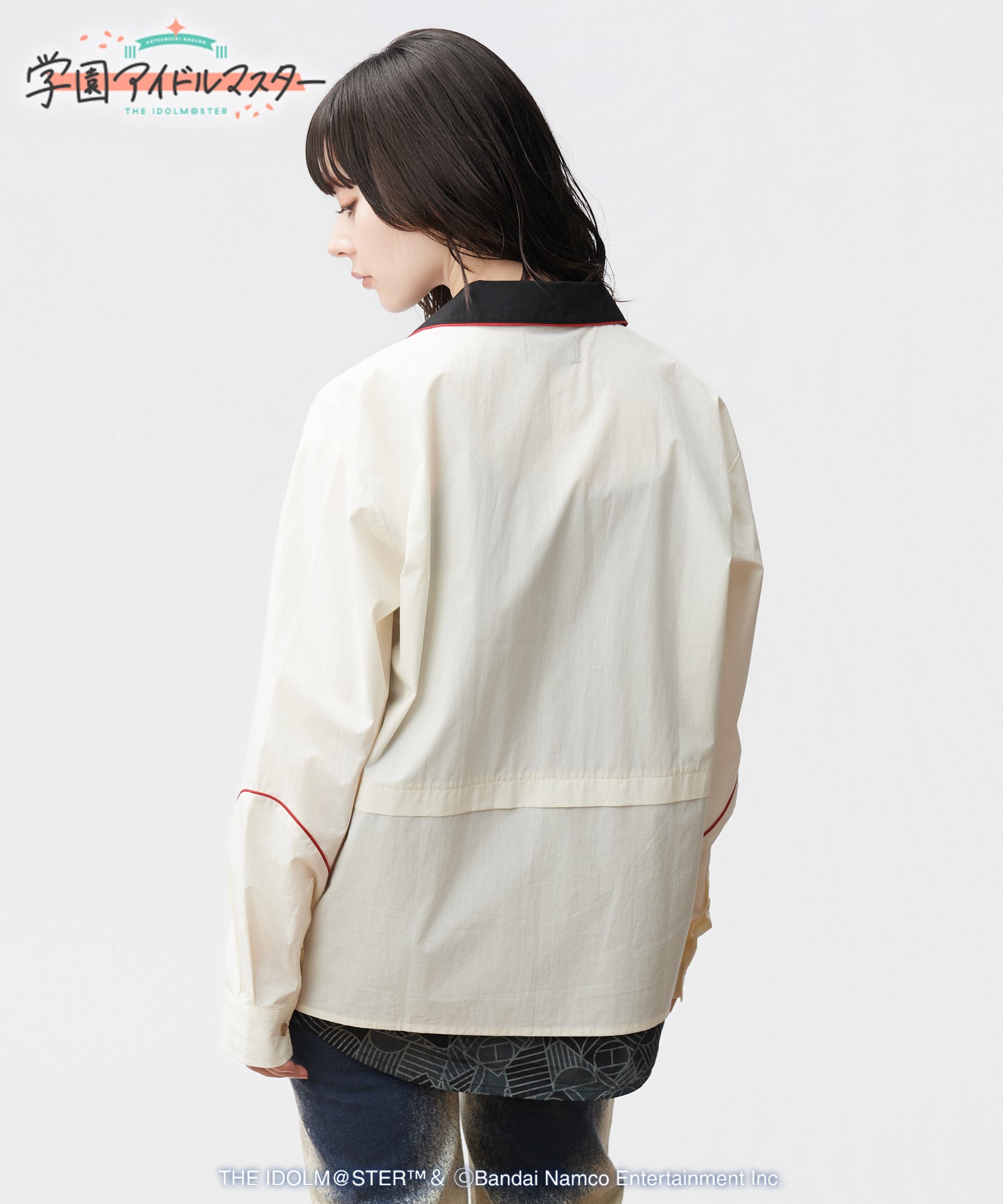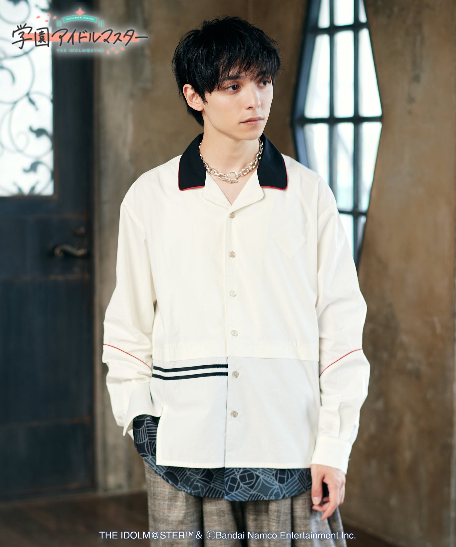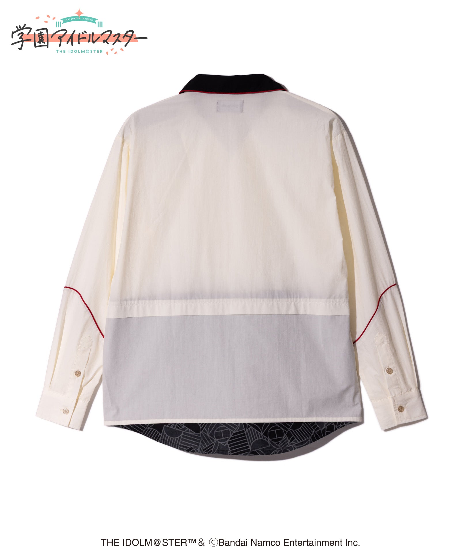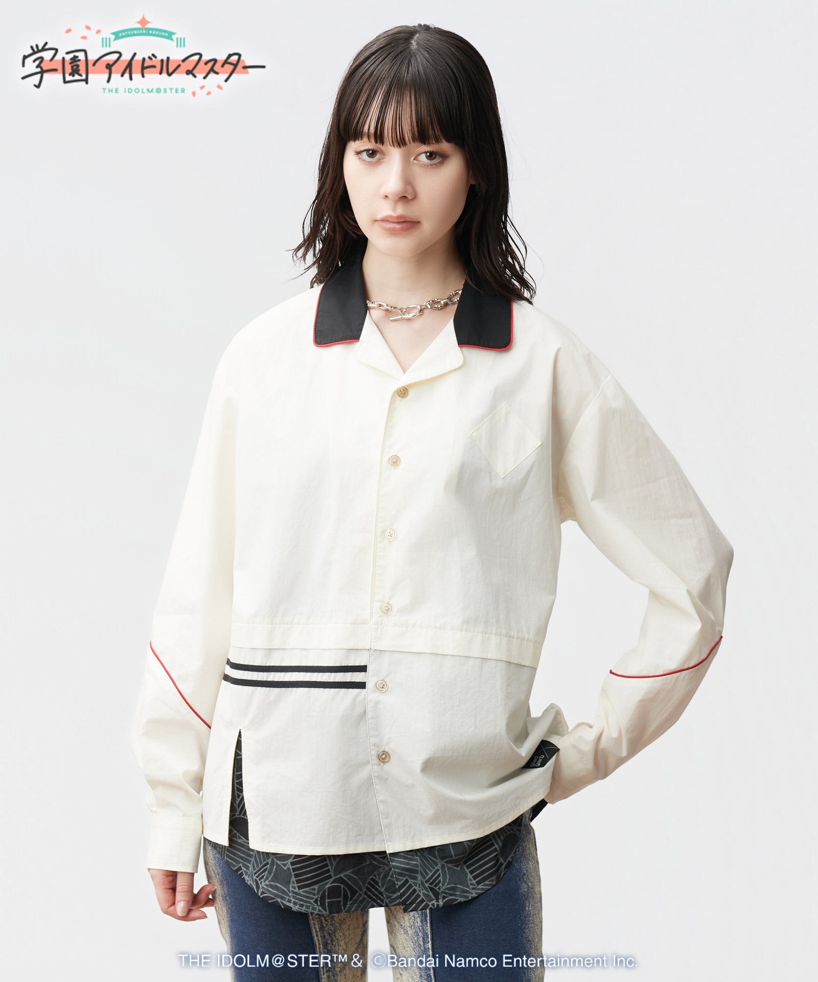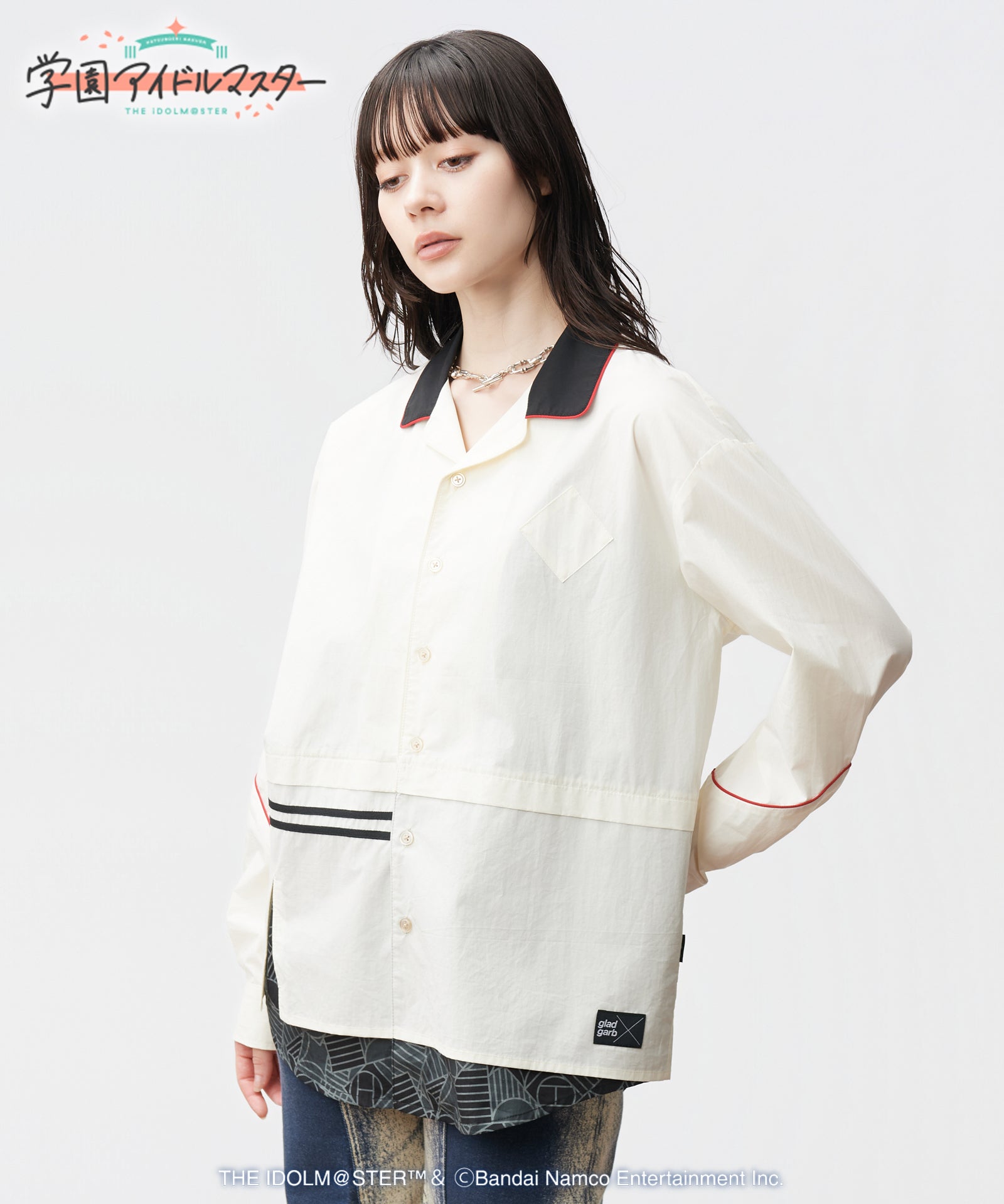 gladgarbと『学園アイドルマスター』がコラボレーション。花海咲季のベーシックコスチュームを1枚のシャツへと再構築したSaki Shirt。上下で切り替えたボディは、トップスを表現した部分にパイピングをあしらってボウリングシャツを思わせるストリートなムードに。ワッペンを模したパーツは敢えて無地であしらうことでモードな印象を持たせています。フェイクレイヤードしたスカート部分には初星学園の校章をアレンジした柄を散りばめて、作品へのリスペクトを込めました。シルエットは着丈長め、身幅広めのビッグシルエット。2つのカラーバリエーションはPinkはオリジナルの配色、WhiteはSaki Blousonと合わせることで楽曲『初』における花海咲季の着こなしを再現するものとなっております。