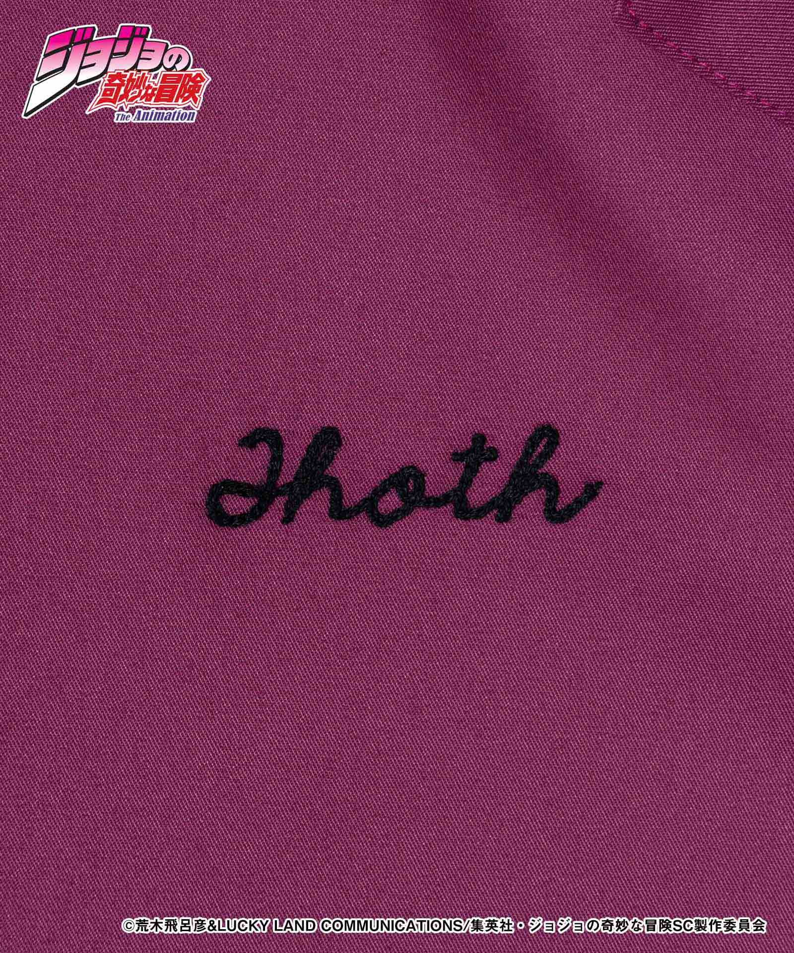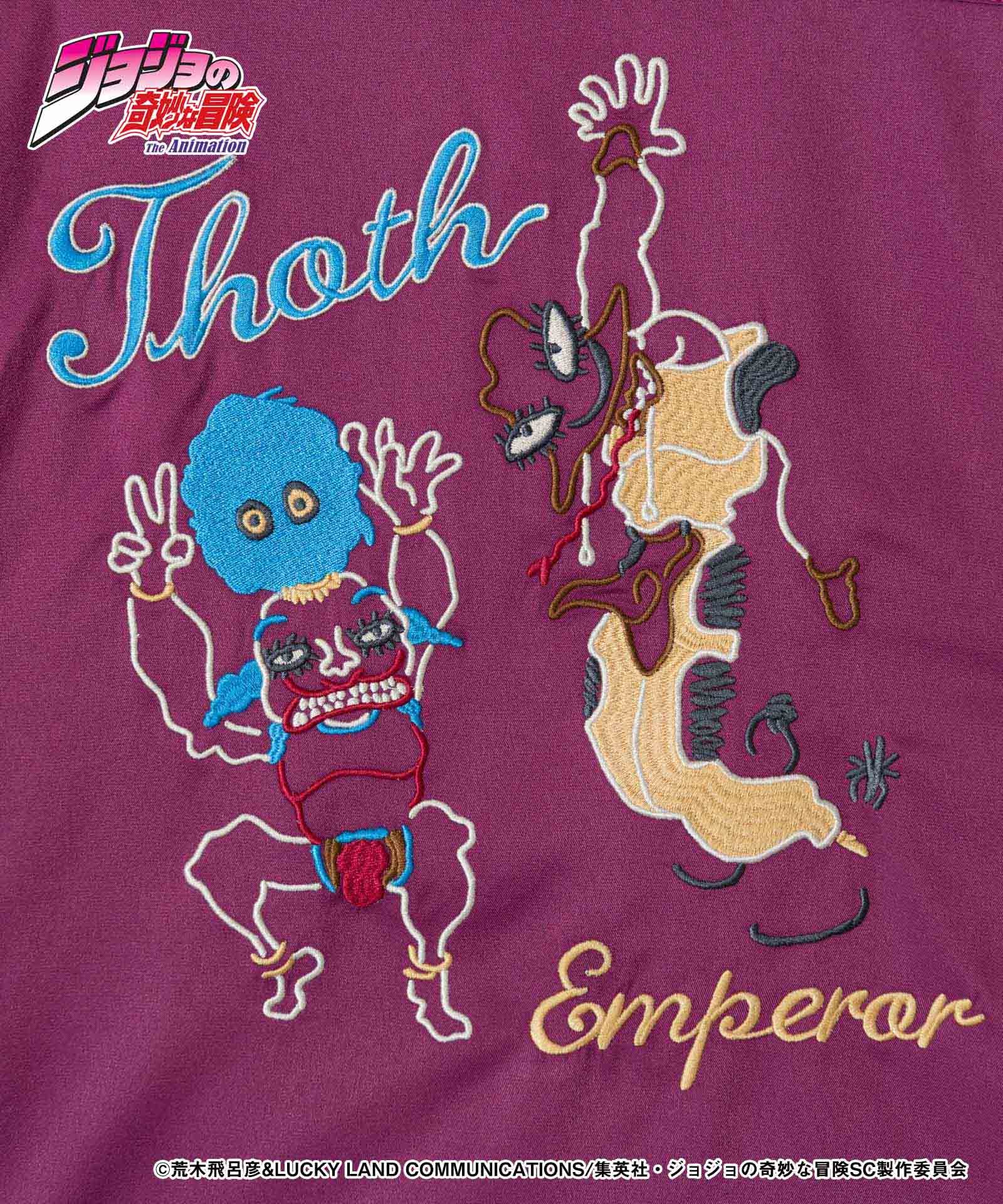在故事中充当漫画的Hol Horse and Mondatta变成了一种老式的美国衬衫。角色借鉴了蒙塔塔(Mondatta)的架子“ thoth”绣在背面的“ thoth”,两个看台的名称以徽标般的方式绣在前箱子上,从而产生了一种表面,反映了对前后工作的热爱。