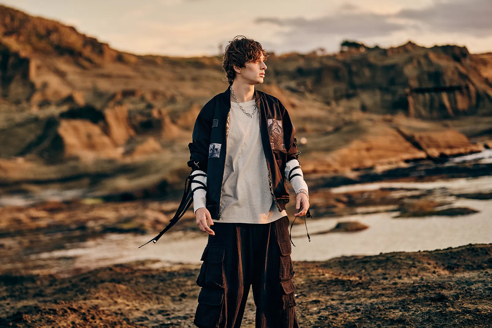 “Blow”シリーズとなる、長いテープを袖からぶら下げるディテールを思いついた。レザーやメタルチェーン、ビーズなど様々な素材で展開するこちらは使い方も多彩で、袖につけて腕に巻き付けたり、ベルトループから垂らしてキーホルダー感覚でも着用可能だ。“Blow”シリーズの使い道は、手に取った方に自由に想像して頂きたい。僕が感じた“ゼロからの創造”を体現出来る遊び心あるデザインになっています。