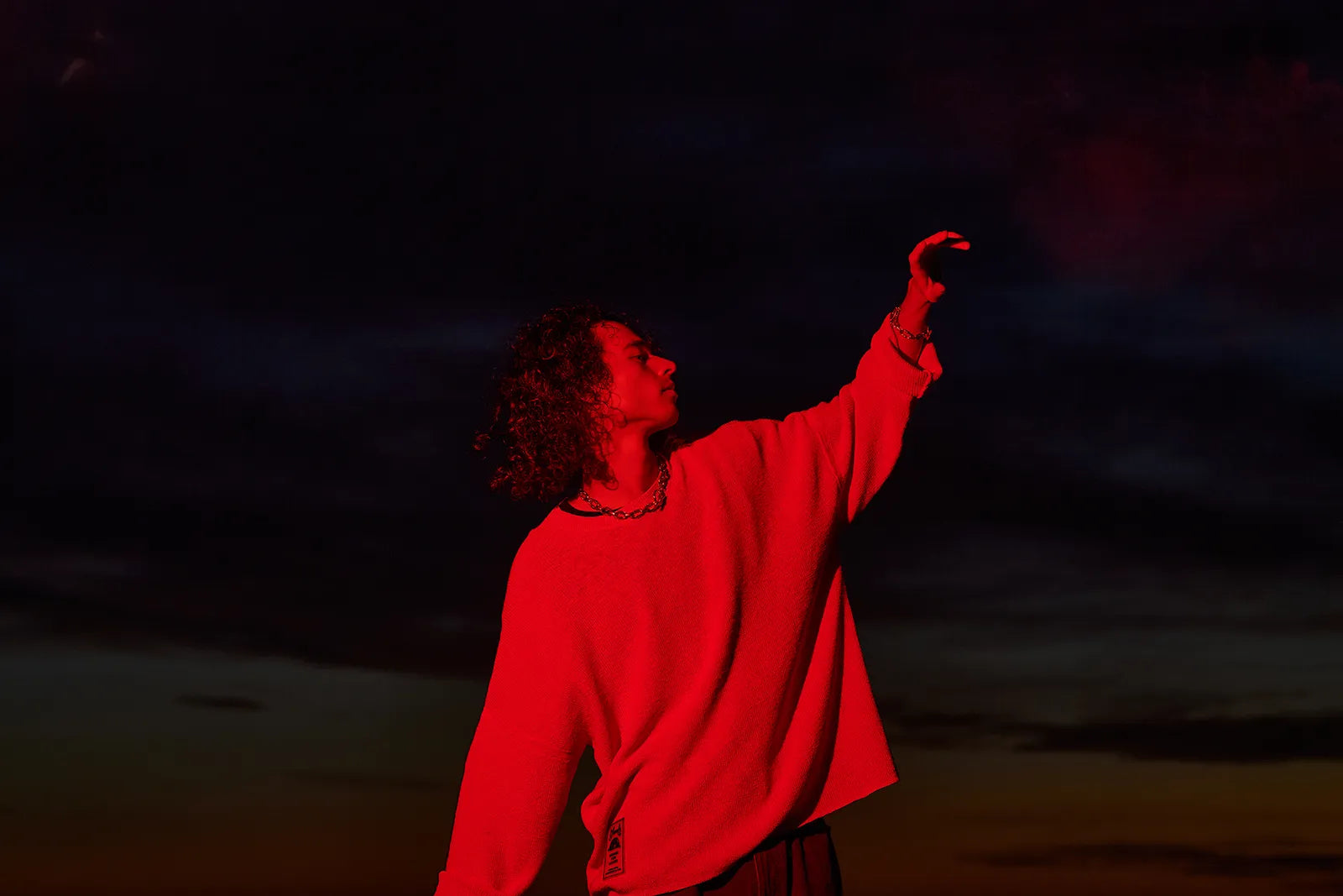 デザインを進めていくうちに、大地を駆け抜ける“風の影”の人物像のようなものが思い浮かんだ。彼が翼のように広げる腕からは長い布のようなものがなびいていて、赤いドレスのような洋服が緑の草木、青い空とのコントラストで美しく揺れる。女性とも思える雰囲気で、顔を確かめたくても逆光で表情が分からない。彼が追いかけていた光は、掴むことができたのだろうか____?