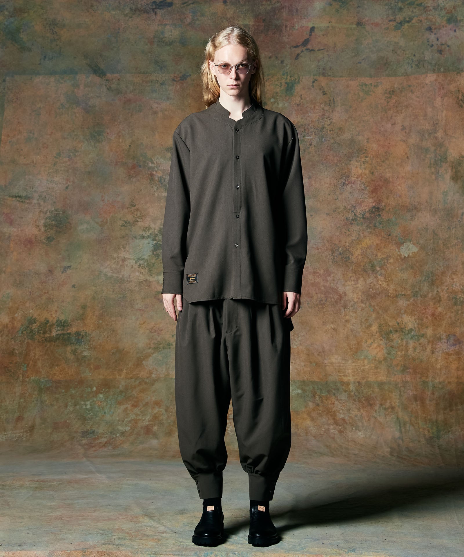 变形的衬衫具有极简主义的视觉效果,但也具有多种嬉戏的感觉。车身由弹力混合西服面料制成,并具有长长的轮廓。脖子由带领项圈的不同图案组成,长度与前后不同。还可以使用由相同织物制成的变形衬衫裤子,因此您可以将其作为一套。