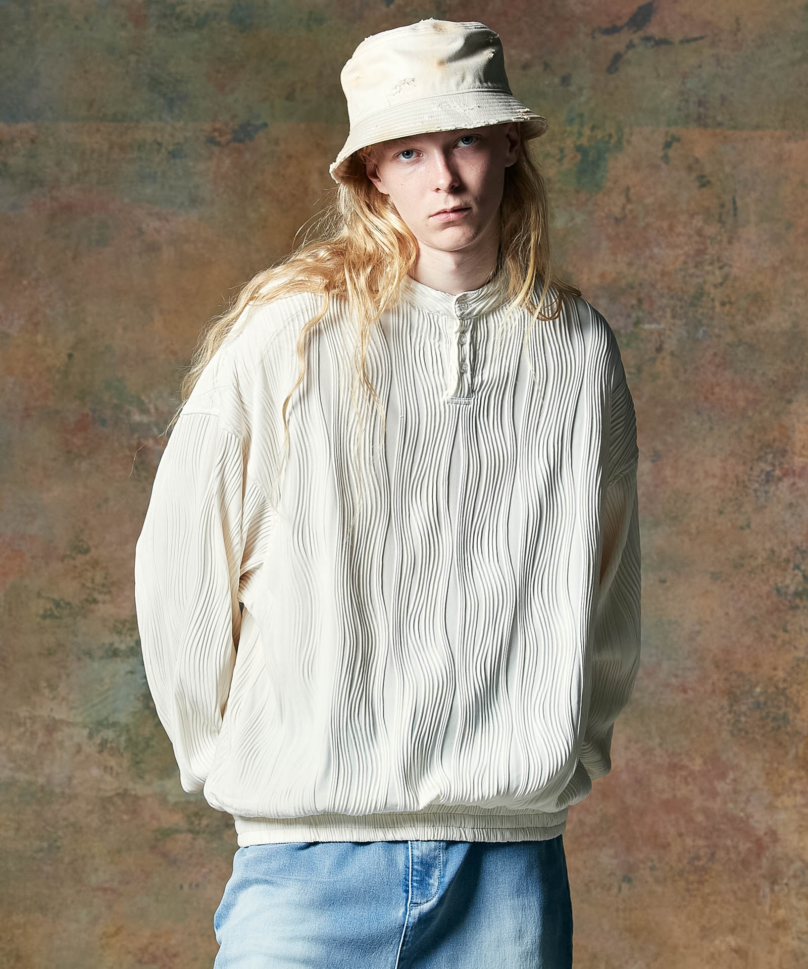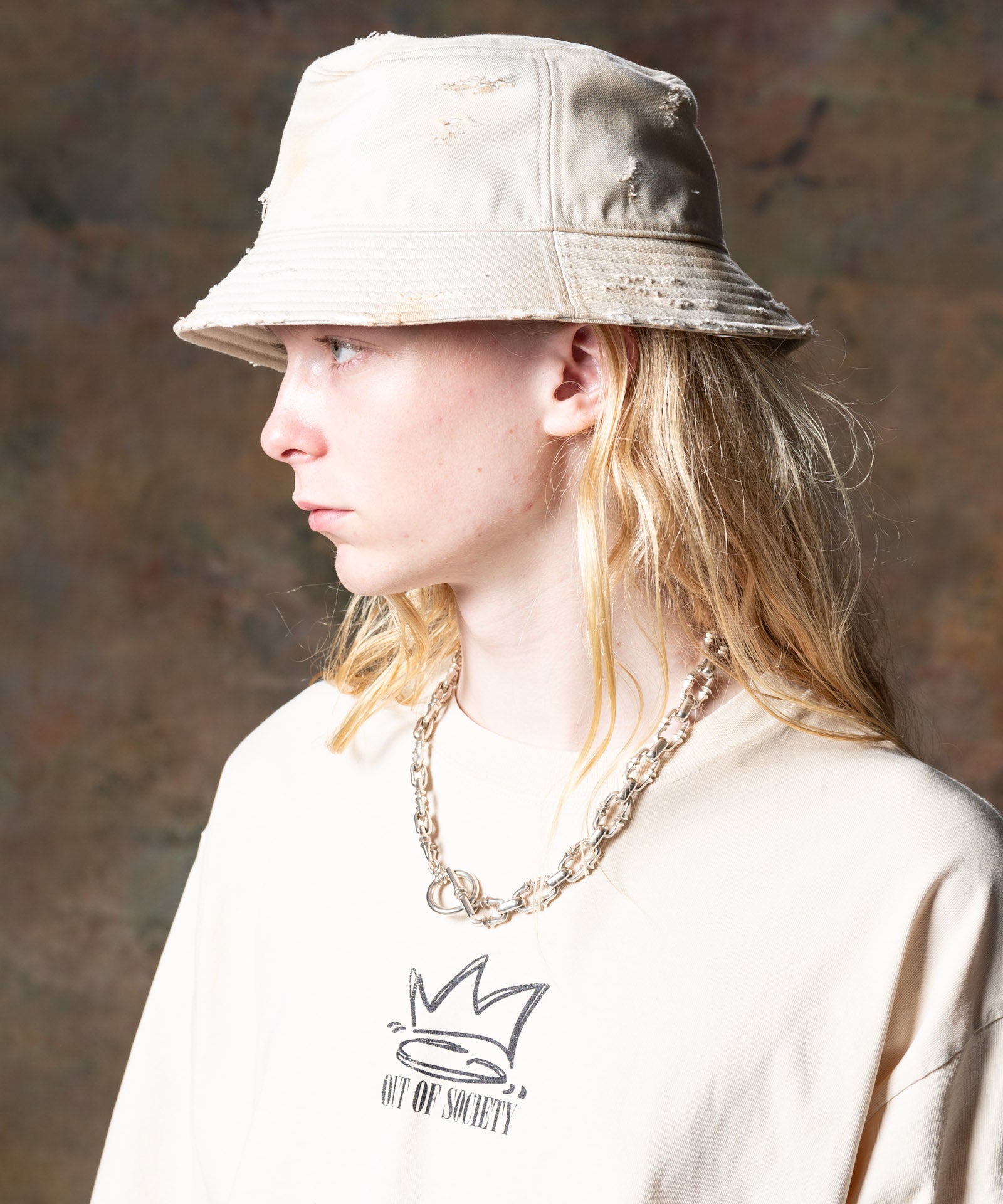 这款Damage Bucket Hat的特点是在斗帽上经过工匠1点1点的损坏加工而成的工艺精湛的饰面。 边部分细取的固体的剪影和内侧的尺寸调整皮带这样的细节品牌的基本款,不过,决定本作品的是那个加工。 随处可见的损坏,加上让人联想到生锈的污染,打造出了让人联想到流浪者的逼真形象。