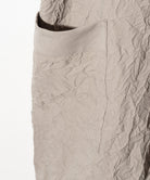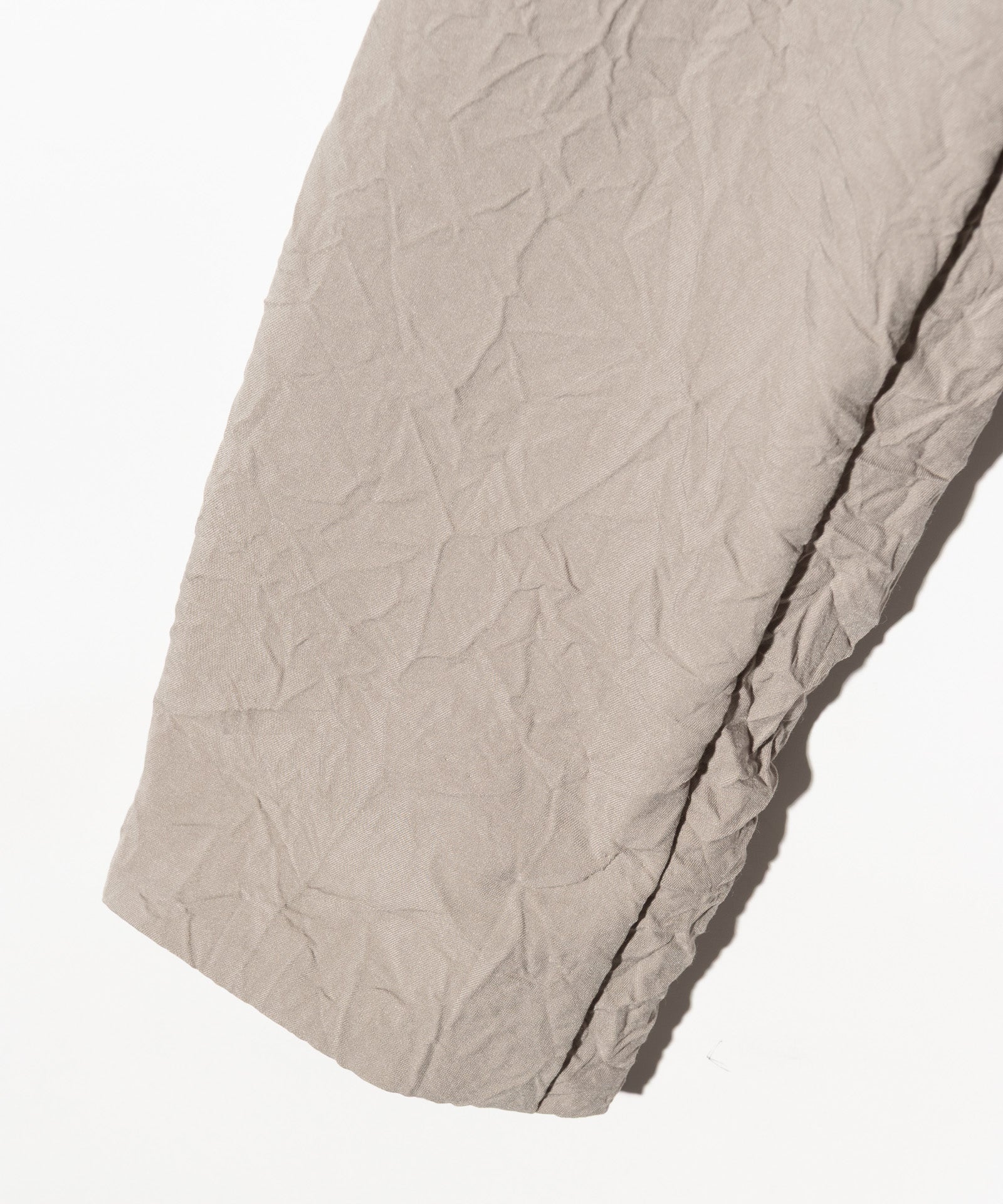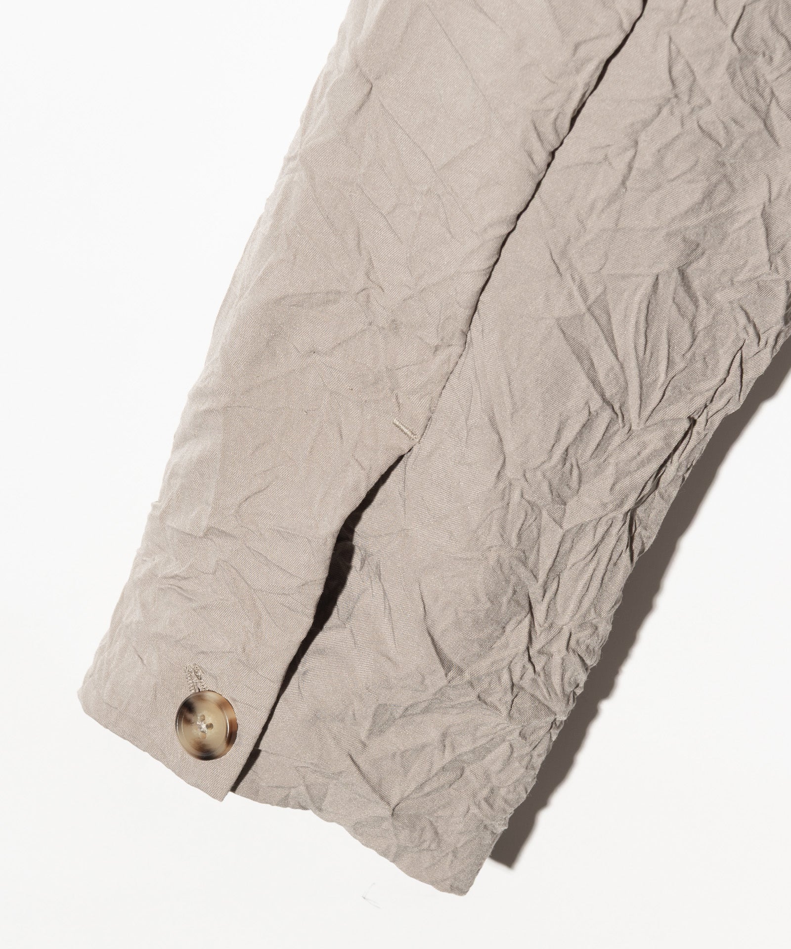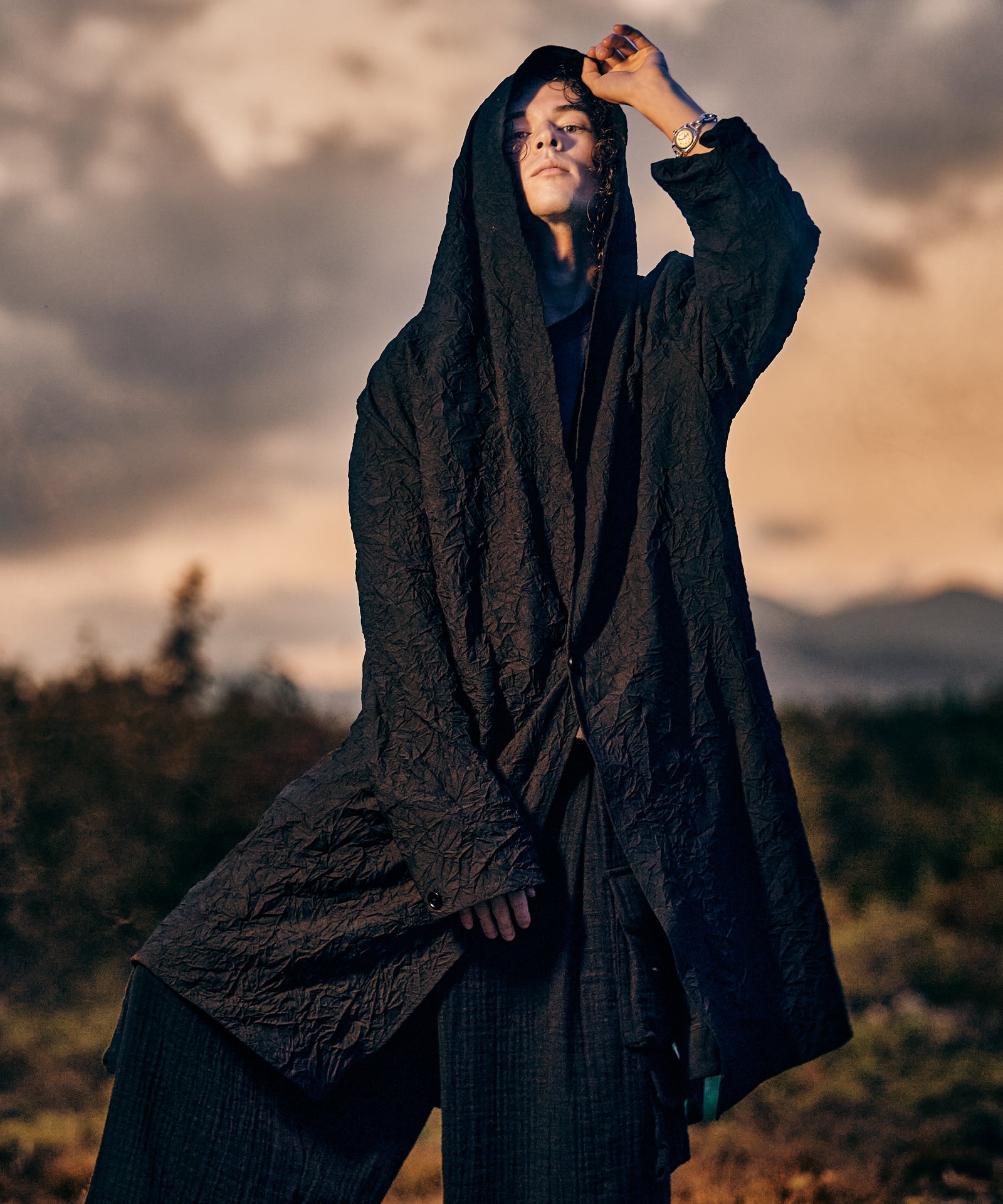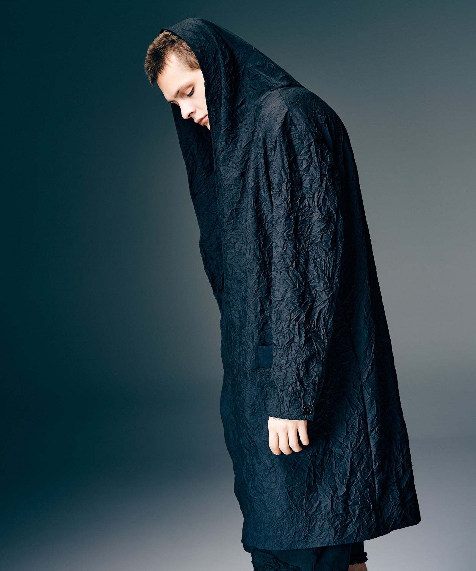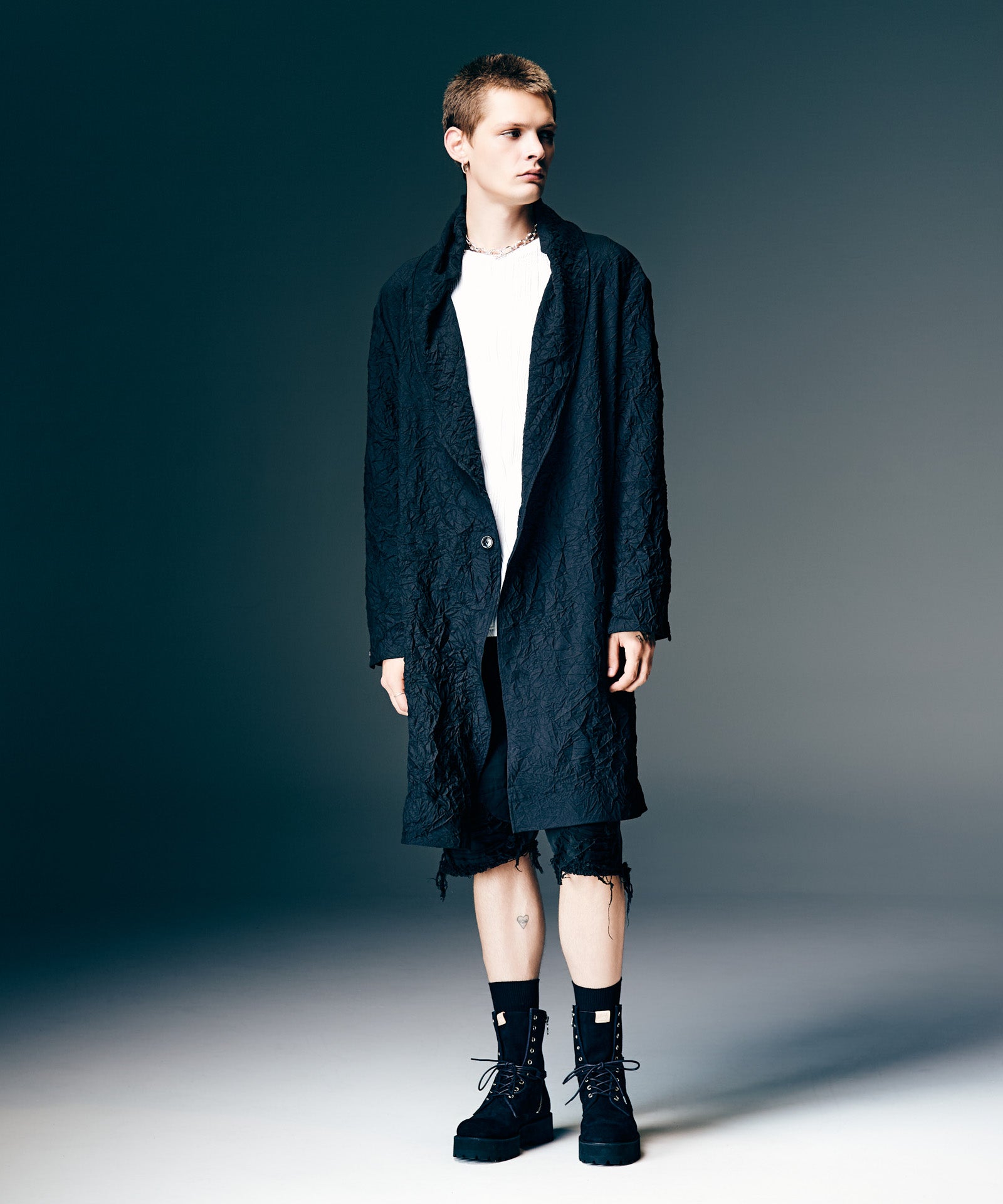 褶皺披肩領大衣是一款春季大衣,採用陰影織物捕捉 glamb 本季主題“風之影”的世界觀使用的主體面料是薄斜紋面料,經過鎖緊墊圈處理以產生皺紋及膝的衣身空間恰到好處,脖子上繫著青果領,營造出優雅的心情。口袋為外袋,打造休閒造型,無襯裡剪裁,無任何芯或襯裡,打造出易於穿著的單品,捕捉季節感。