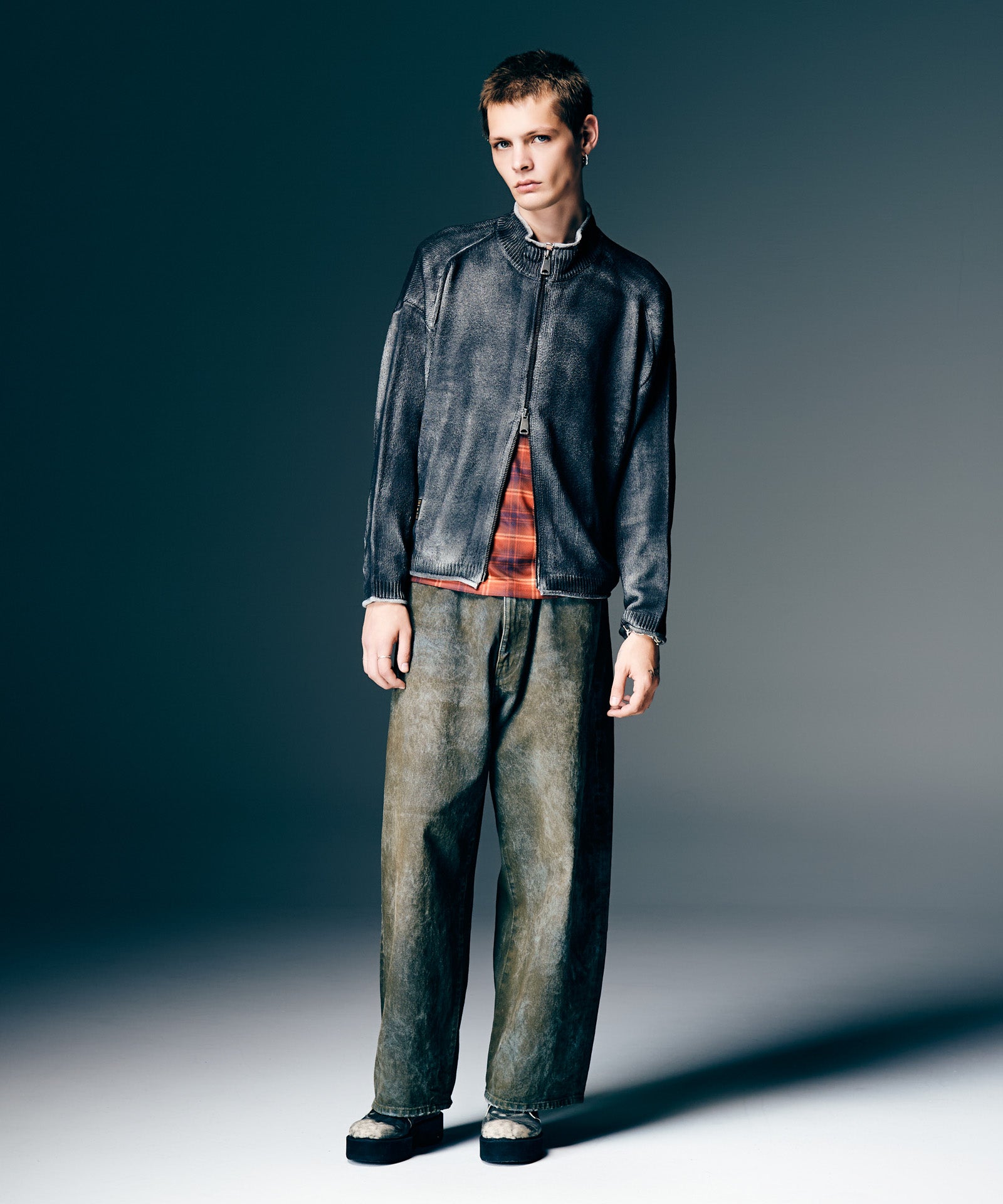 ブランドのクラフトマンシップを駆使してワークウェアの経年変化を大胆に拡大解釈、デニムの"汚れ"をアーティスティックに再表現したWhole Dirt Denim。glambのデニムに対する新たなアプローチが込められたのはボディ全体を隈なく覆う汚し加工。泥に似せて制作した特殊な樹脂を用いてデニム1本1本を職人が隙間なくコーティング。ウォッシュ加工を施して表面をこなれさせた後、熱処理仕上げで加工を定着させました。シルエットはハイウエスト着用も考慮して股上と股下にゆとりをもたせたバギータイプ。イージーな穿き心地も備えた本作は、穿き癖に応じて生じるコーティングのアタリも含めて末永くお楽しみください。