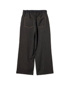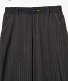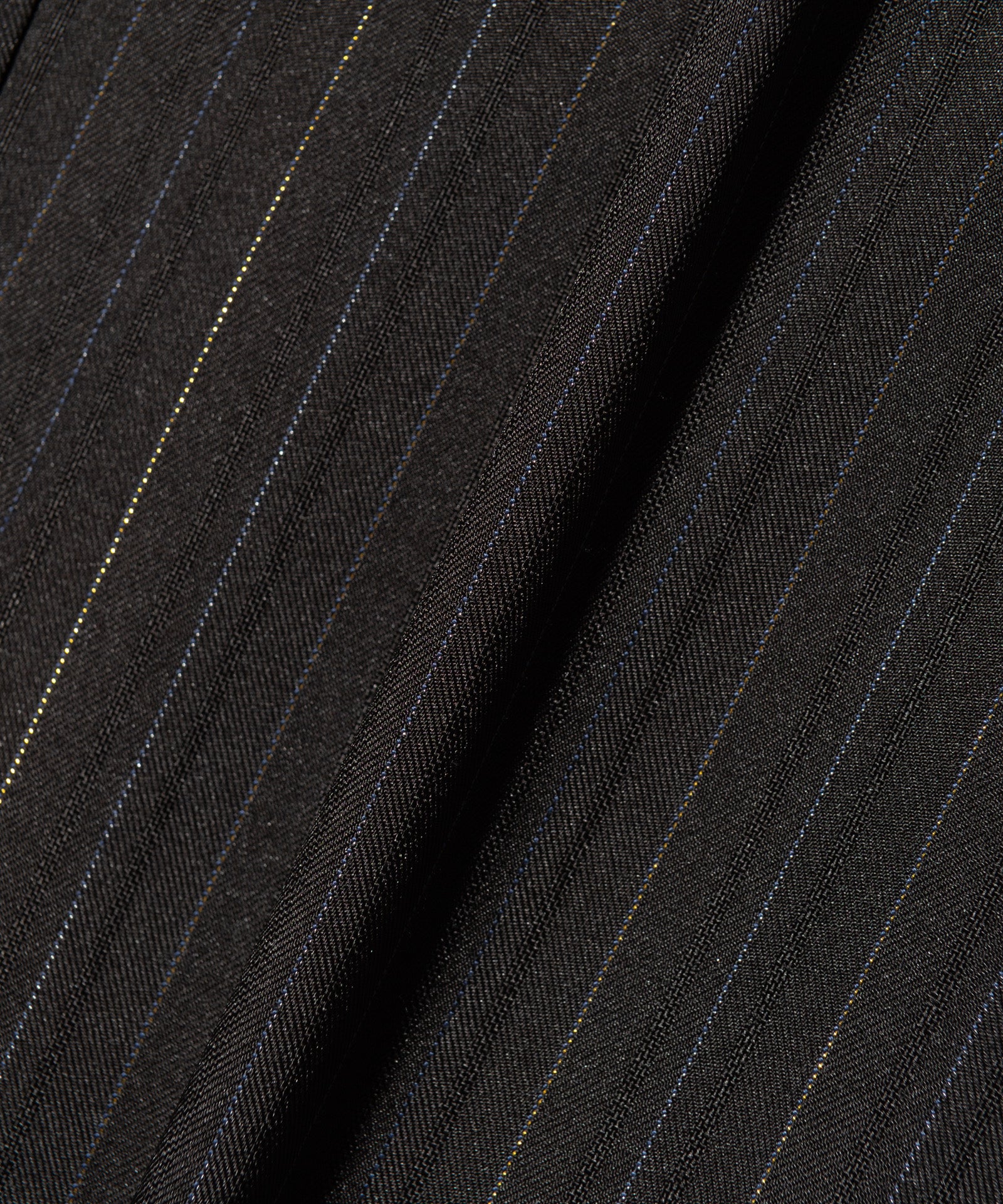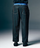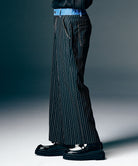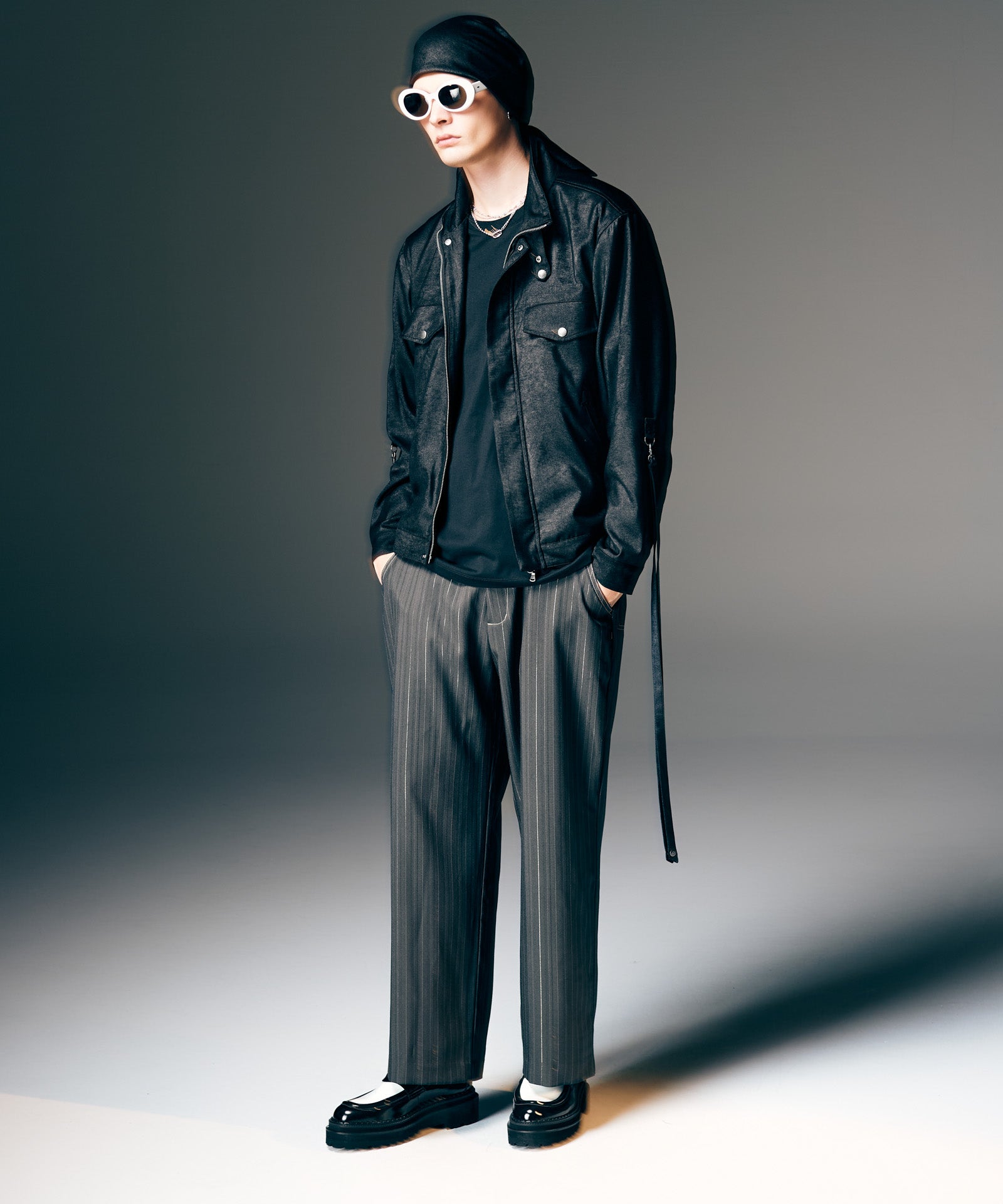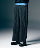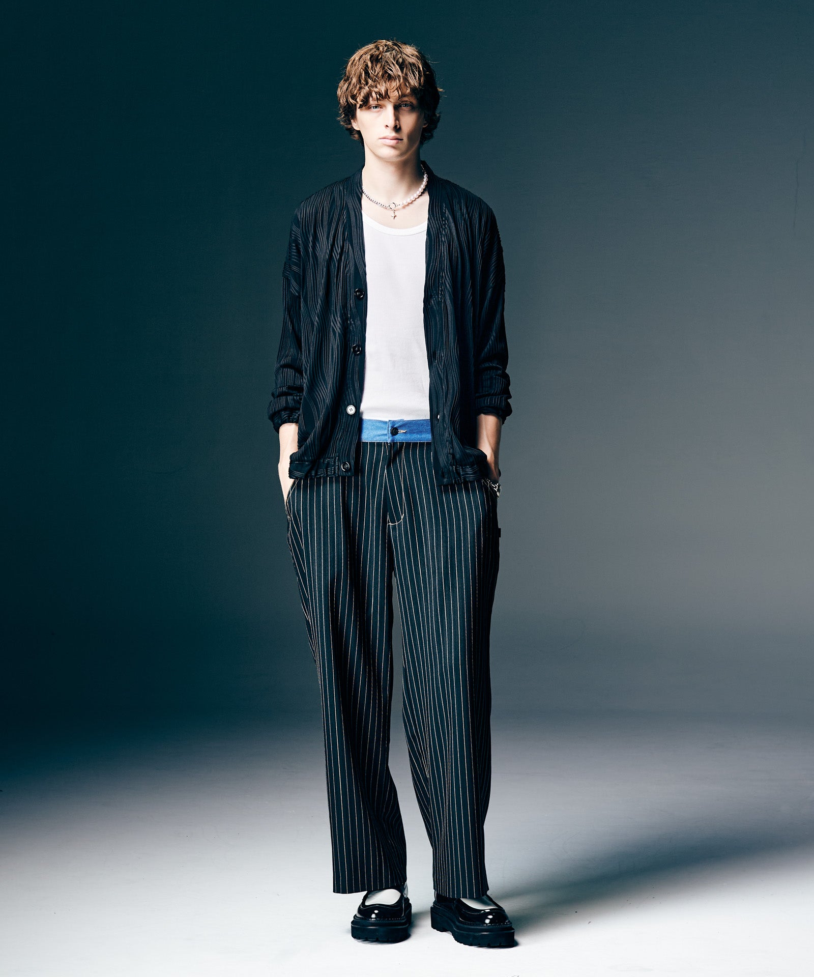 スタイリング提案を込めたディテール使いを随所に落とし込み、ワークとトラッドをウィットあるバランスで融合したDenim Combination Slacks。ワイドシルエットのボディは、光沢糸をライン部分に織り込んだロックマインドあるストライプ生地を使用。ウエストのデニム切り替えやバックポケットにあしらわれたデニムを模したステッチなど、ワークのディテールを散りばめることでジャンルレスなヴィジュアルにまとめました。スタイリングはトップスをタックインして異素材使いを強調したアレンジがブランドからの提案。アヴァンギャルドでありながらリアルな本作独自のバランス感をお楽しみください。