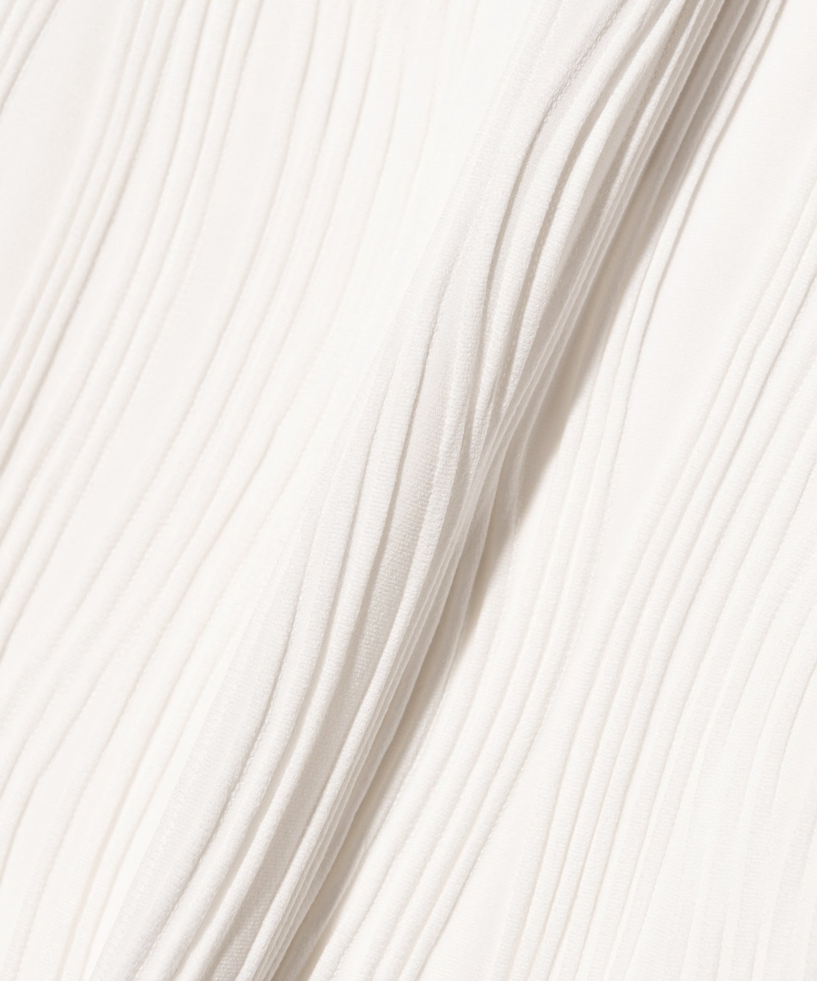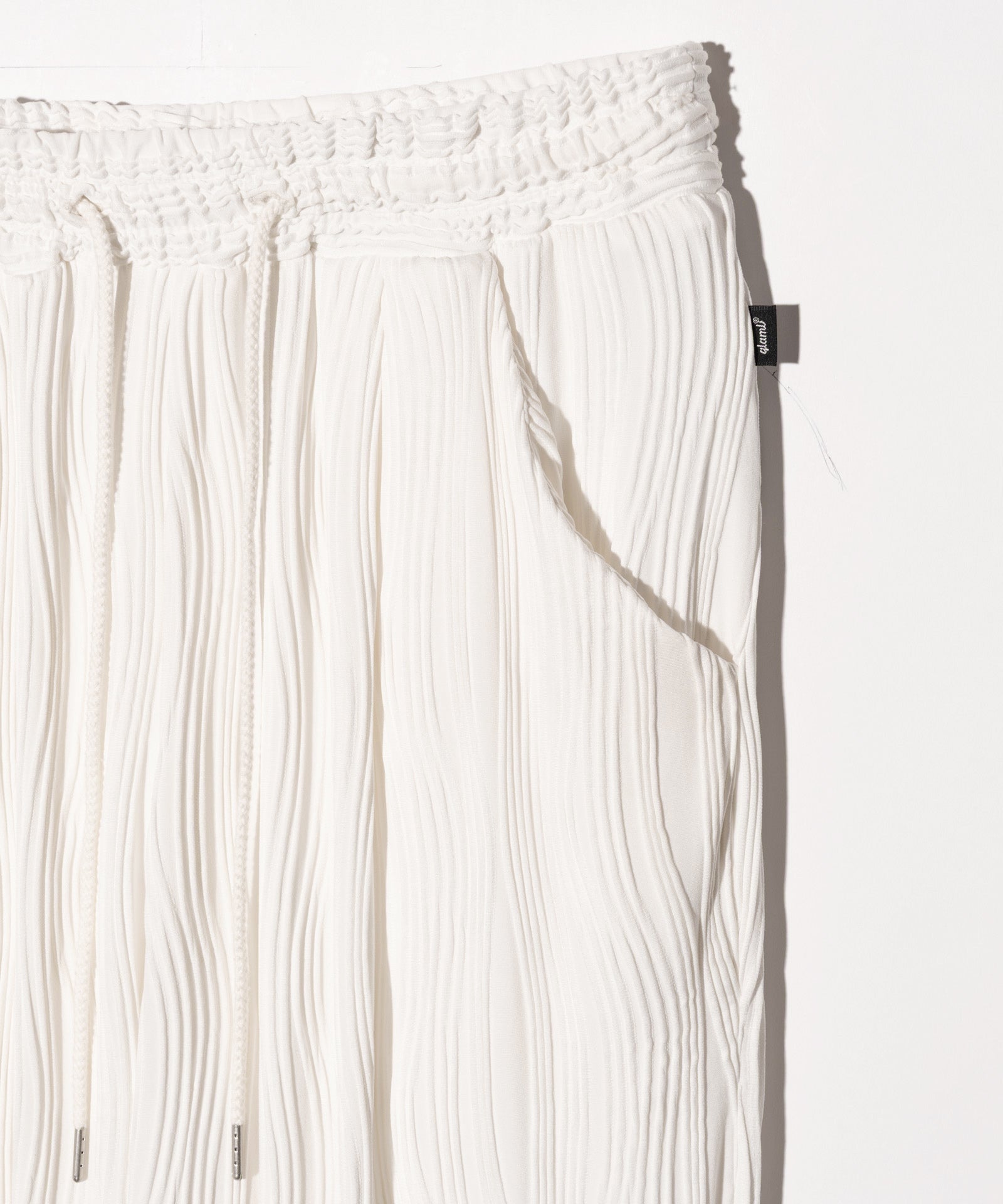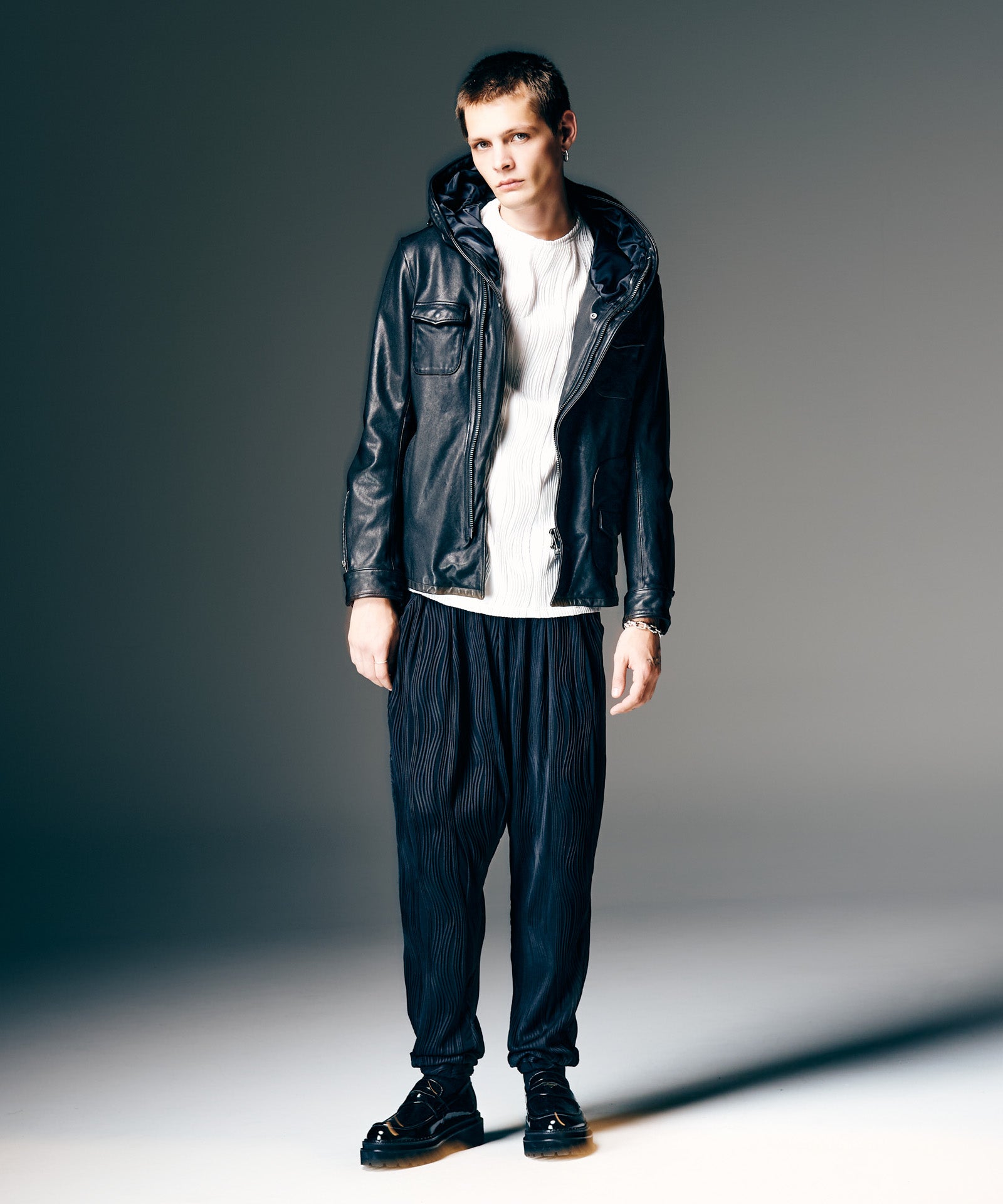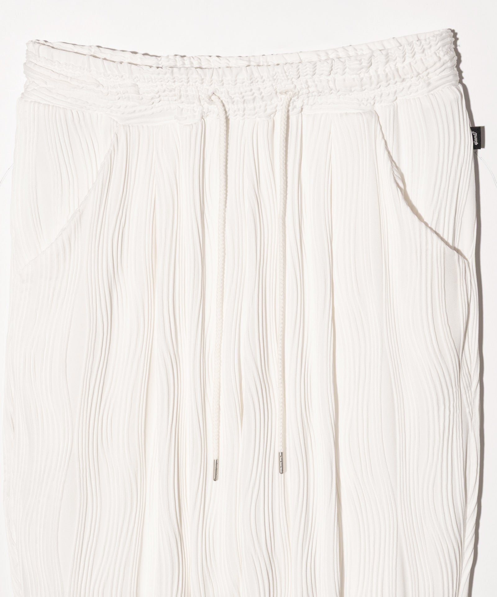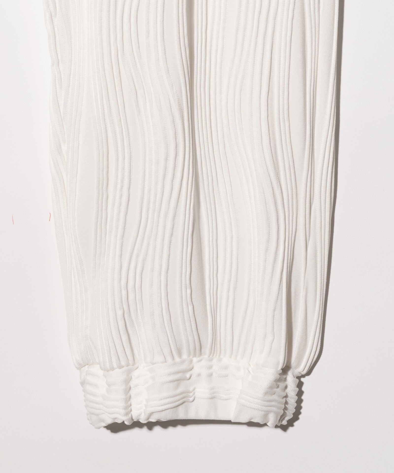 リュクスなテイストを醸し出すプリーツ使いで2025年春コレクションに好評を博したWillow Crepe Pantsが再登場。楊柳生地を思わせるプリーツ状の流線型のタックは編針で網目を作り、さらに編みを介して編地に結びつけるという手間を惜しまない工程で構築したもの。それを腰元に1タックを取ったテーパードサルエルシルエットへと落とし込んでいます。絞りを加えた裾部分は生地の目を横使いにしたものとなっており、リブの伸縮性と同生地アレンジという遊び心を兼ね揃えた仕立てに。同生地を用いたWillow Crepe CutsewやWillow Crepe Cardiganとのスタイリングにより、エレガントでイージーなムードをより一層お楽しみいただけます。