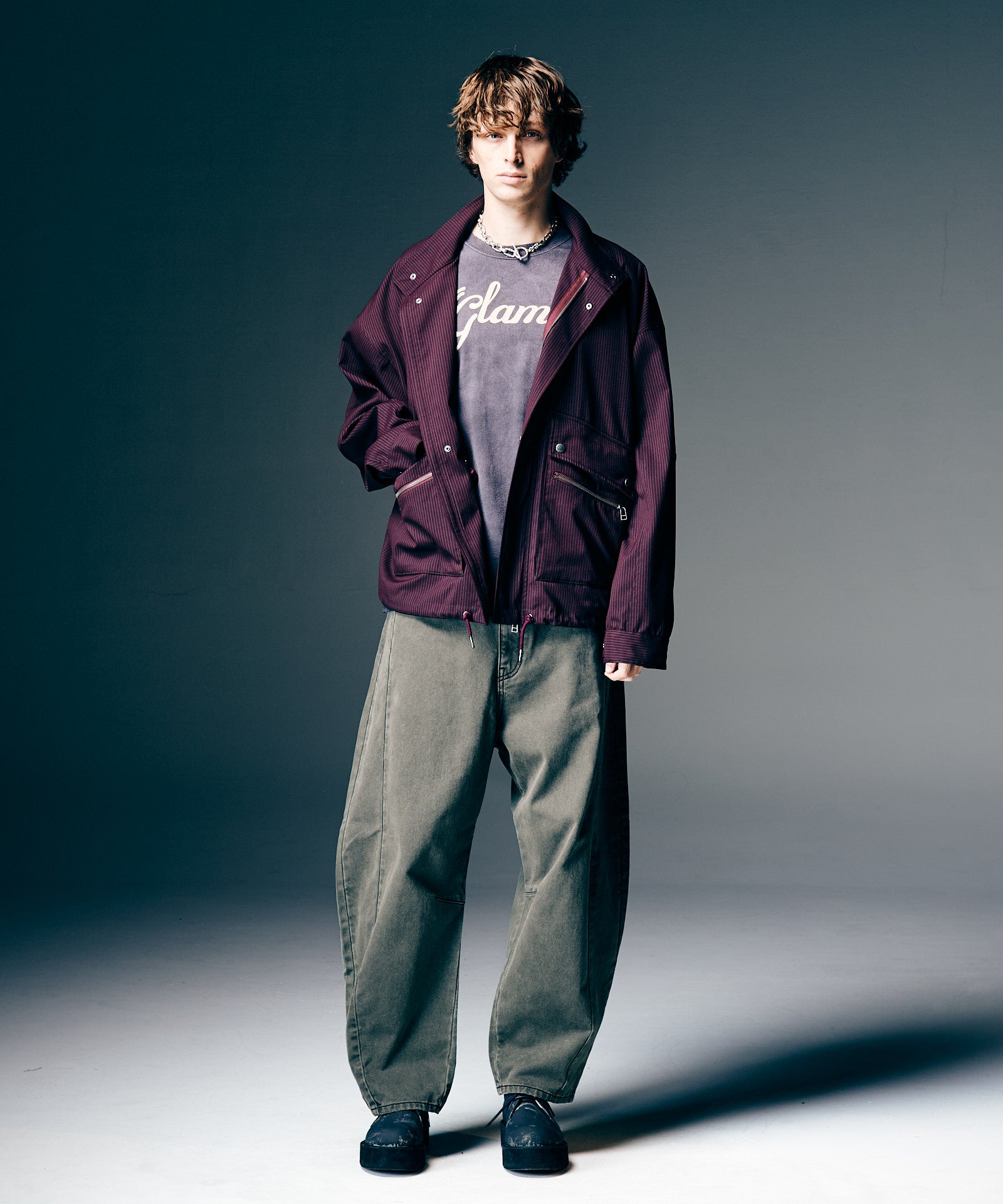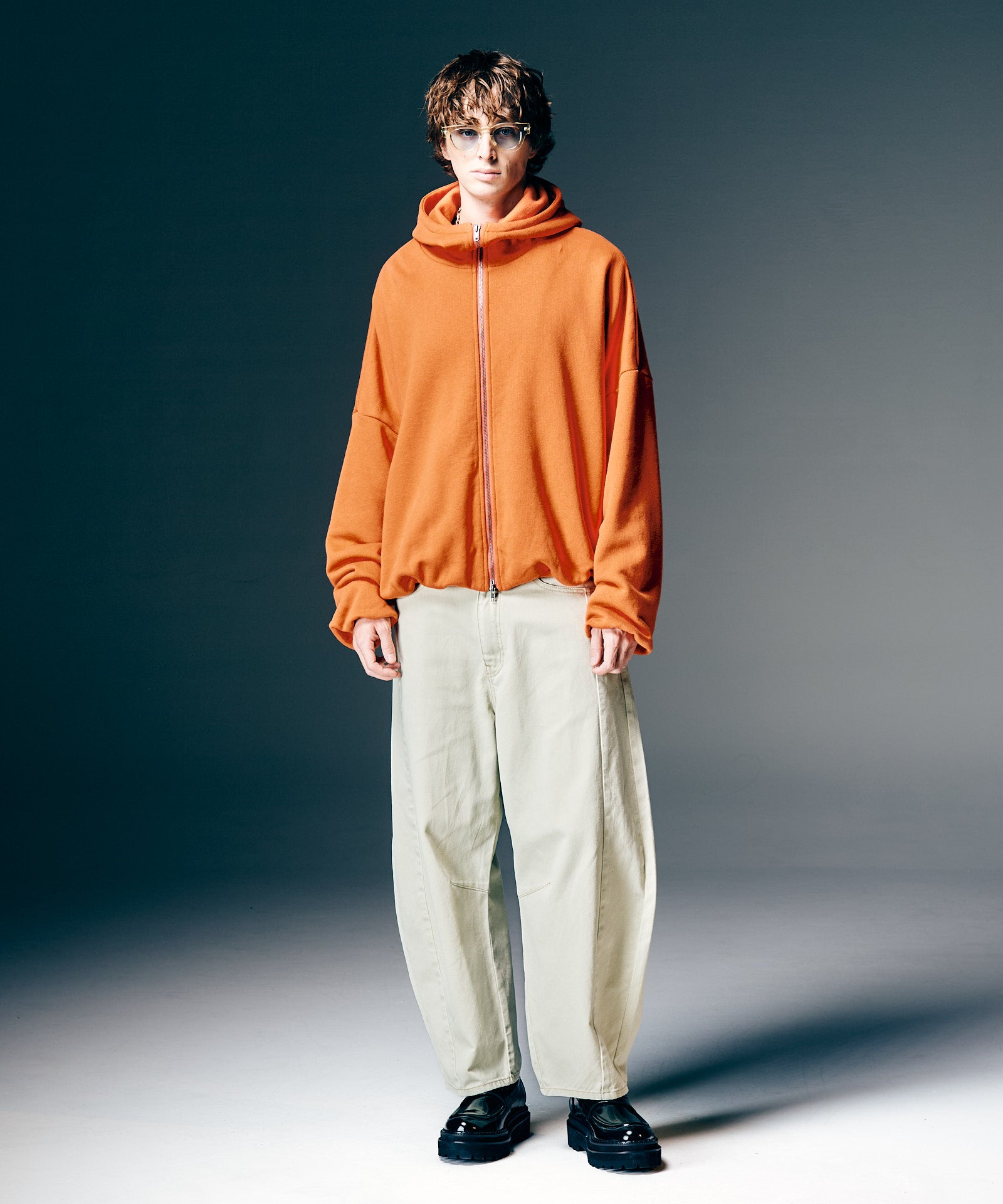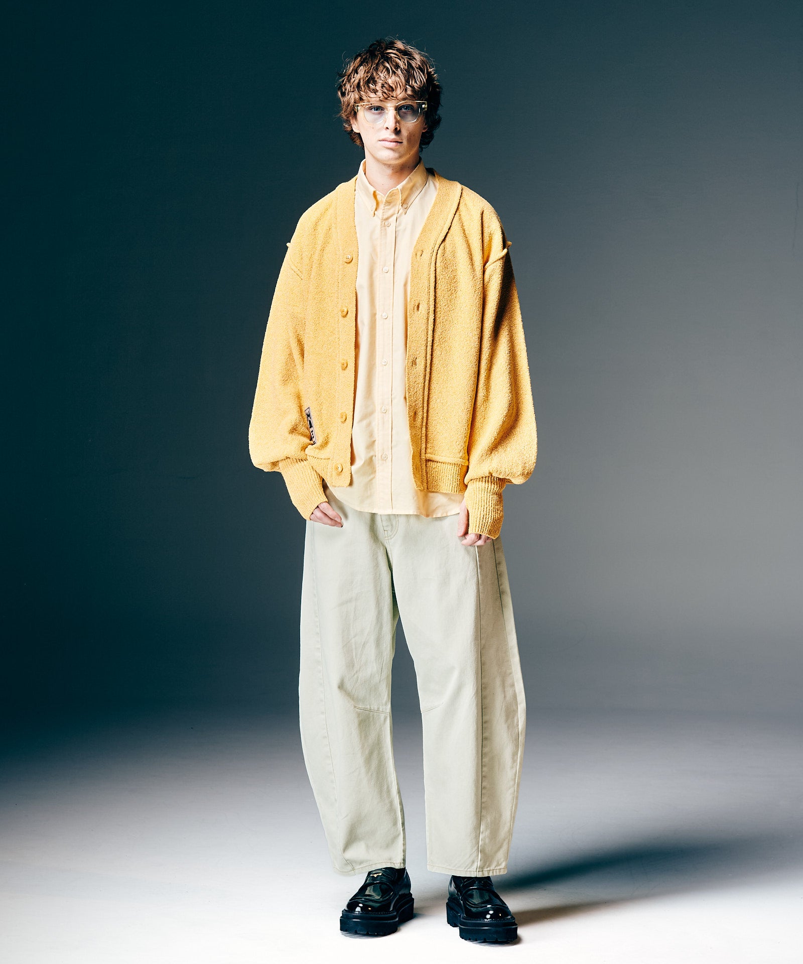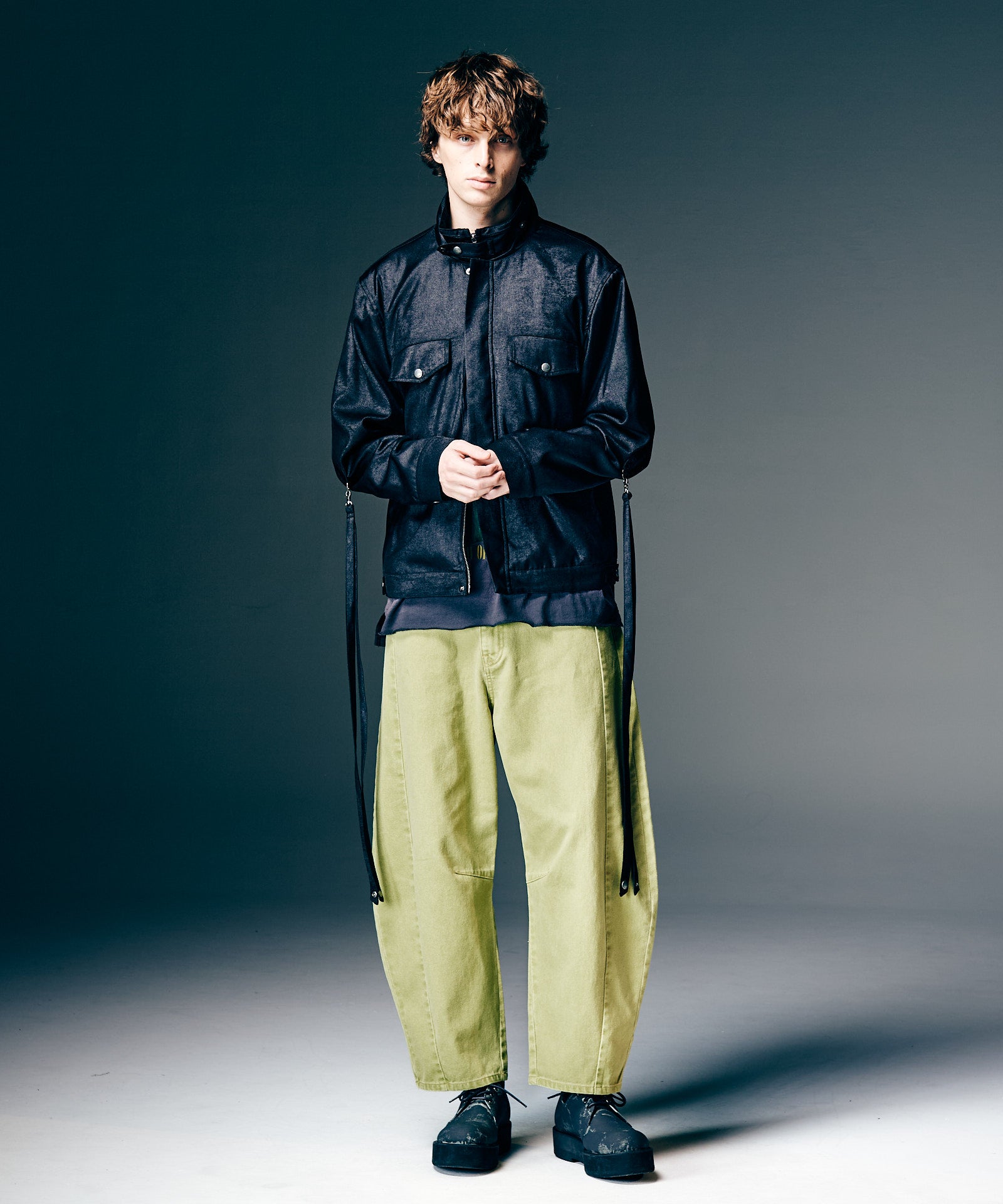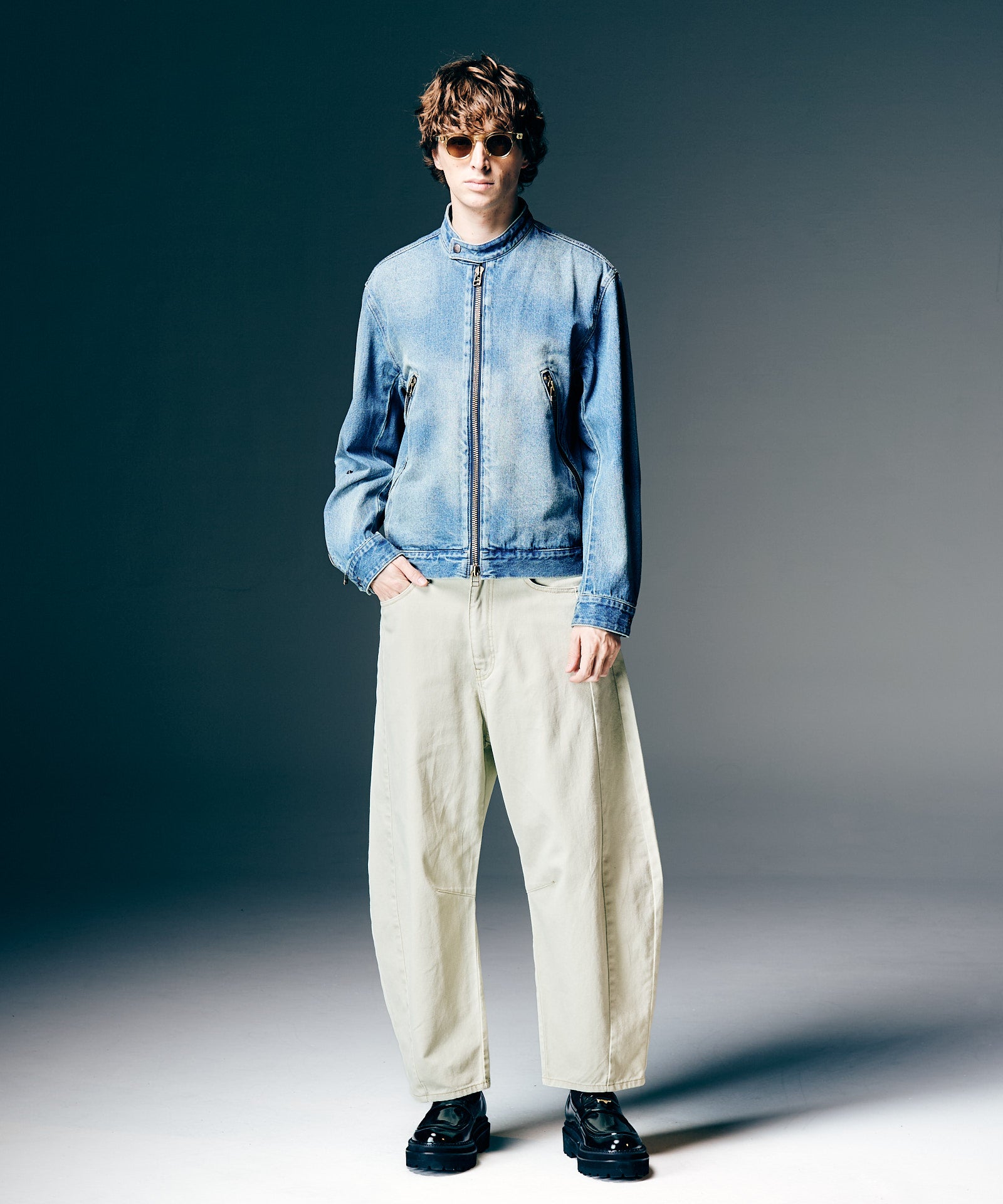 glambの独創的なワイドシルエットメイキングをカラーコーディネートで提案するColor Barrel Denim。バルーン状のシルエットは丸みを帯びた輪郭に合わせて前身頃を2パネル使いで構成。さらに裾内側にダーツを加えた立体的なパターンによって表現しています。4色展開となるカラーバリエーションはいずれもアッシュがかった色調で展開。アイコニックなルックスだからこそ、プレーンなトップスと合わせた抜け感あるスタイリングがおすすめです。