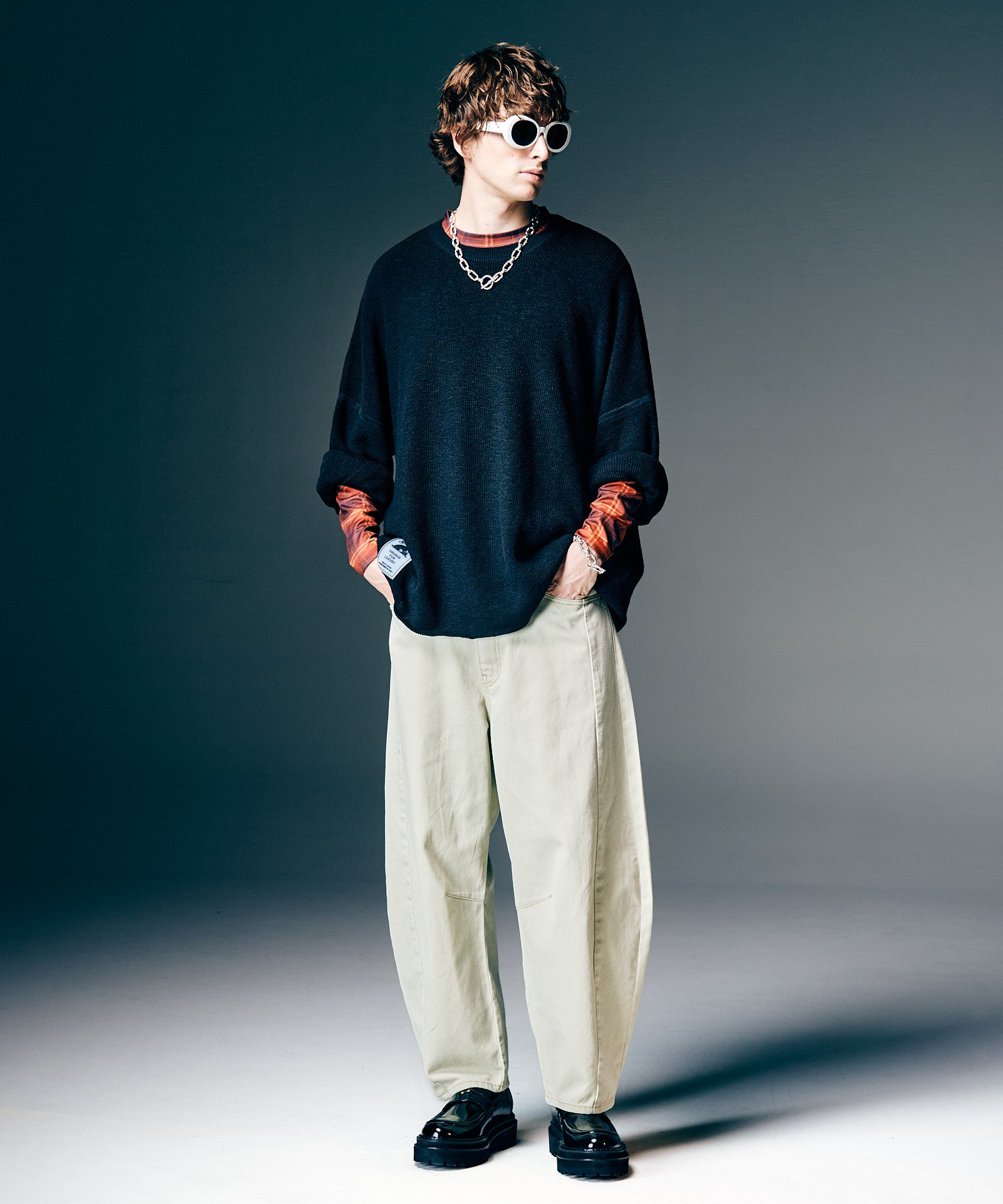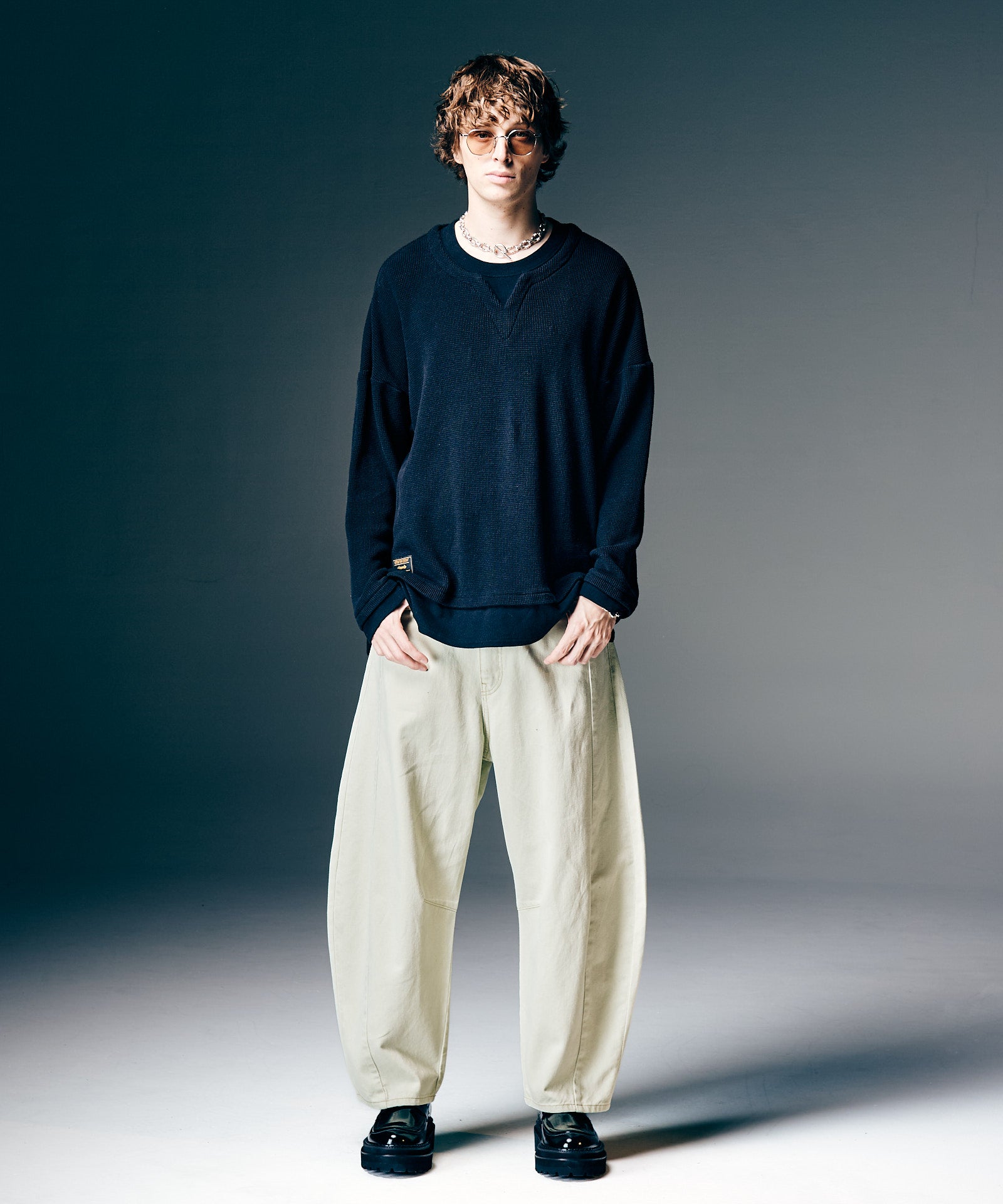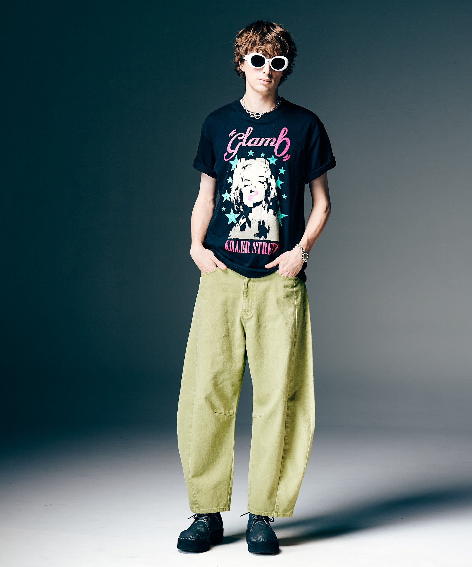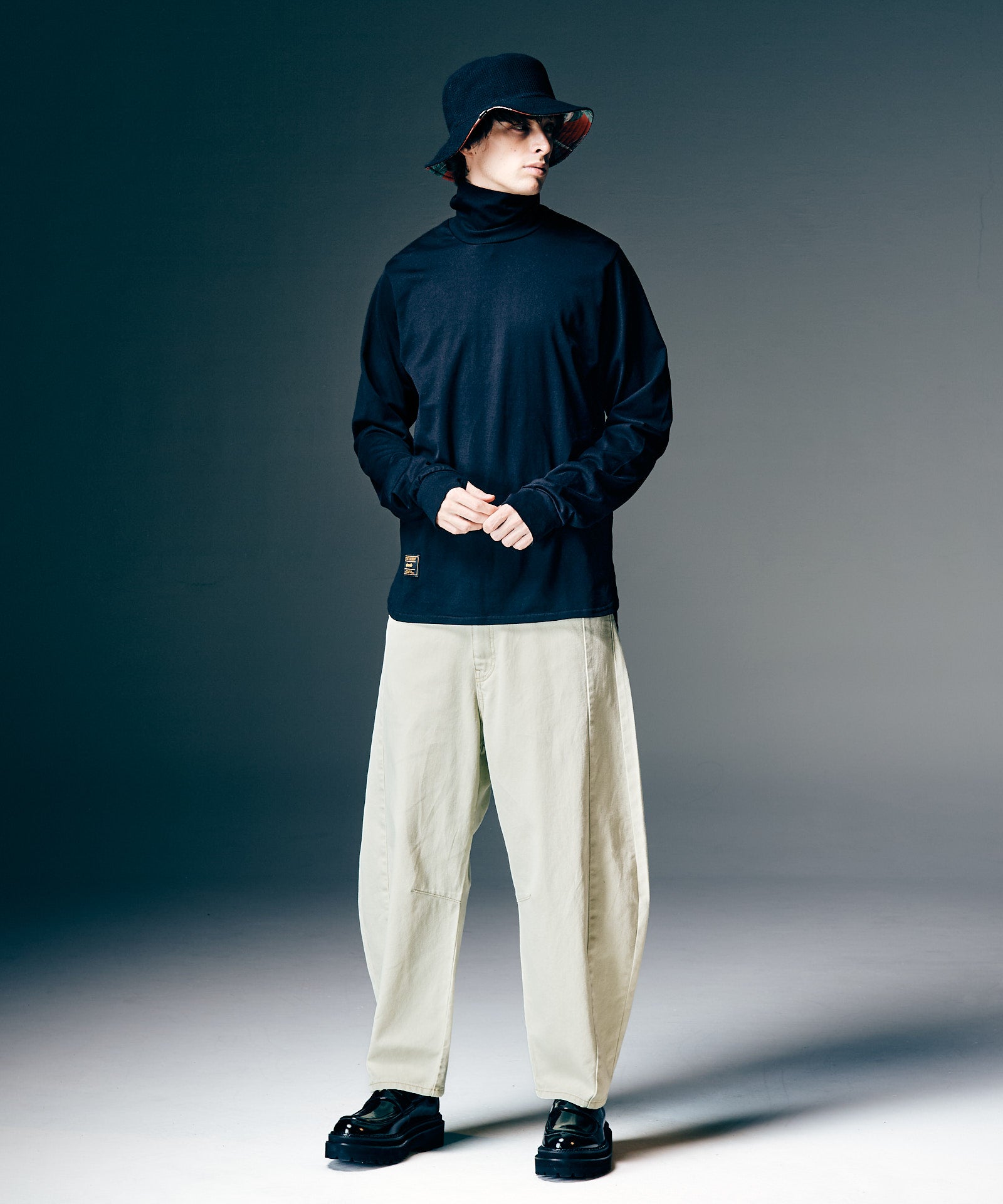 glambの独創的なワイドシルエットメイキングをカラーコーディネートで提案するColor Barrel Denim。バルーン状のシルエットは丸みを帯びた輪郭に合わせて前身頃を2パネル使いで構成。さらに裾内側にダーツを加えた立体的なパターンによって表現しています。4色展開となるカラーバリエーションはいずれもアッシュがかった色調で展開。アイコニックなルックスだからこそ、プレーンなトップスと合わせた抜け感あるスタイリングがおすすめです。