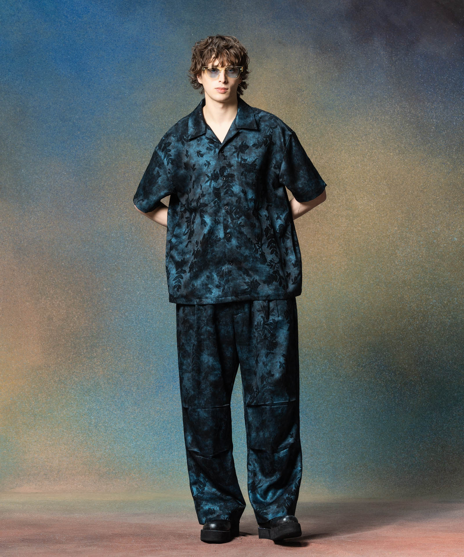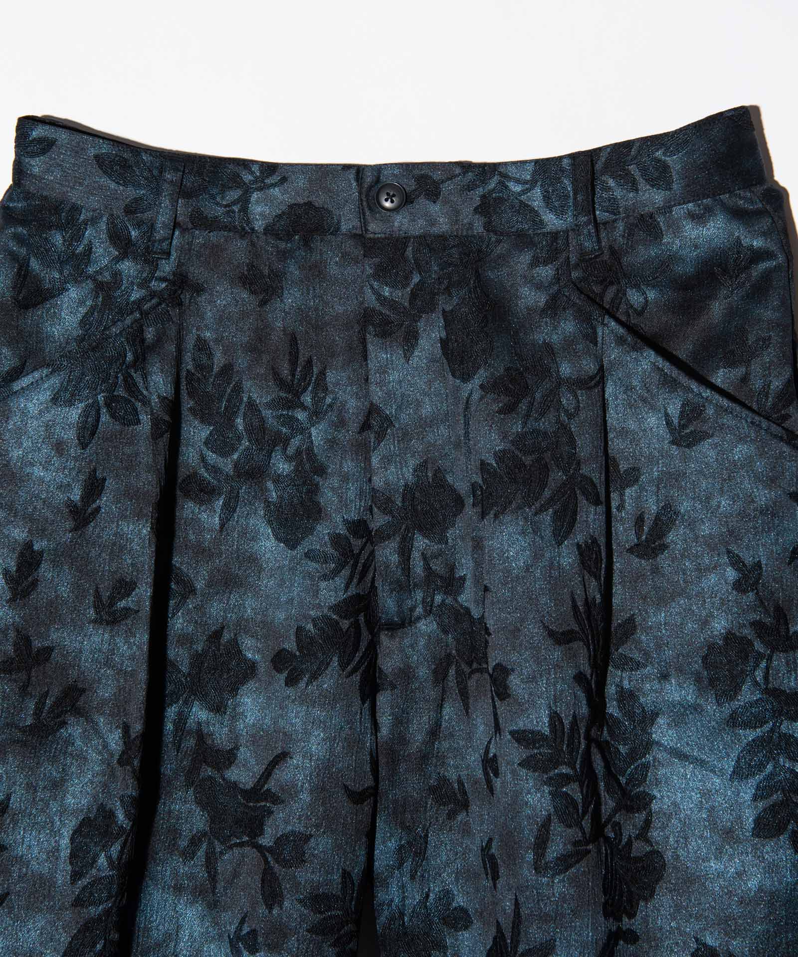 Glitter Botanic Pants将捕捉季节感的Botanic花纹与感觉glam rock的光泽质地相结合,提出lux的下装风格。 用于纺织品的是在身胚上缝上花纹,然后在上面随机喷涂涂料使之有光泽的加工胚。 享受根据佩戴者的动作闪烁的纹理。 剪裁在腰部设置1褶裥和膝盖设置2褶裥,立体构成的粗布剪裁。 本季使用了同面料的Glitter Botanic Aloha Shirt也被展开,设置可以穿。