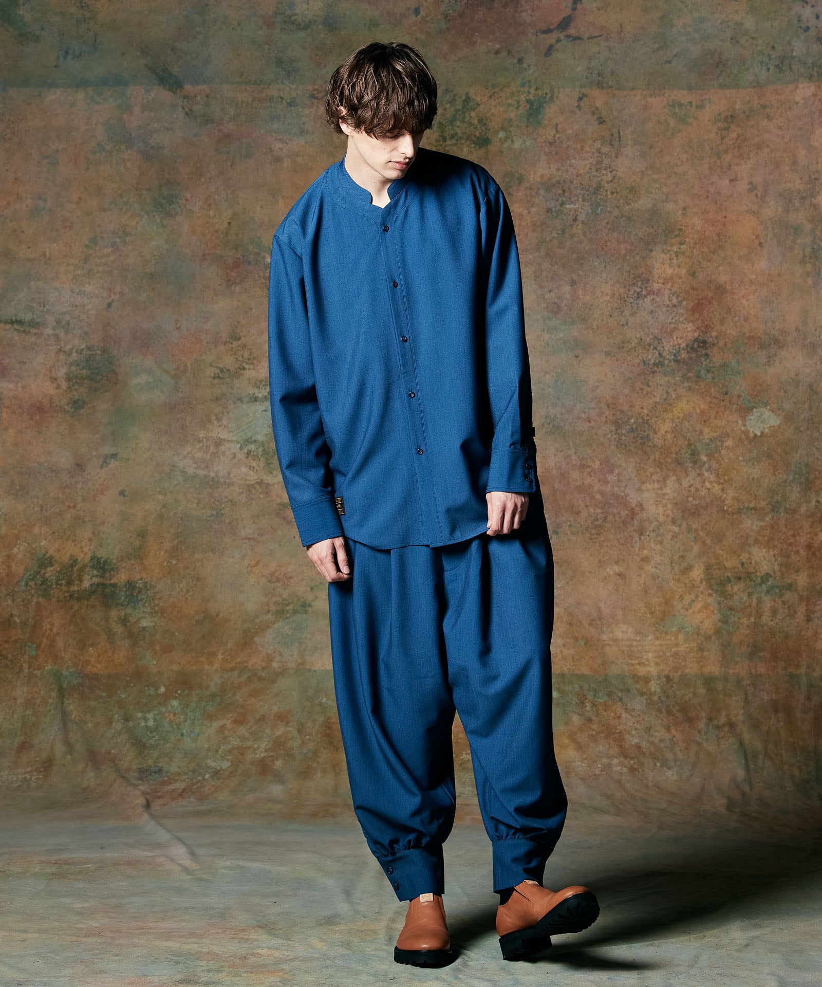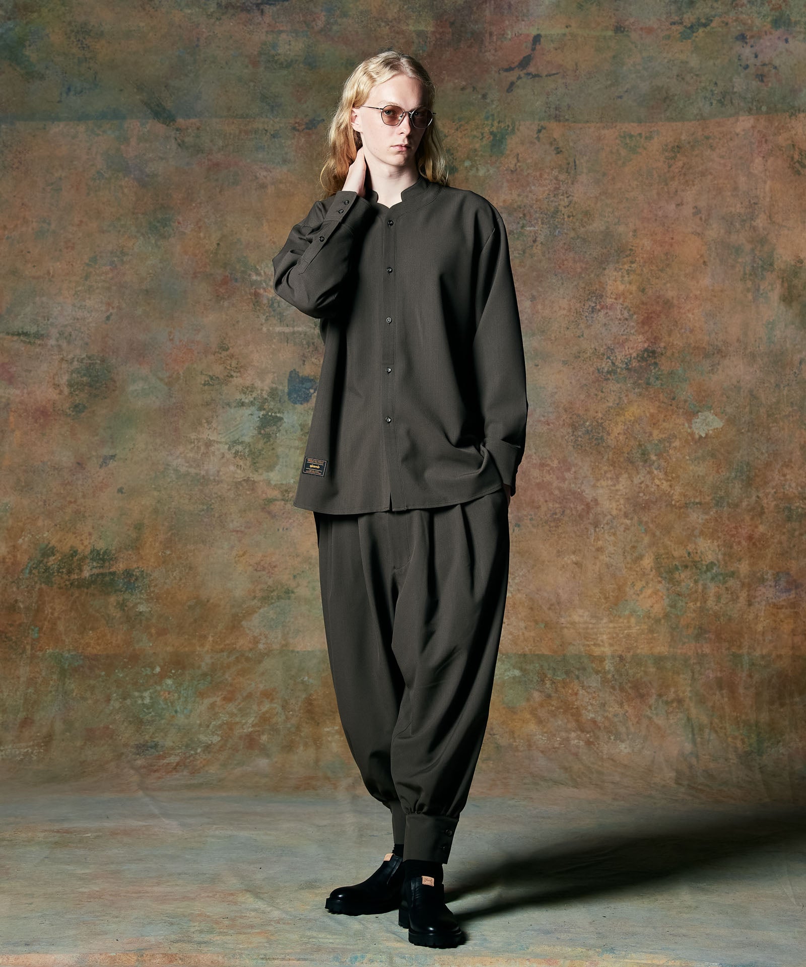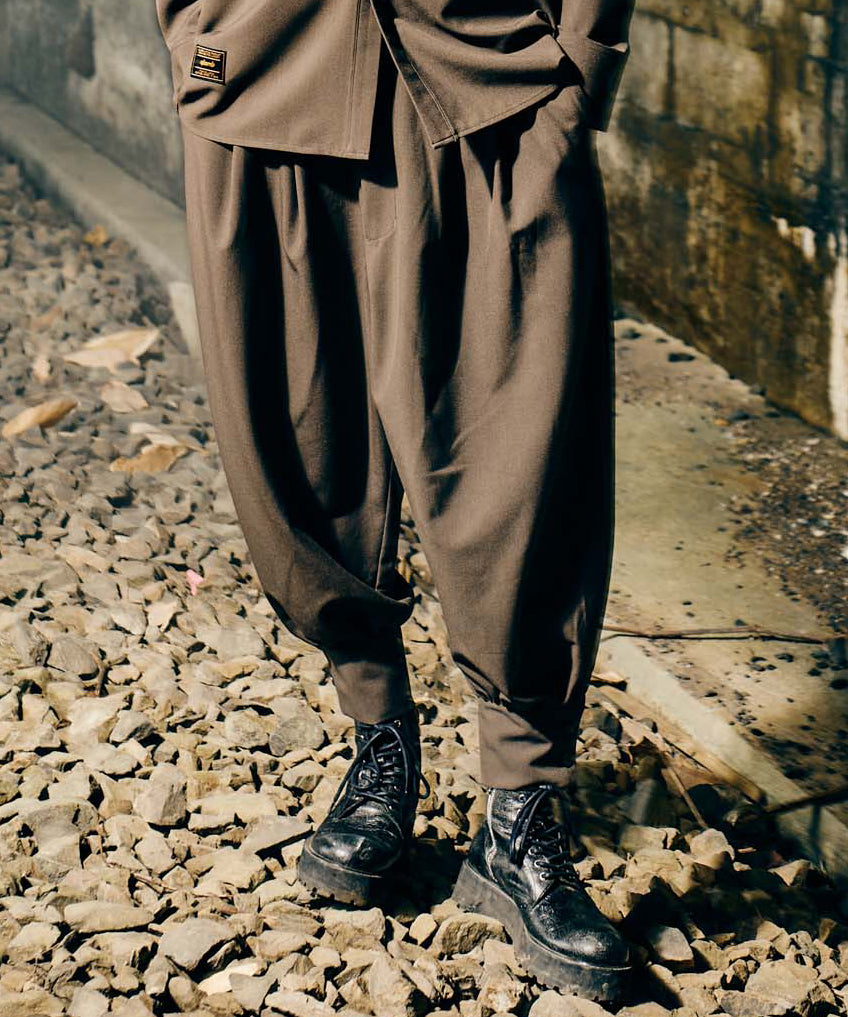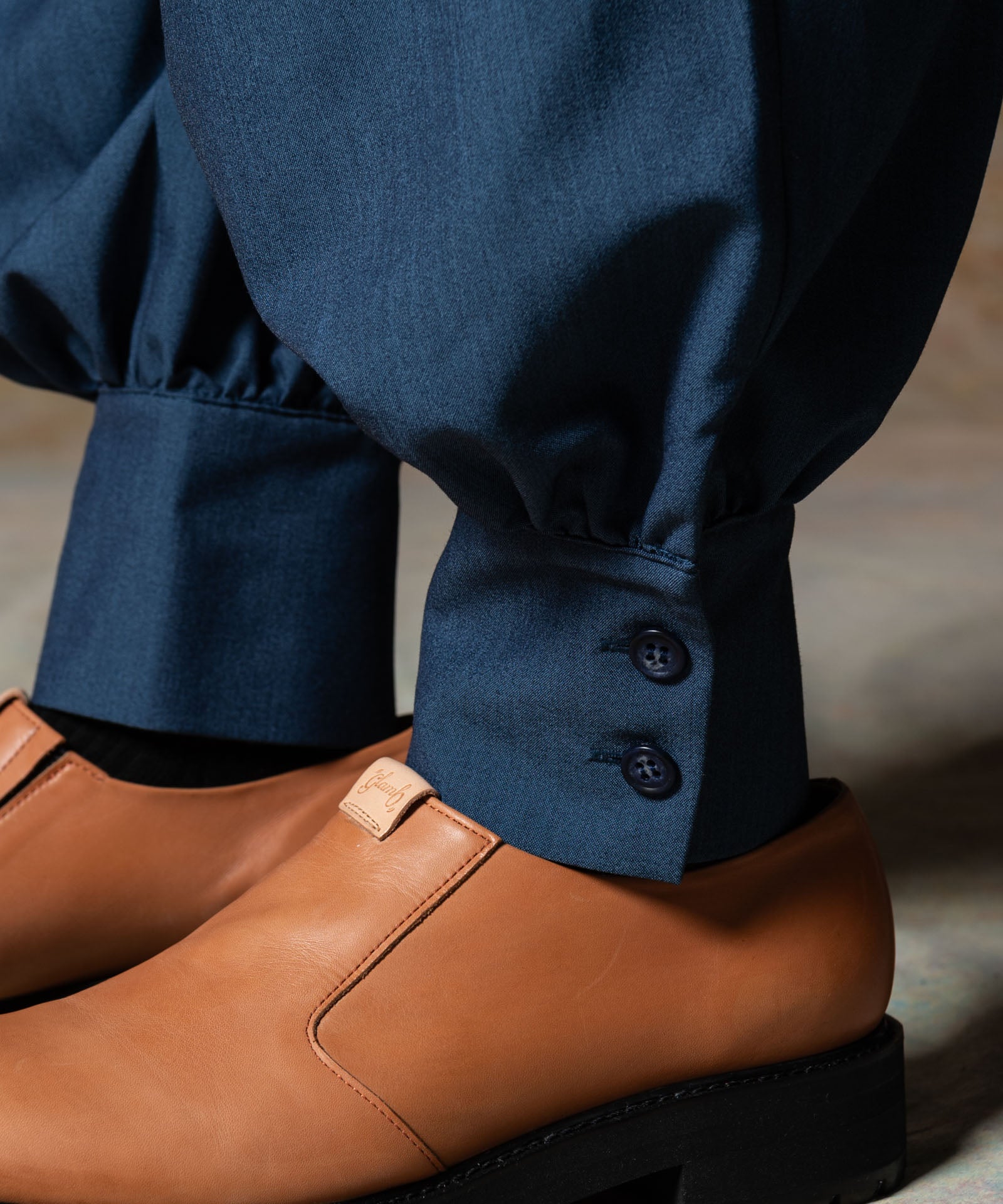 以衬衫为灵感设计的Mute Form Shirt Pants表现了前卫的下装风格。 轮廓是胯上深,腰上取2个褶边加上宽宽的卷度的萨尔埃尔轮廓。 仿照衬衫袖口的2颗纽扣的袖扣拉紧下摆,变化的脚线和glamb的玩心演出。 用于纺织品的是具有高雅光泽的人造丝混生面料。 也请一定要看看Deformed Shirt。