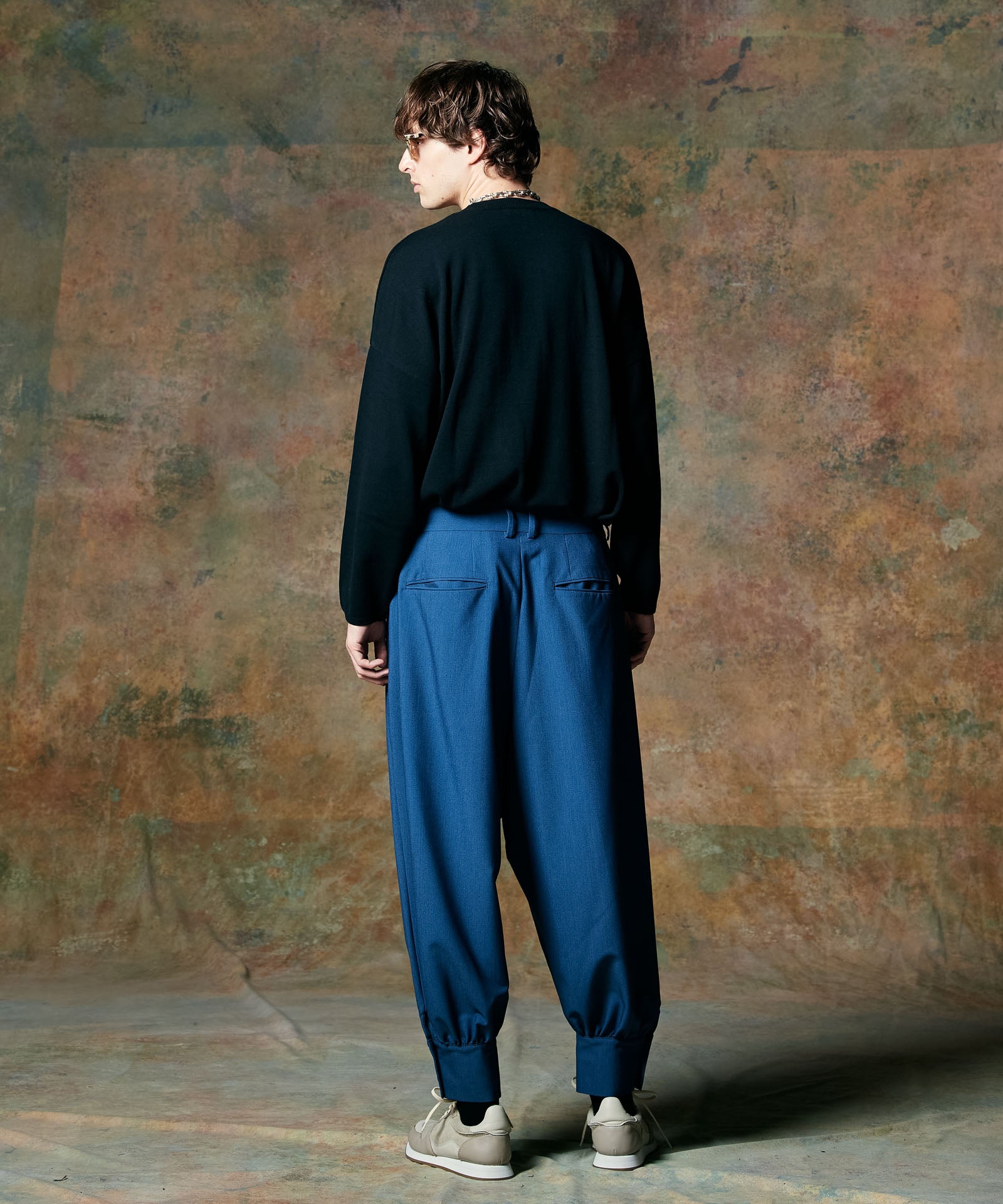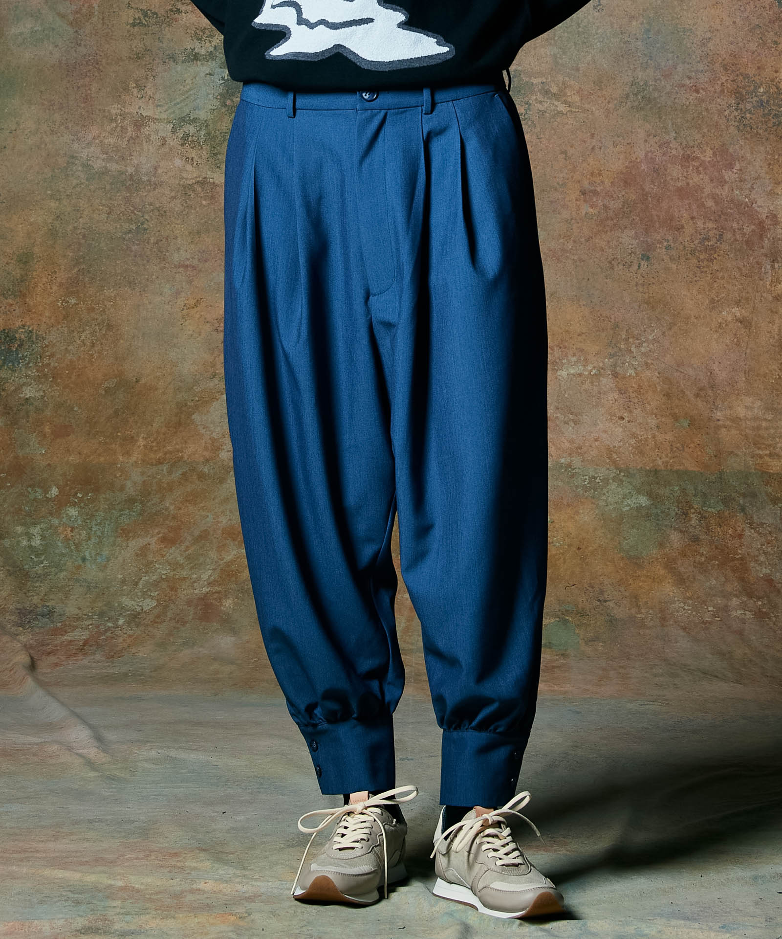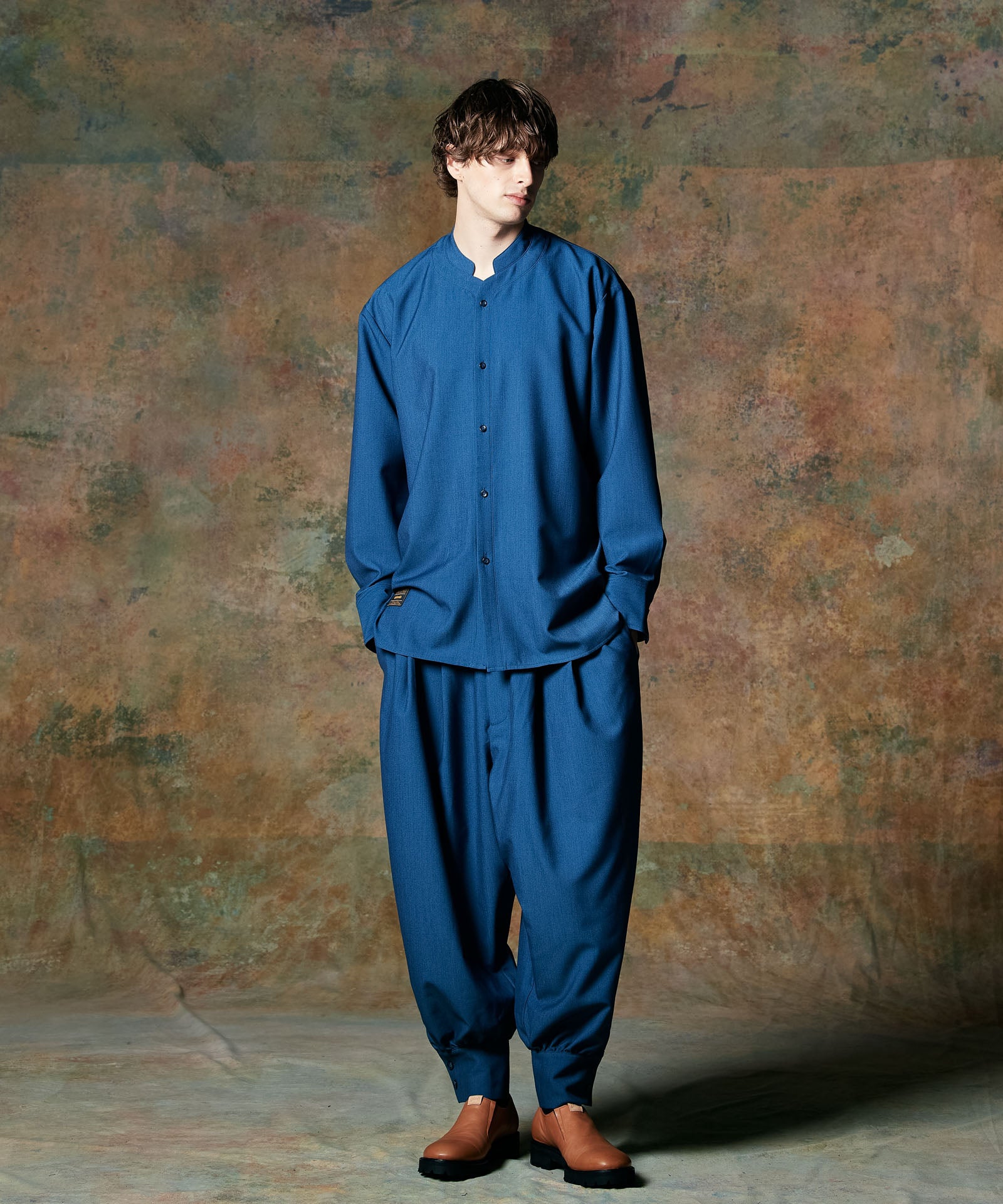 以衬衫为灵感设计的Mute Form Shirt Pants表现了前卫的下装风格。 轮廓是胯上深,腰上取2个褶边加上宽宽的卷度的萨尔埃尔轮廓。 仿照衬衫袖口的2颗纽扣的袖扣拉紧下摆,变化的脚线和glamb的玩心演出。 用于纺织品的是具有高雅光泽的人造丝混生面料。 也请一定要看看Deformed Shirt。