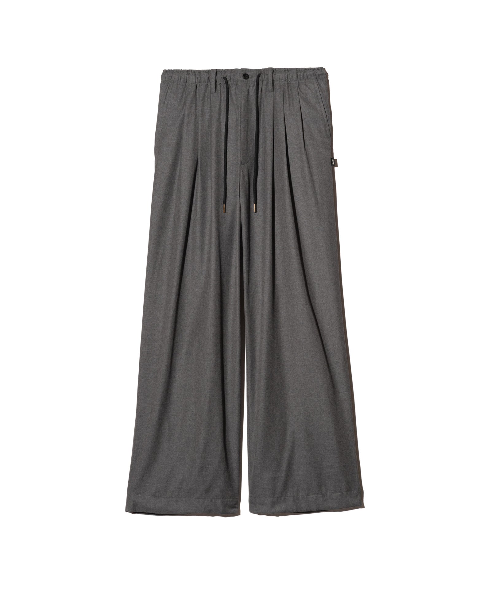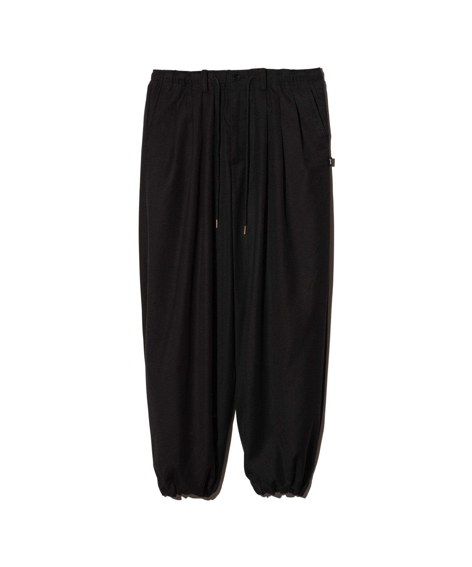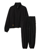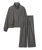 Monolith Track Blouson Set Up将礼服和运动结合在一起。 使用了在纺织品中包含有跌落感的人造丝的弹力质地制作了。 宽轮廓的上衣由于颈部高领的事都市的轮廓。 袖口和下摆也采用了小褶子,更加强调了坚实的印象。 下装用左右6个褶裥构筑了气球状的巴基轮廓。 腰部的拉绳式样之外,橡胶式样的下摆在主轴上幅度调整成为可能,根据情况和条件合起穿着的感觉能调整。