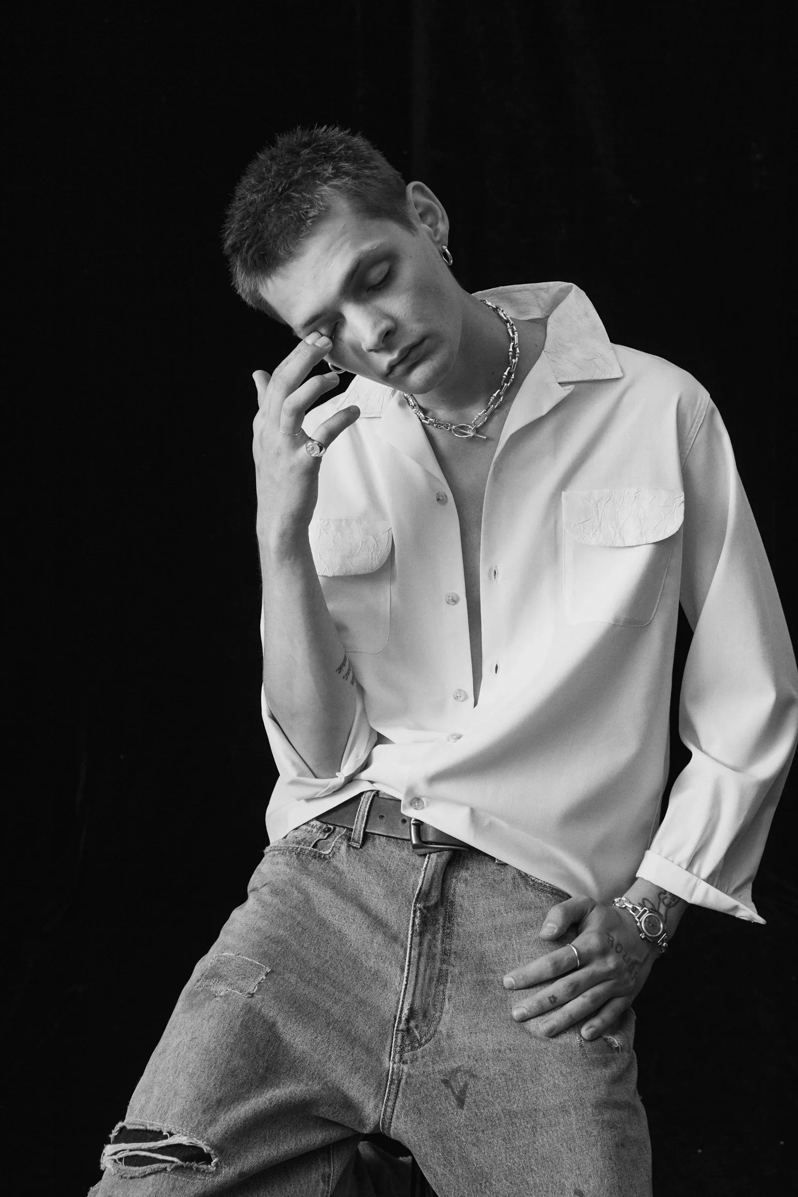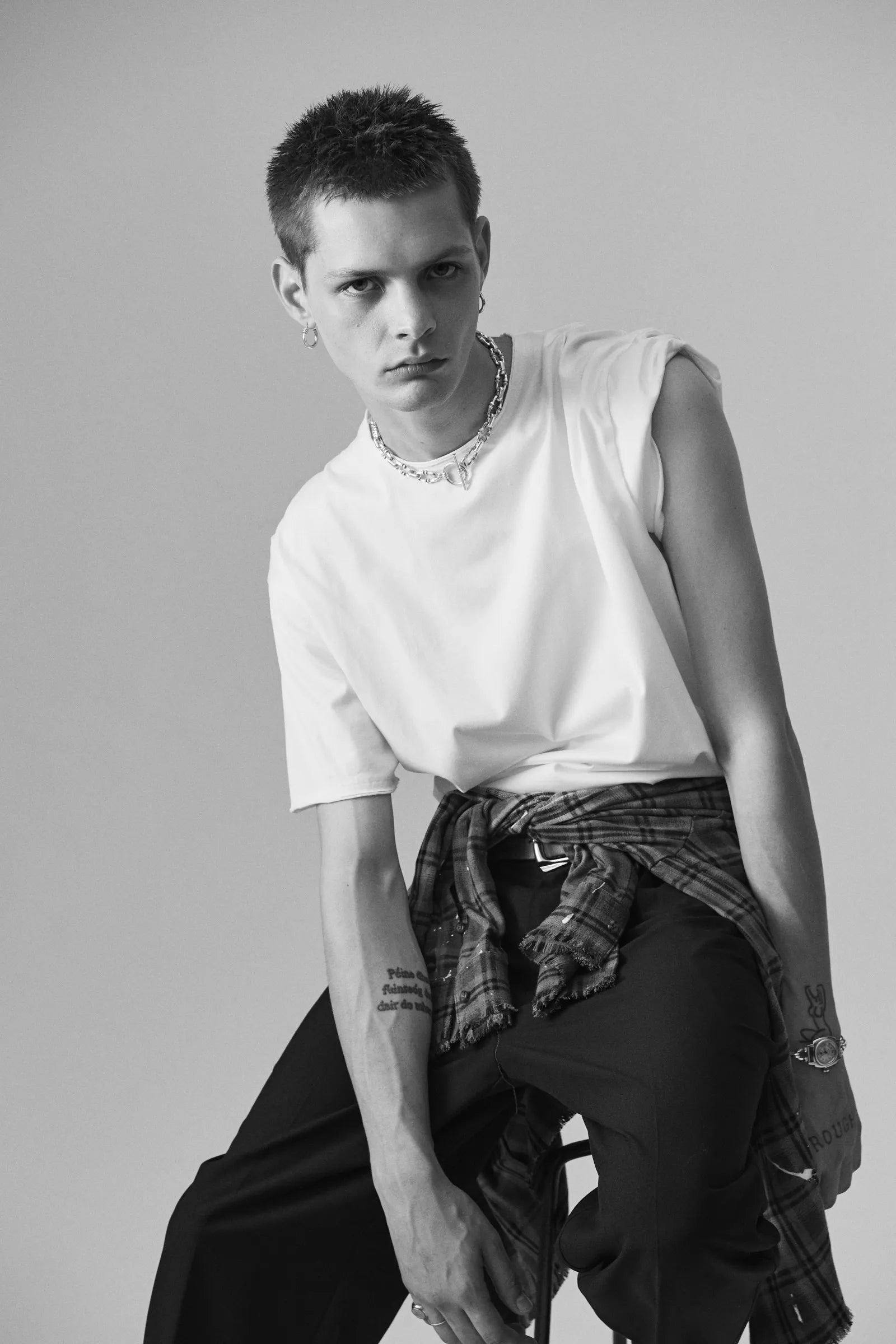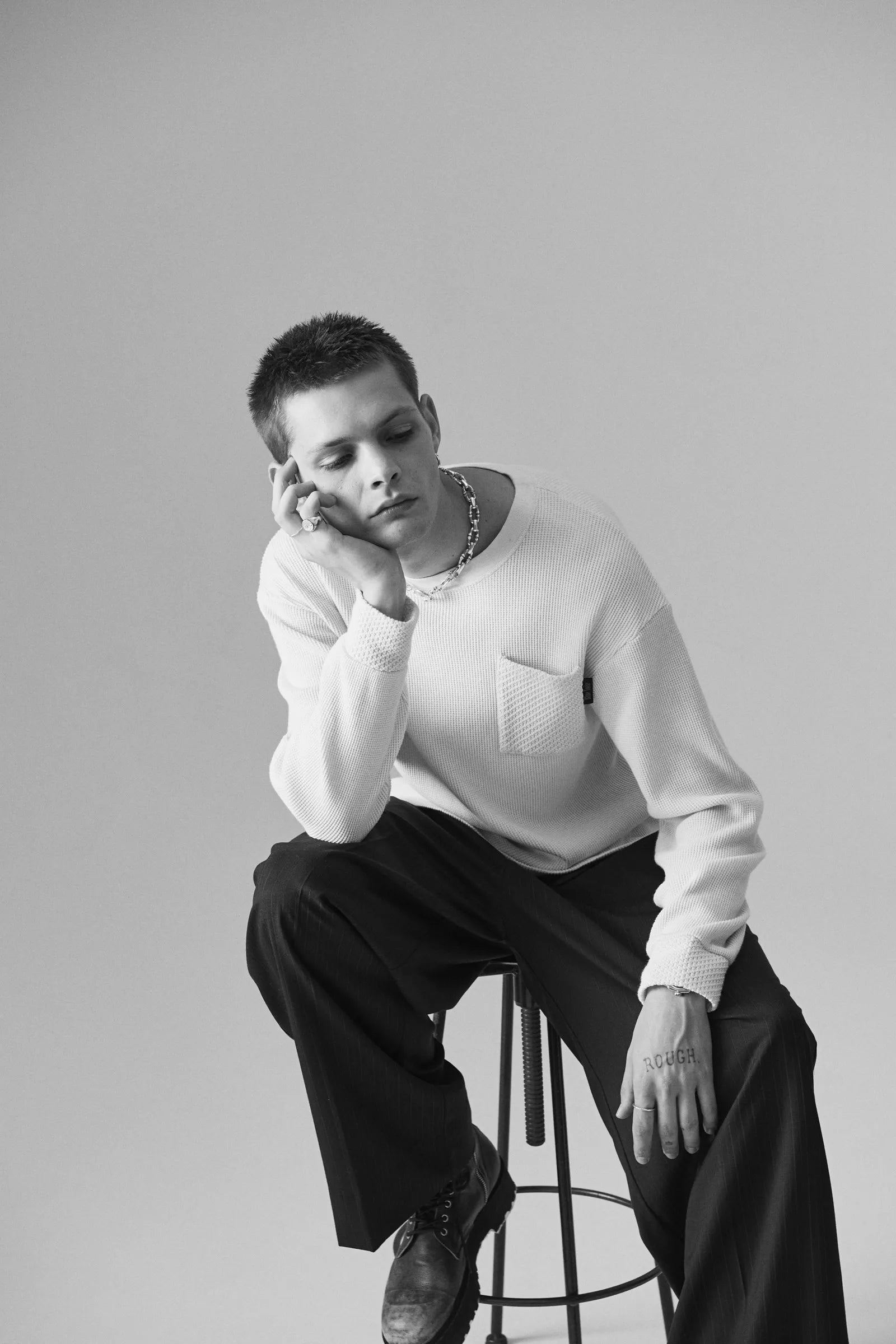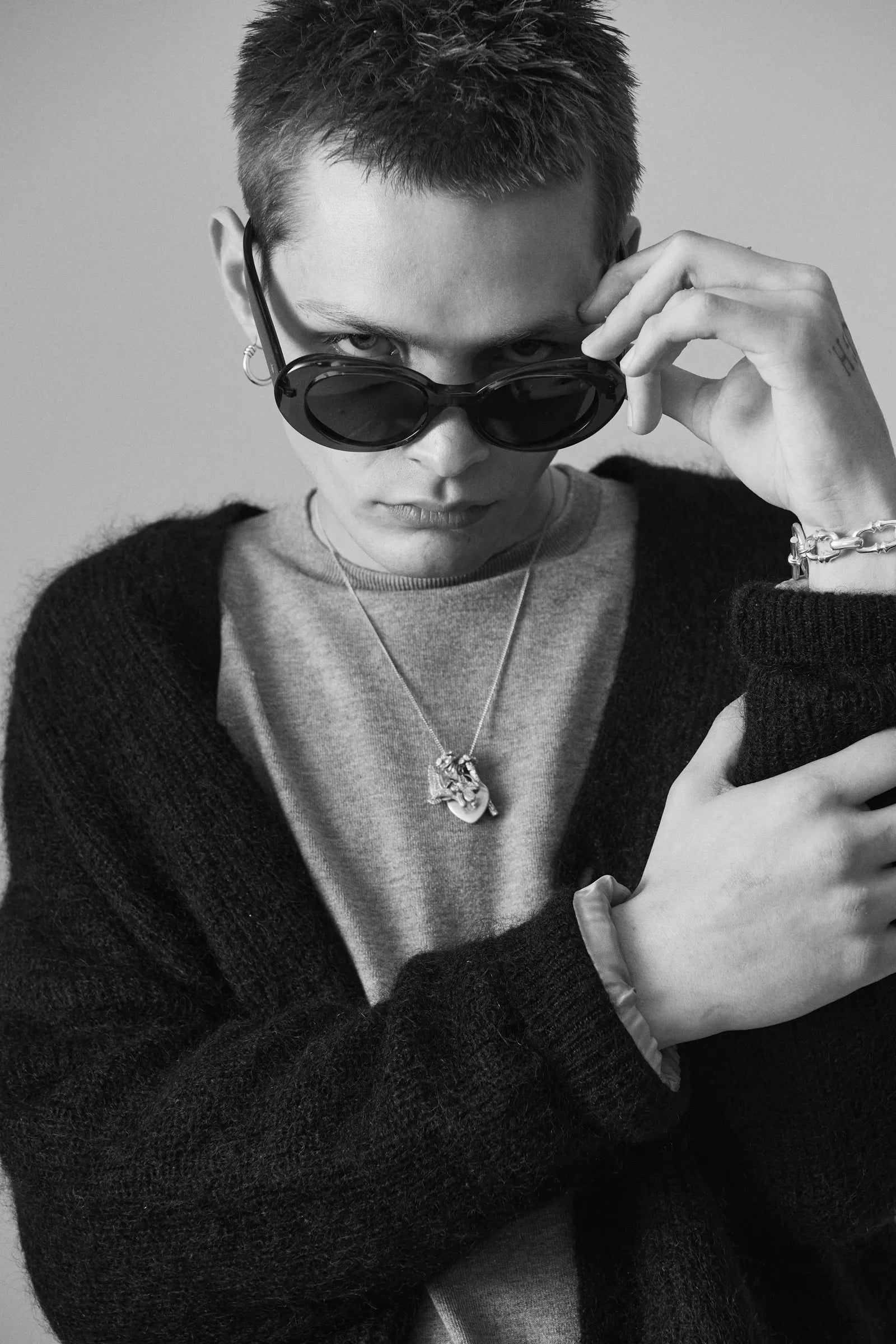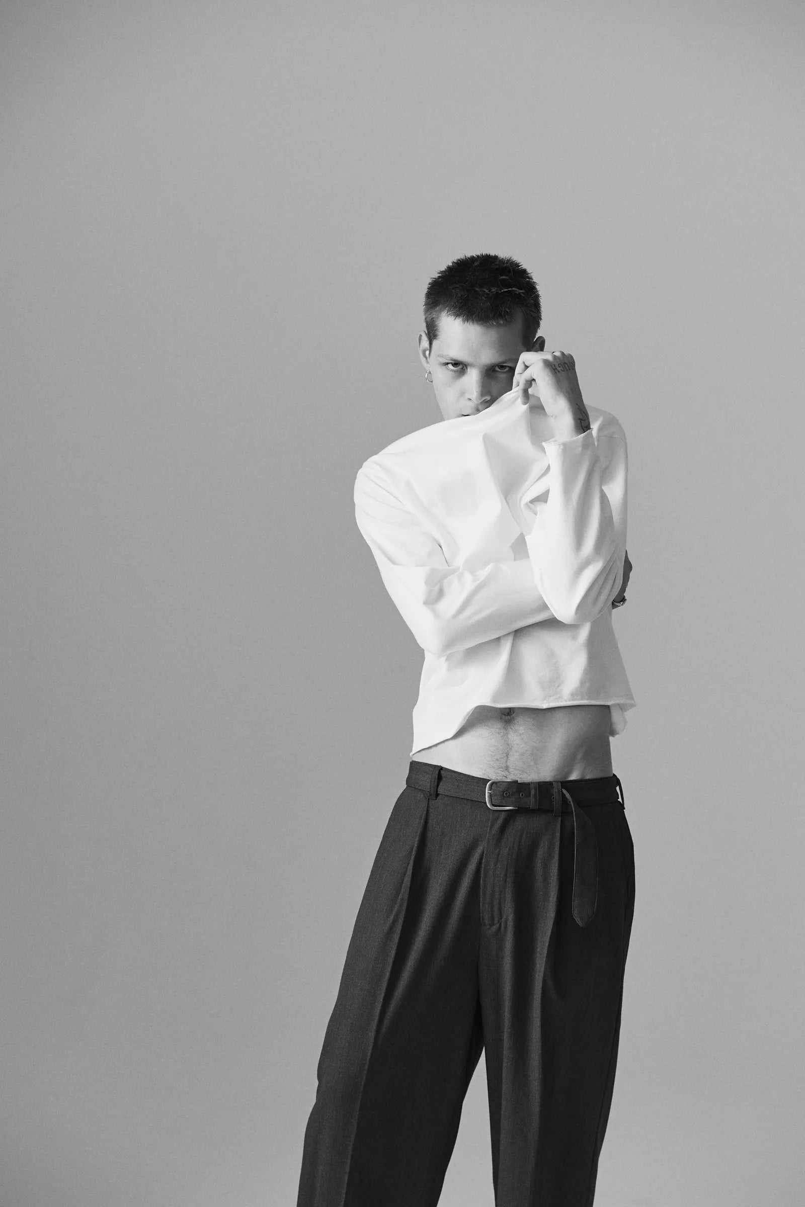 ブルーノイズが僕が“Rebirth”と同時に今季表現したかったglambとしての“シンプル”の在り方だった。意見がない人間はつまらない。色や柄によって武装する足し算ではなく、物や人としての存在価値を剝き出しにする引き算を僕は試みた。僕はまた眠れぬ夜に怯えながら、この15型をBlue Noiseと名付けてあなたの心に突き刺すことにした。