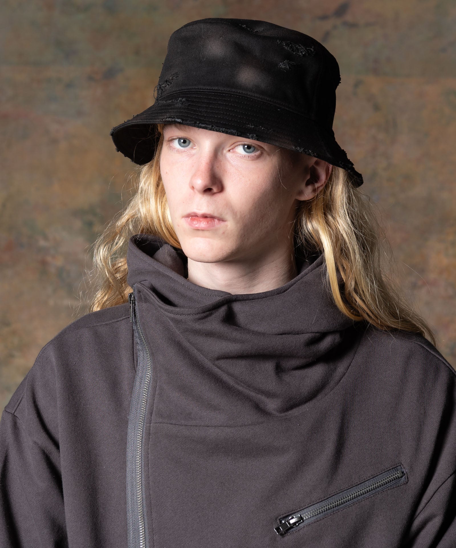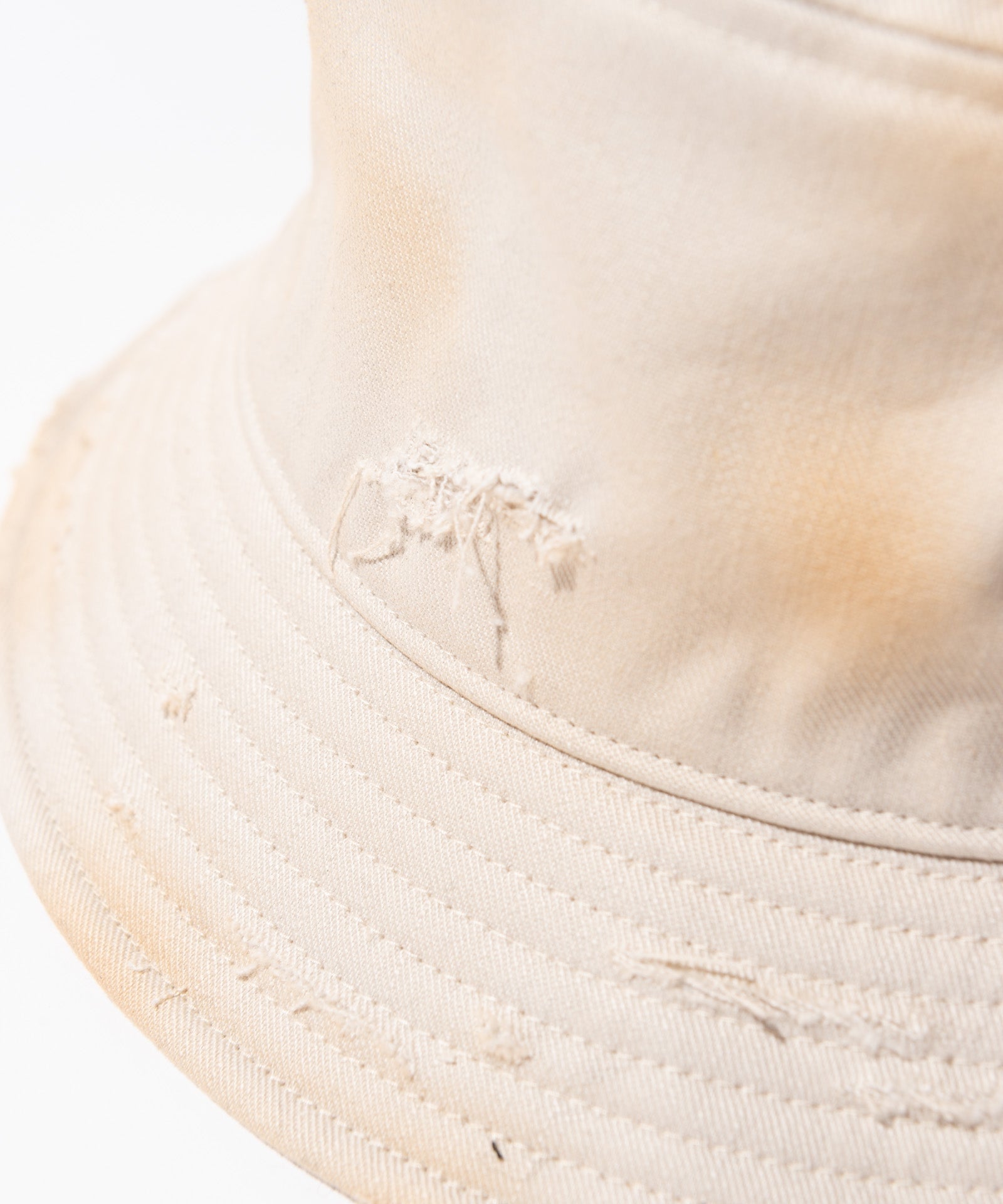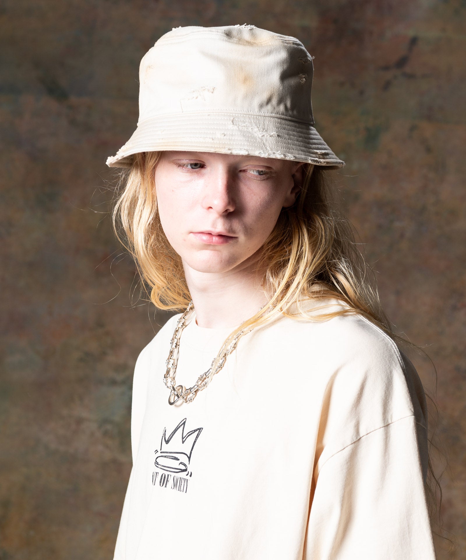 这款Damage Bucket Hat的特点是在斗帽上经过工匠1点1点的损坏加工而成的工艺精湛的饰面。 边部分细取的固体的剪影和内侧的尺寸调整皮带这样的细节品牌的基本款,不过,决定本作品的是那个加工。 随处可见的损坏,加上让人联想到生锈的污染,打造出了让人联想到流浪者的逼真形象。