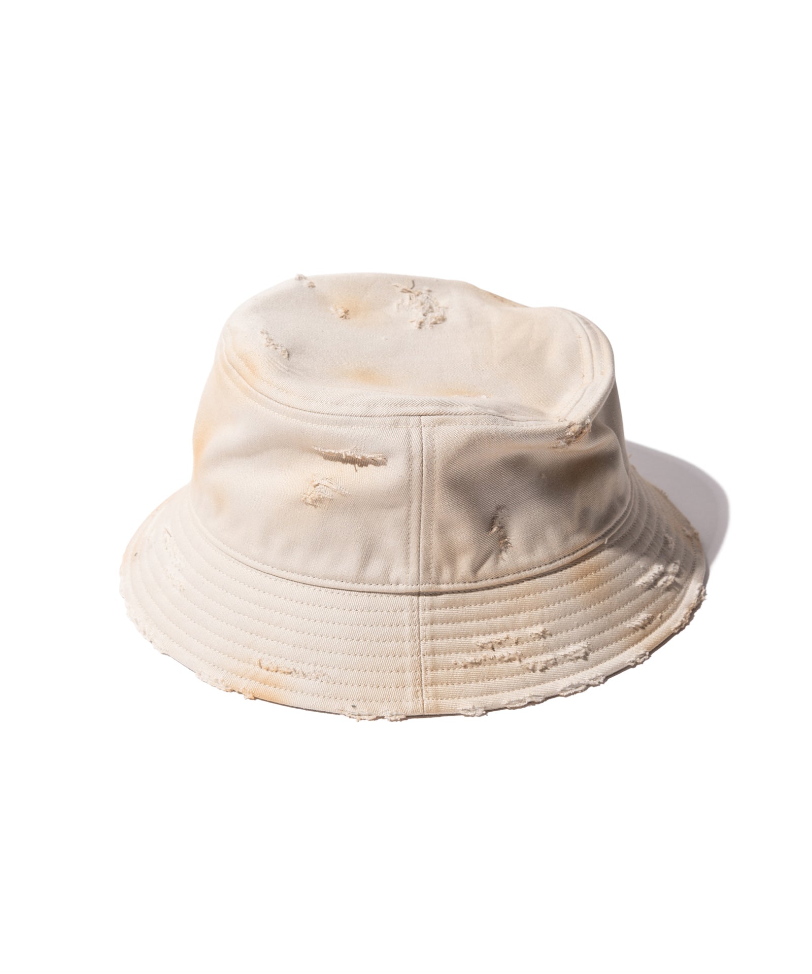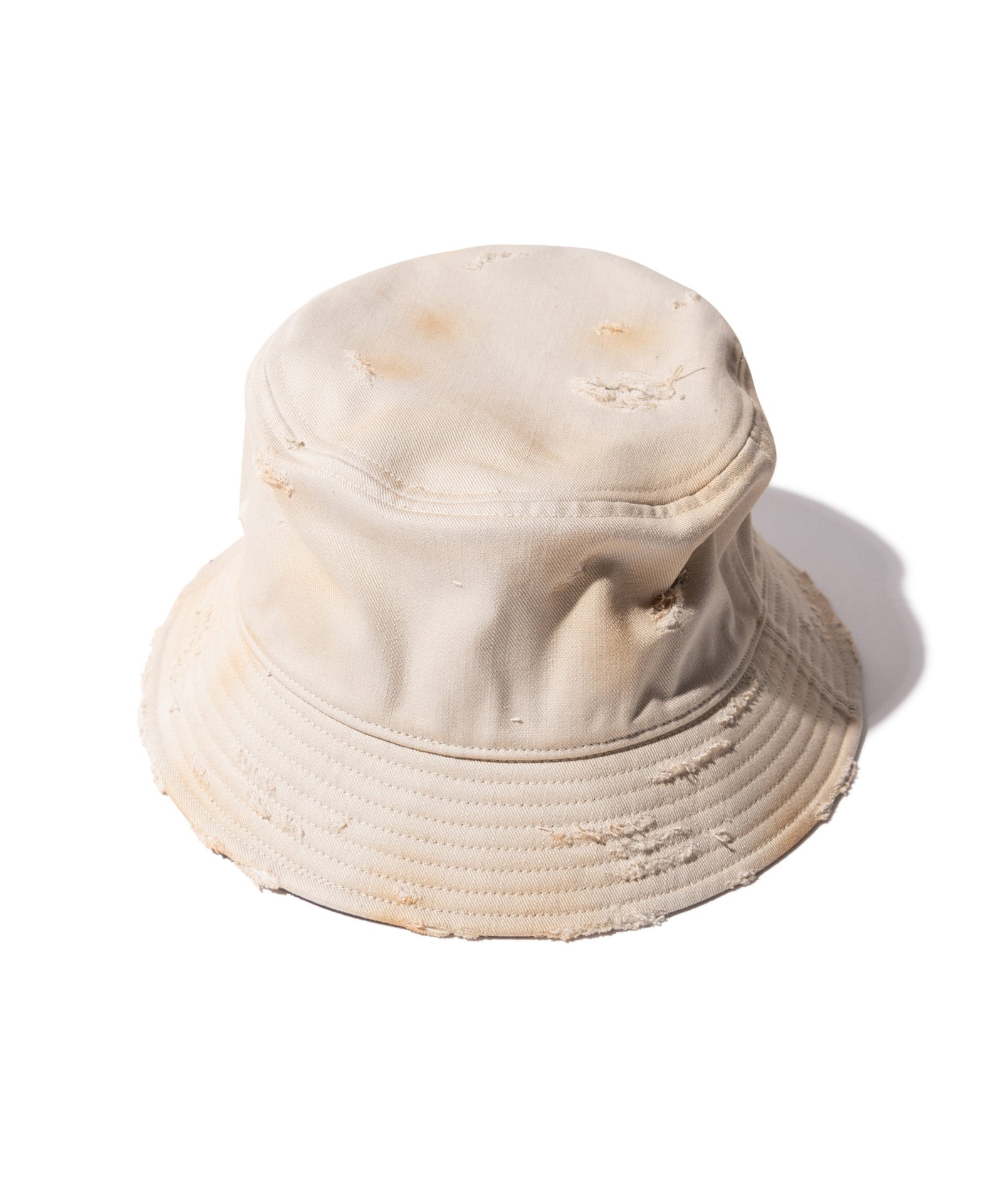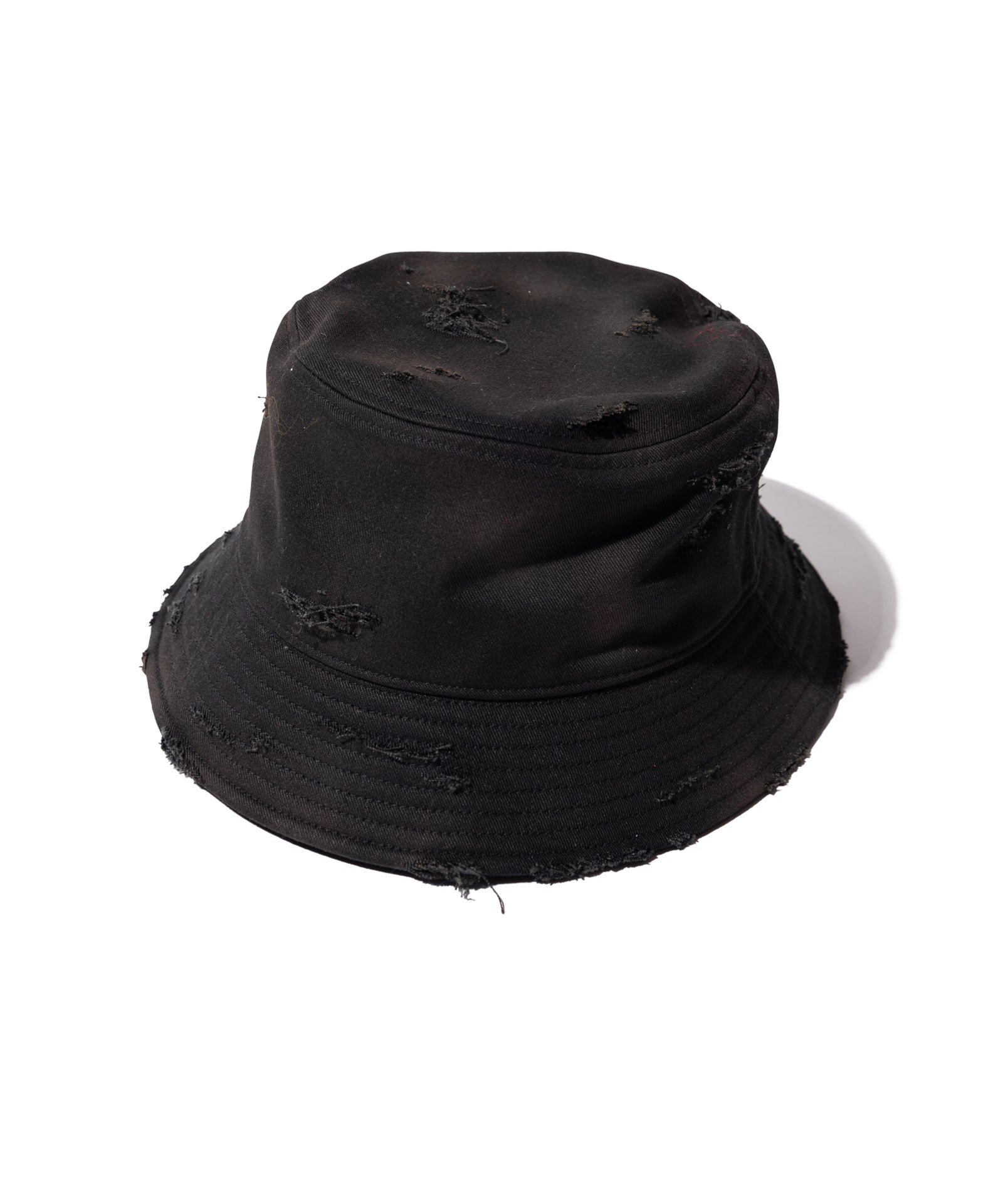 这款Damage Bucket Hat的特点是在斗帽上经过工匠1点1点的损坏加工而成的工艺精湛的饰面。 边部分细取的固体的剪影和内侧的尺寸调整皮带这样的细节品牌的基本款,不过,决定本作品的是那个加工。 随处可见的损坏,加上让人联想到生锈的污染,打造出了让人联想到流浪者的逼真形象。