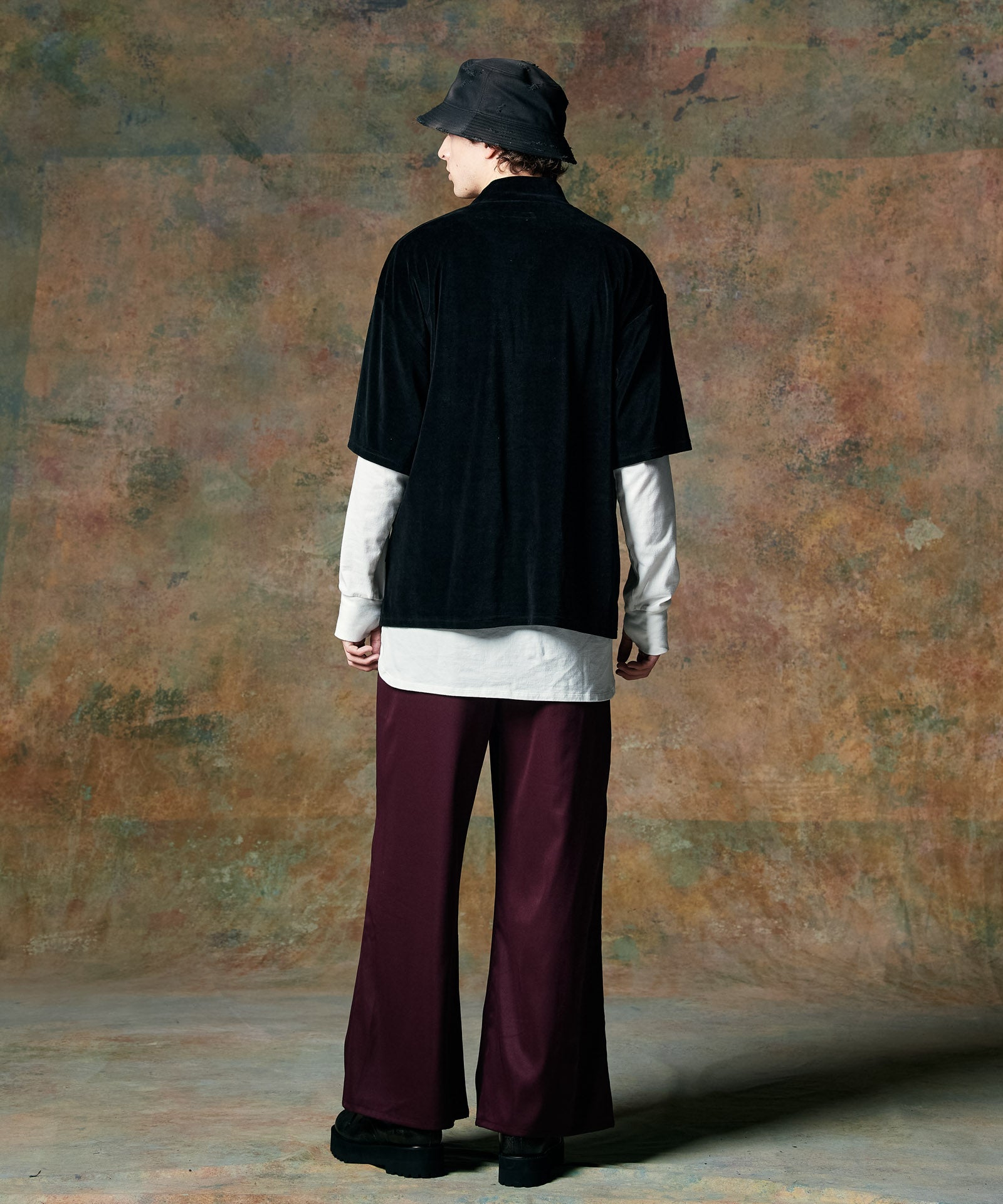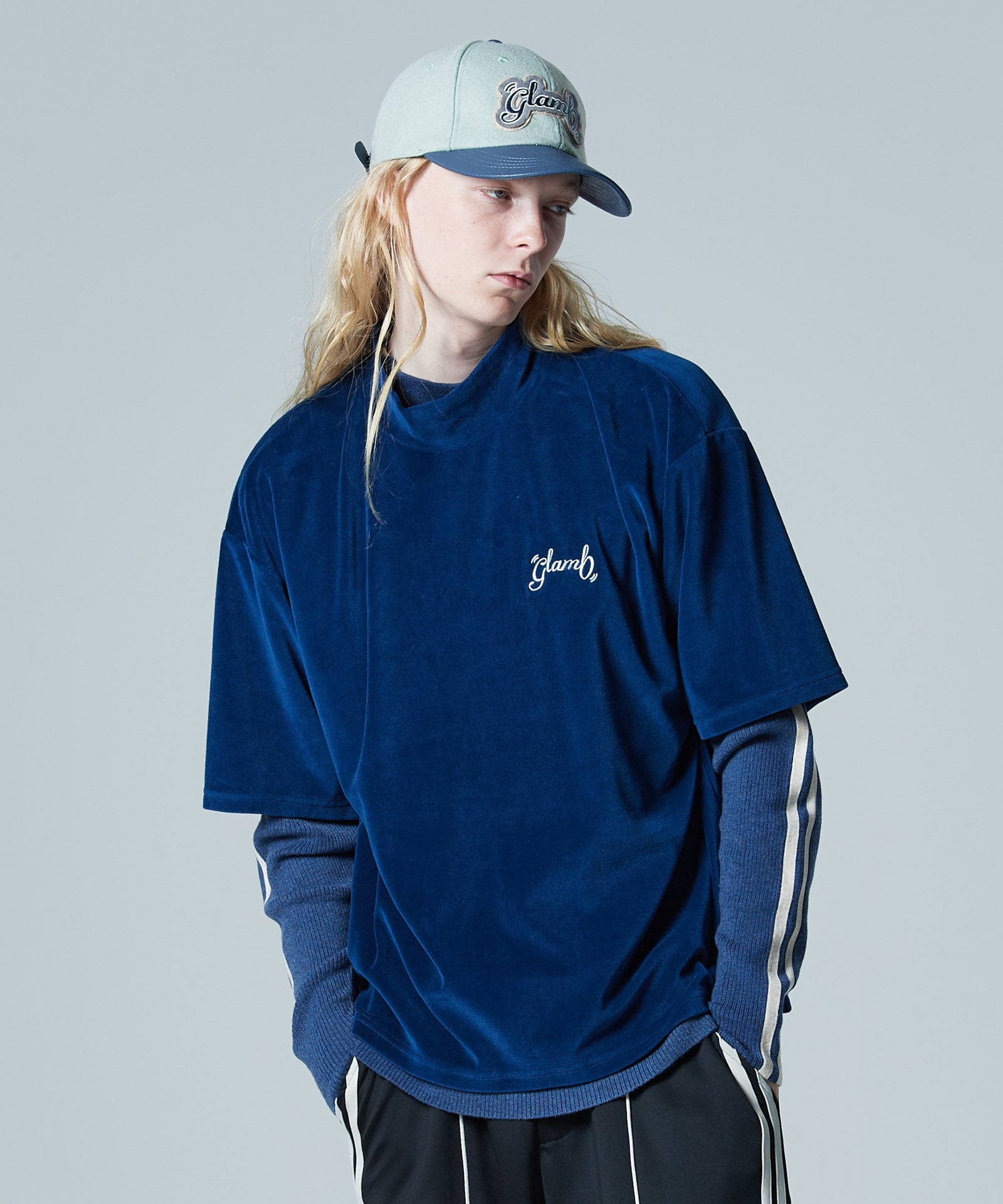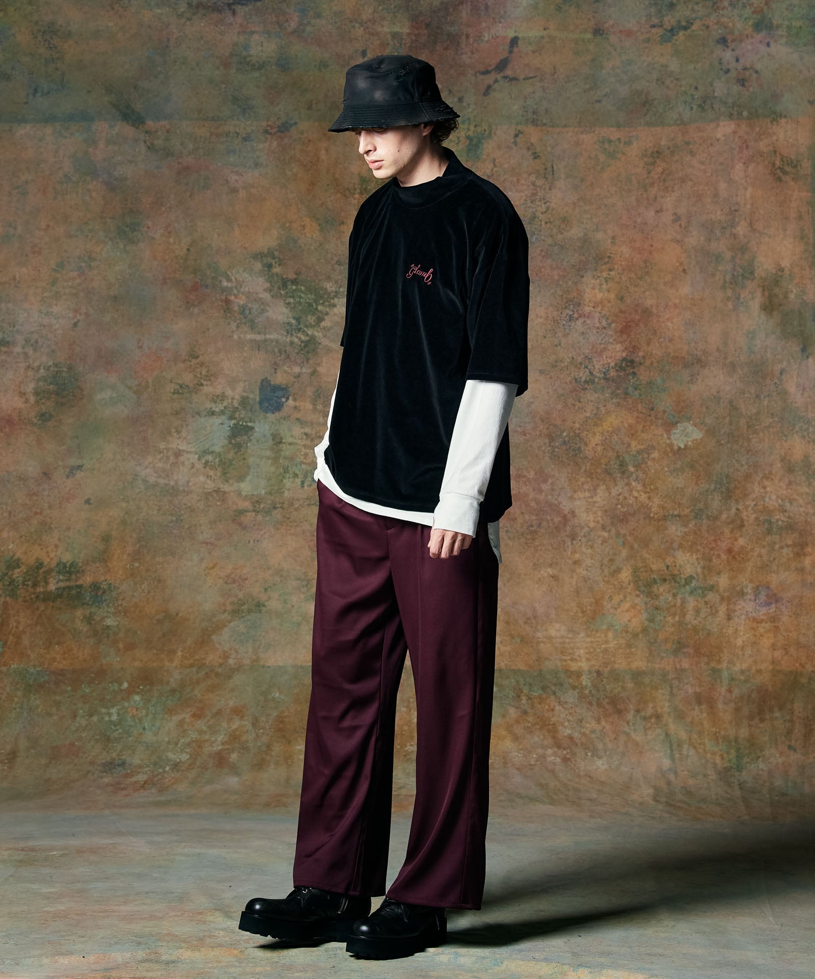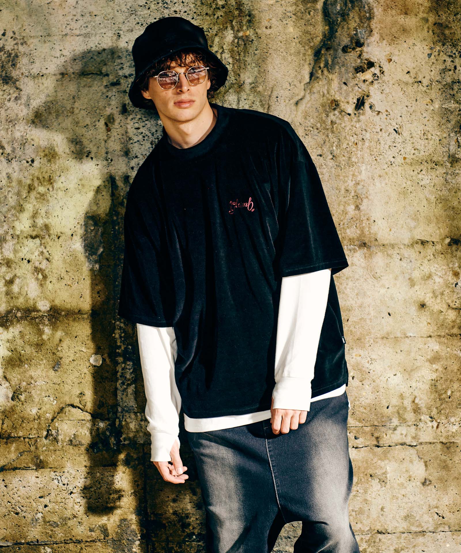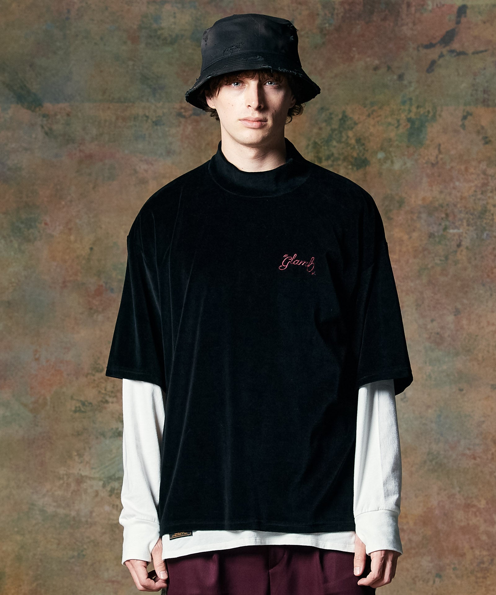 Velour Mock Neck Cutsew根据品牌玩心十足的图案设计对秋冬的内装进行全新提案。 超大号的身体是露肩袖的宽松袖子。 开衩前后拉开差距的长度感增添了重点。 纺织用的是天鹅绒面料。 在长袖T恤等上面叠一层的话,素材感也相结合,实现了奢华的街头风格。