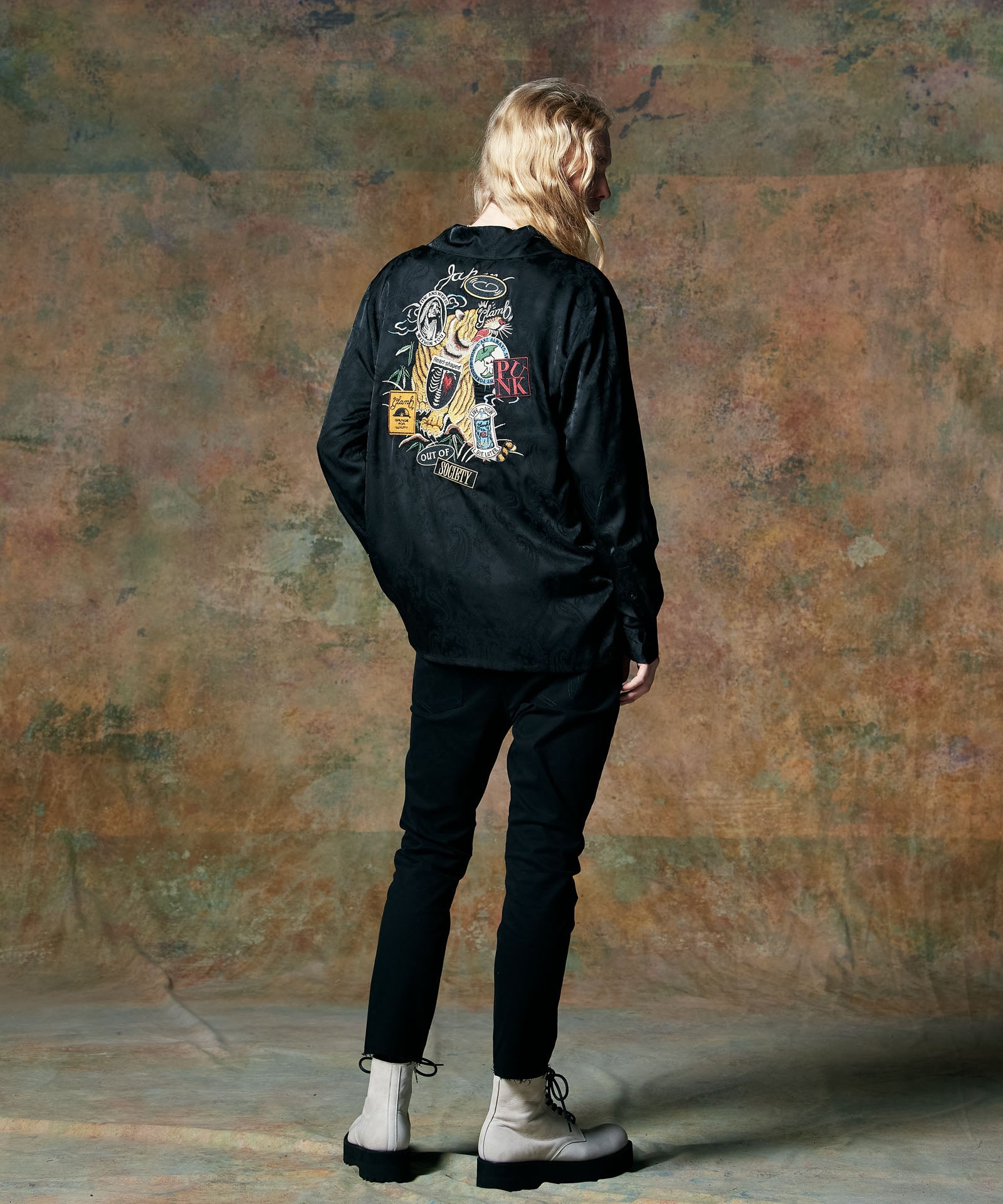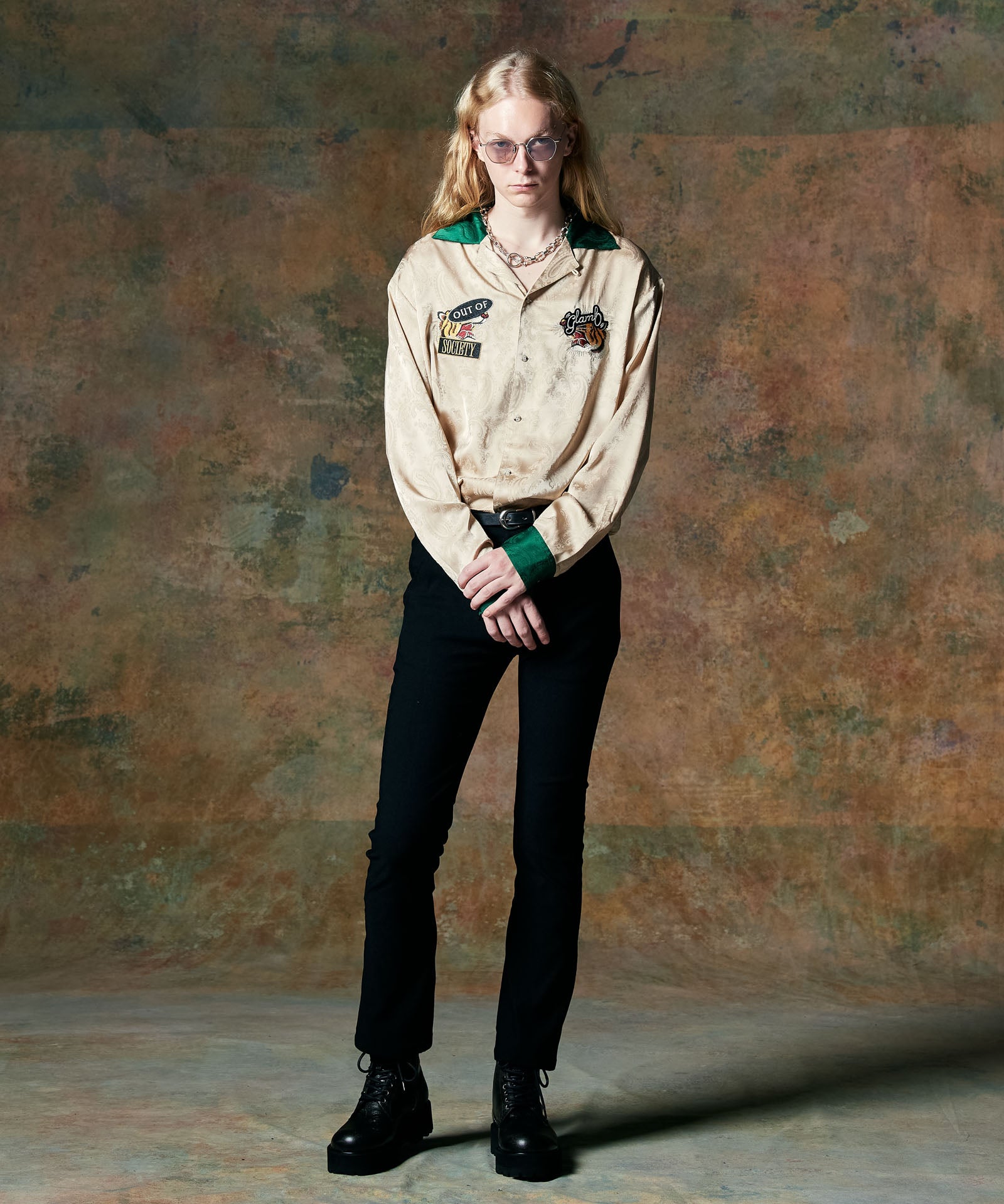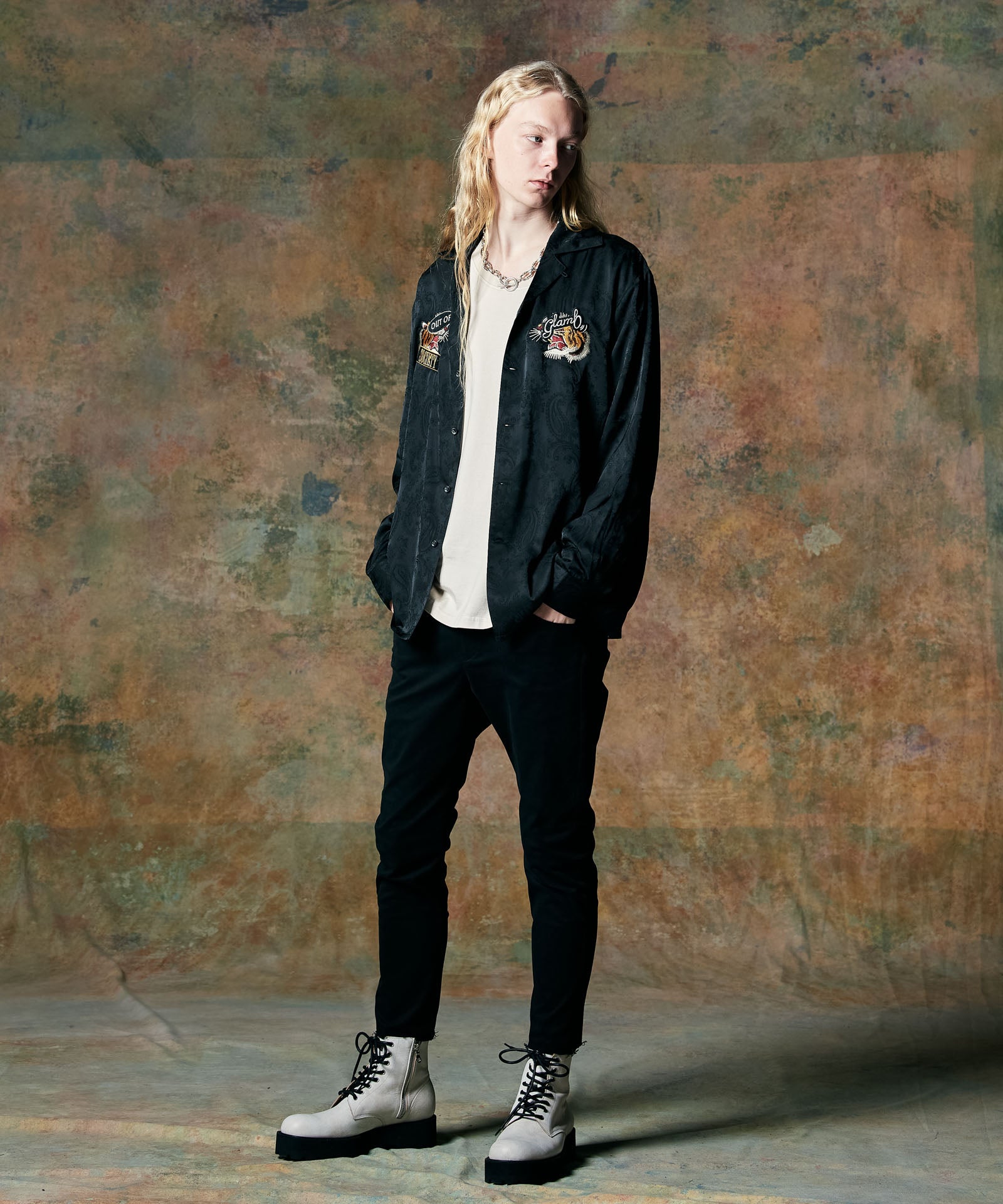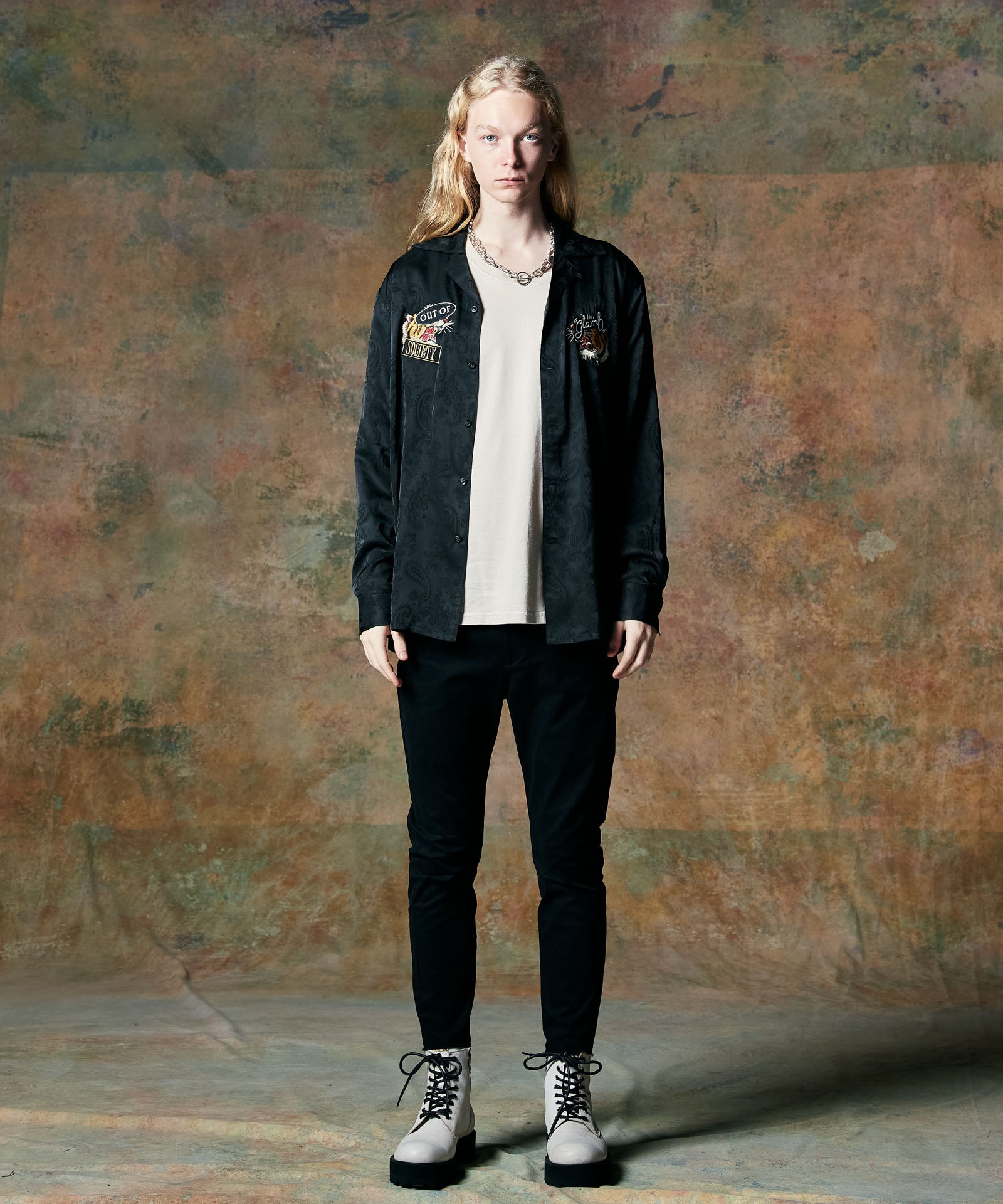 将纪念夹克的设计融入衬衫的Out of Society Ska Shirt。 咆哮的老虎图案上点缀着品牌logo和本季系列主题,以及最近品牌的象征图案。 徽章上能看到的部分也全部用刺绣装饰,抑制厚度,从单品穿着到叠穿都带来了搭配的好处。 有放松气氛的身体使用在纺织品显出琉克斯的光泽的佩斯利花纹提花缎。 开领衬衫的野性和质地、刺绣的优质纹理相辅相成,将原始风格升华为奢华的1枚。