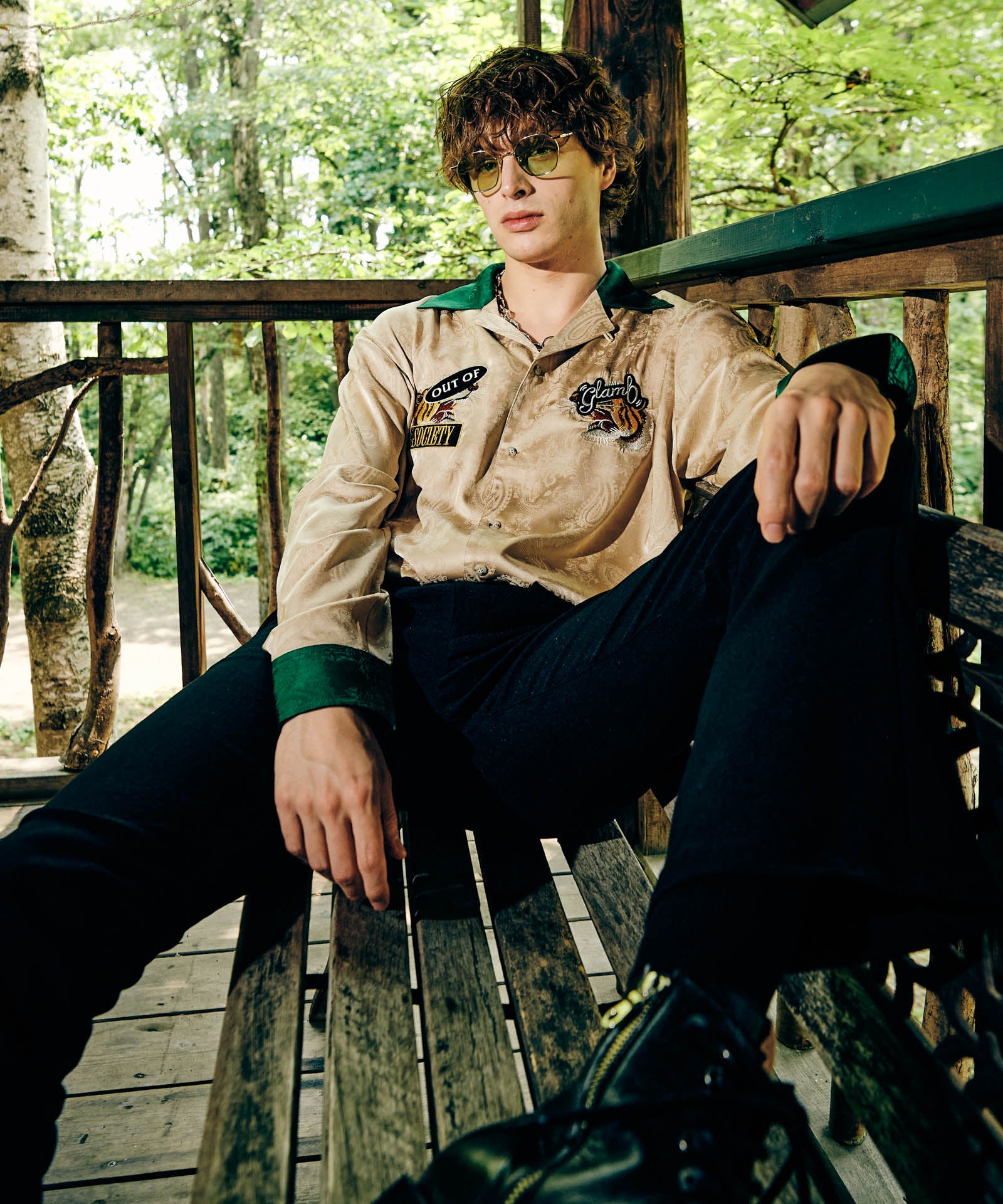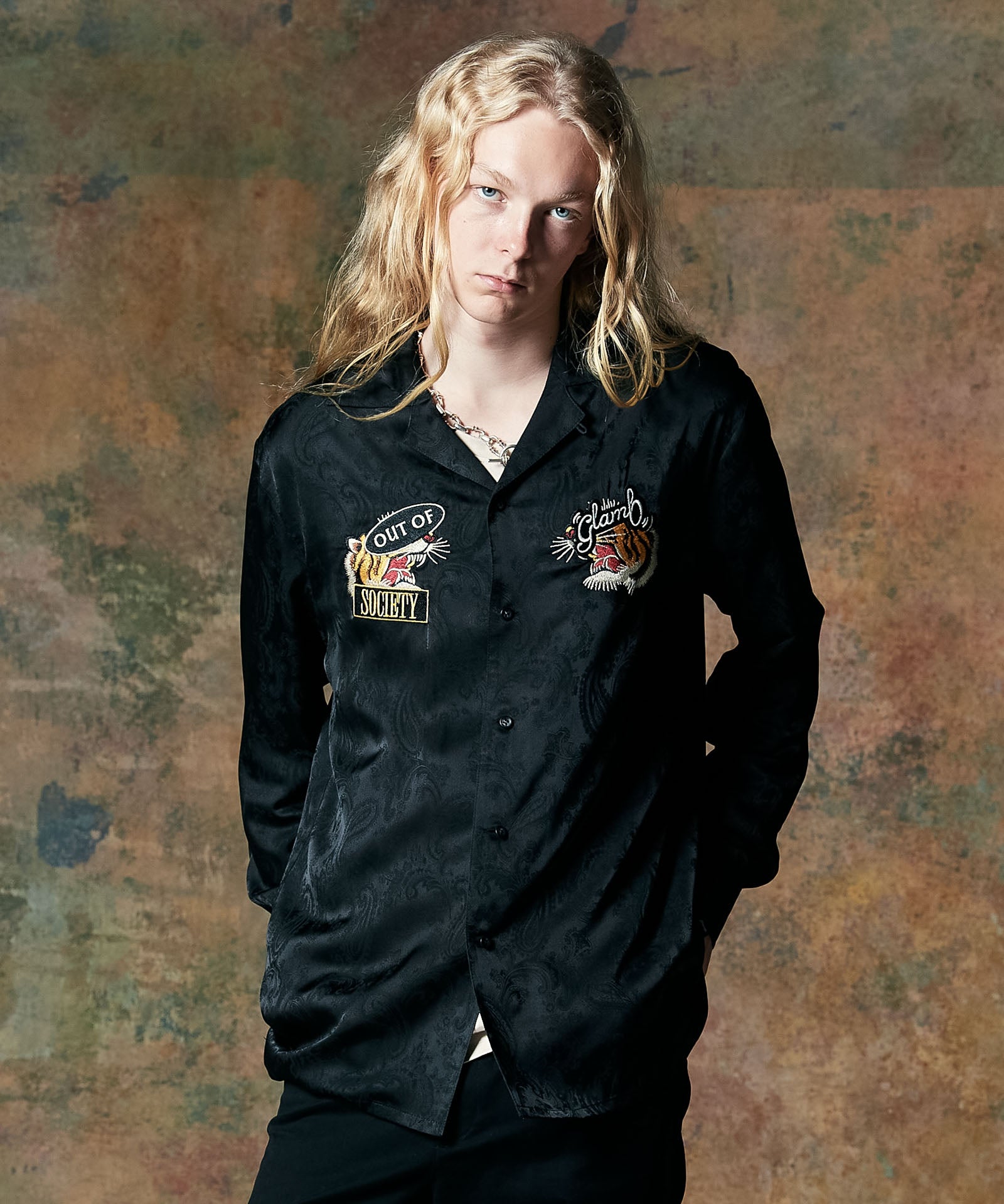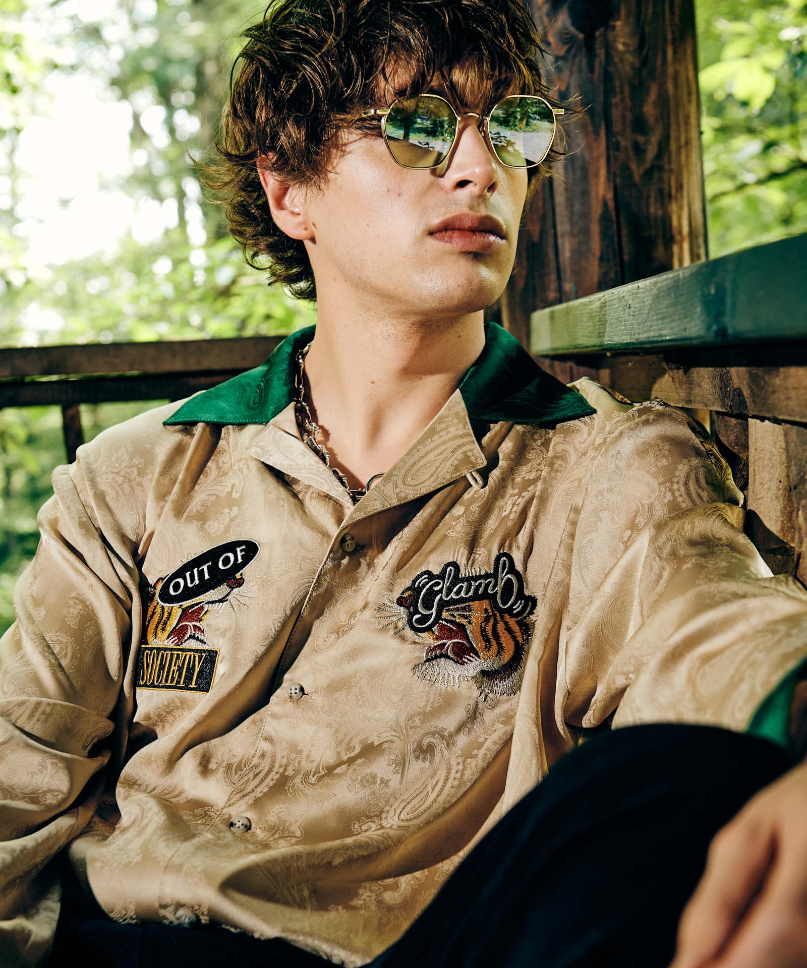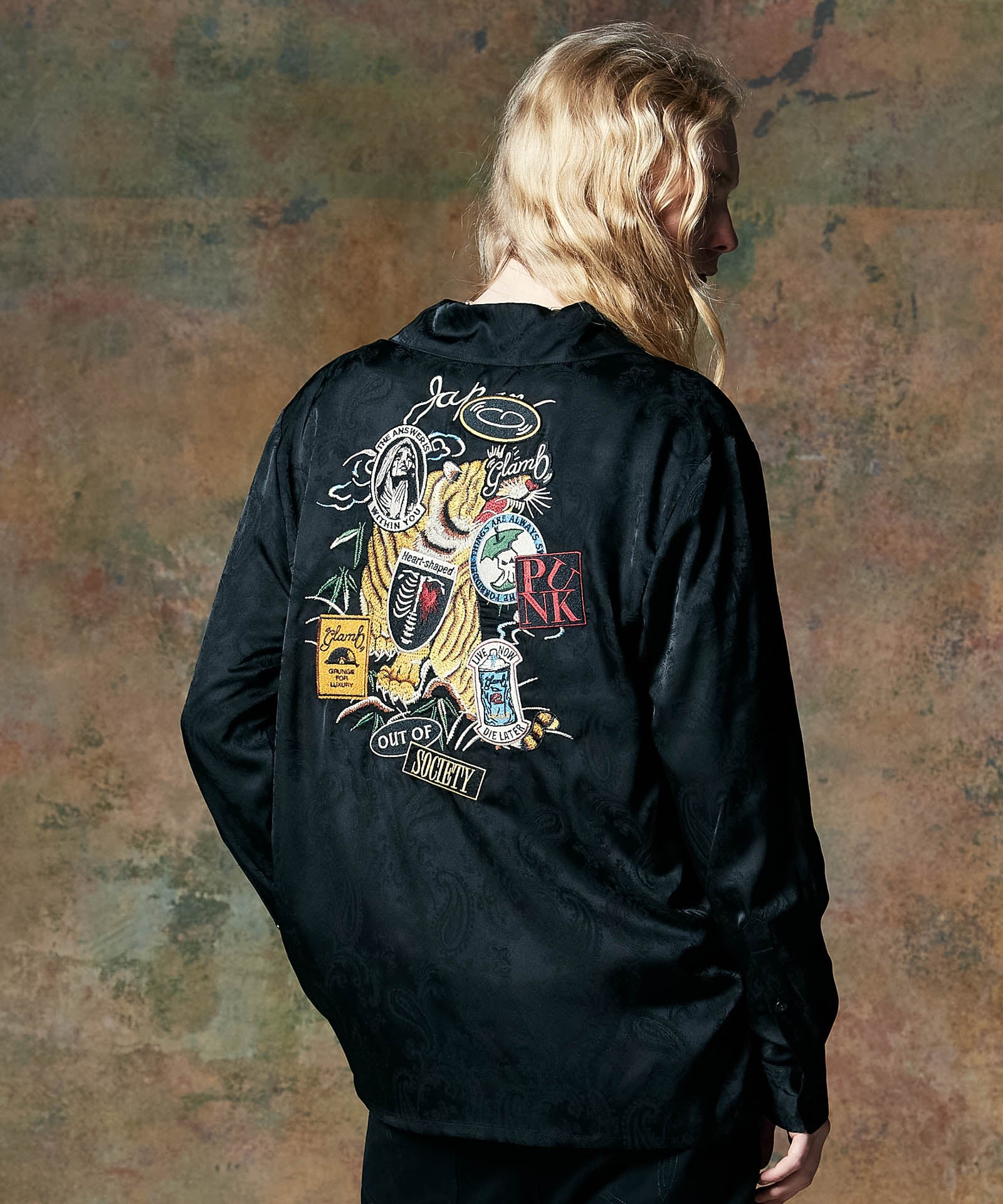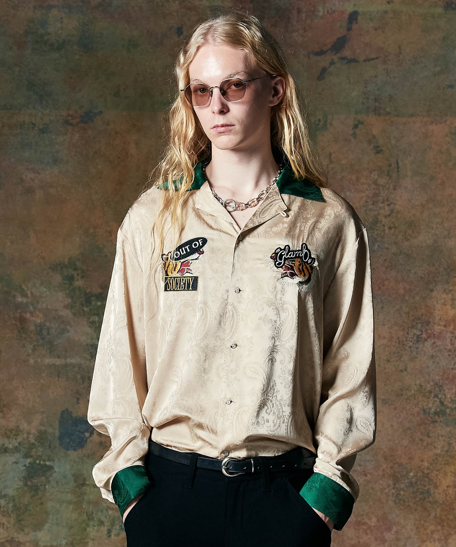 将纪念夹克的设计融入衬衫的Out of Society Ska Shirt。 咆哮的老虎图案上点缀着品牌logo和本季系列主题,以及最近品牌的象征图案。 徽章上能看到的部分也全部用刺绣装饰,抑制厚度,从单品穿着到叠穿都带来了搭配的好处。 有放松气氛的身体使用在纺织品显出琉克斯的光泽的佩斯利花纹提花缎。 开领衬衫的野性和质地、刺绣的优质纹理相辅相成,将原始风格升华为奢华的1枚。