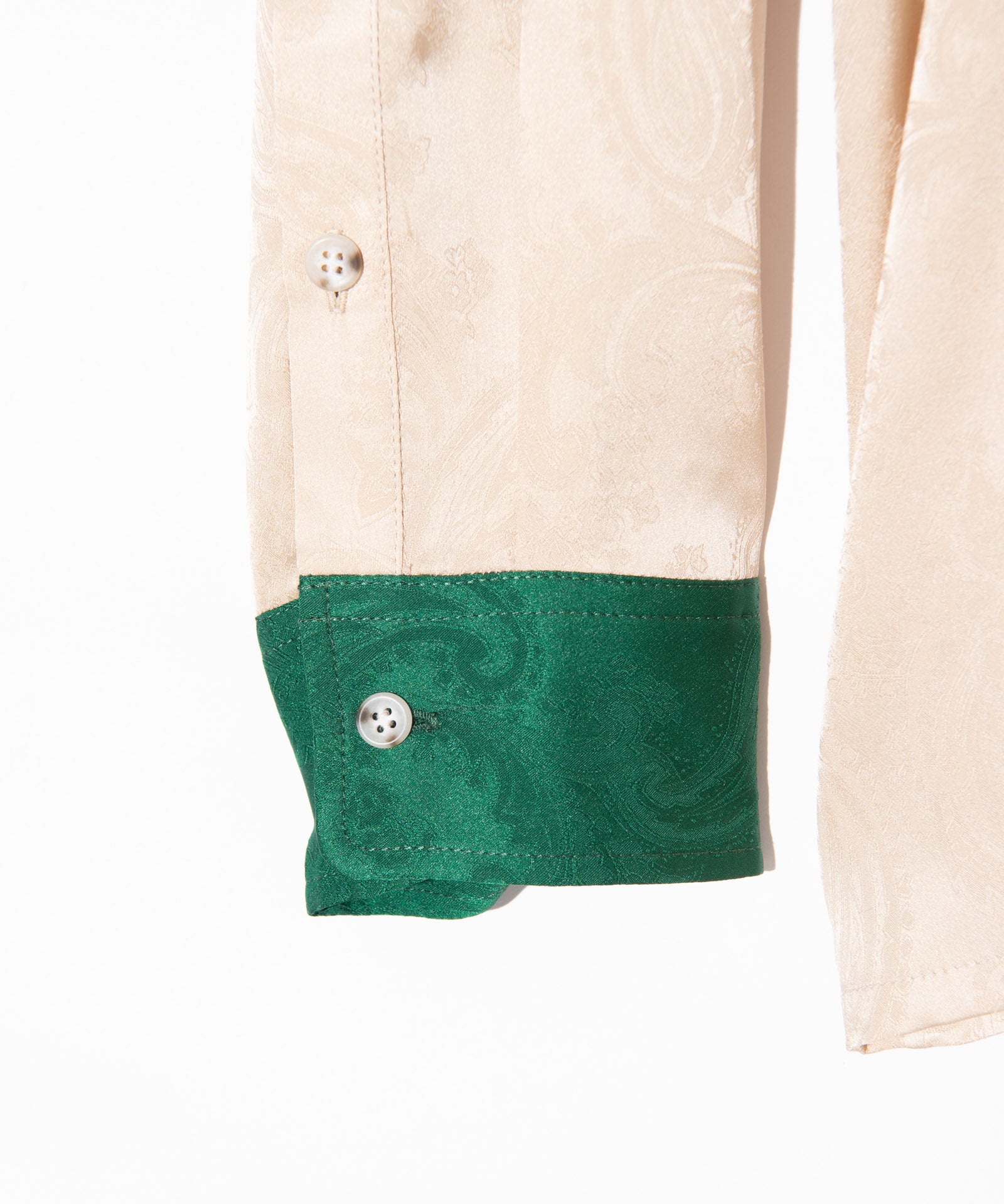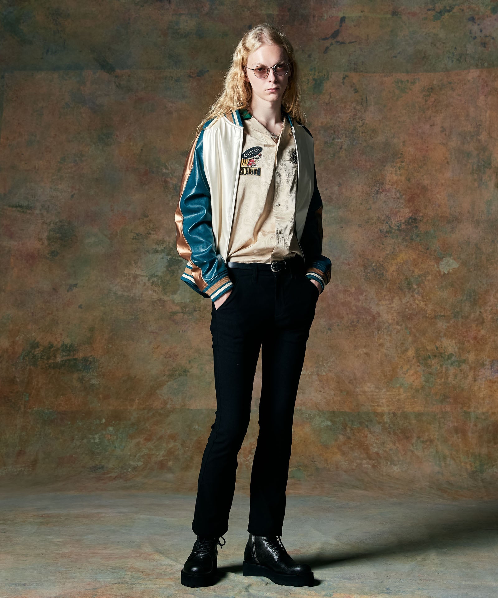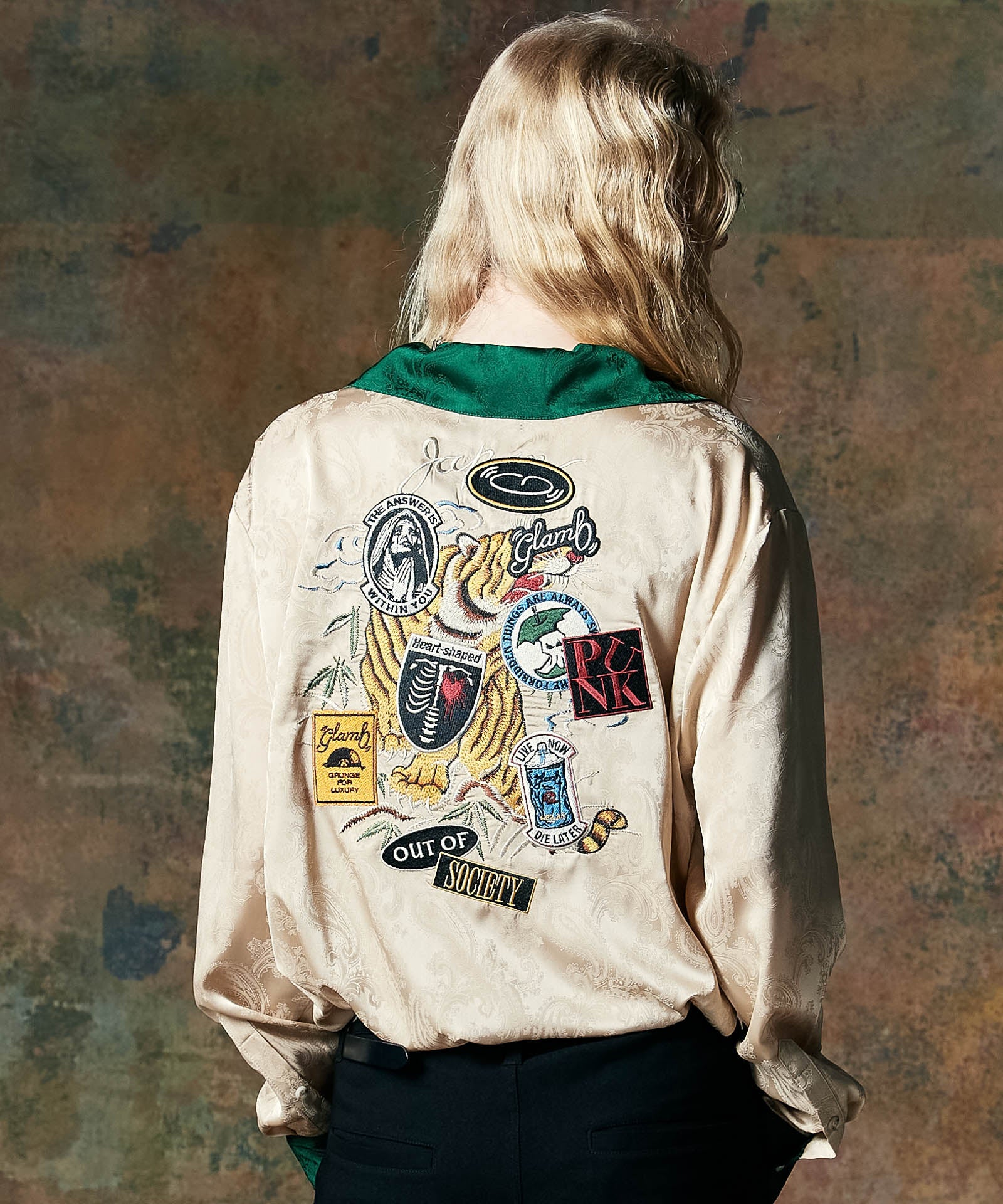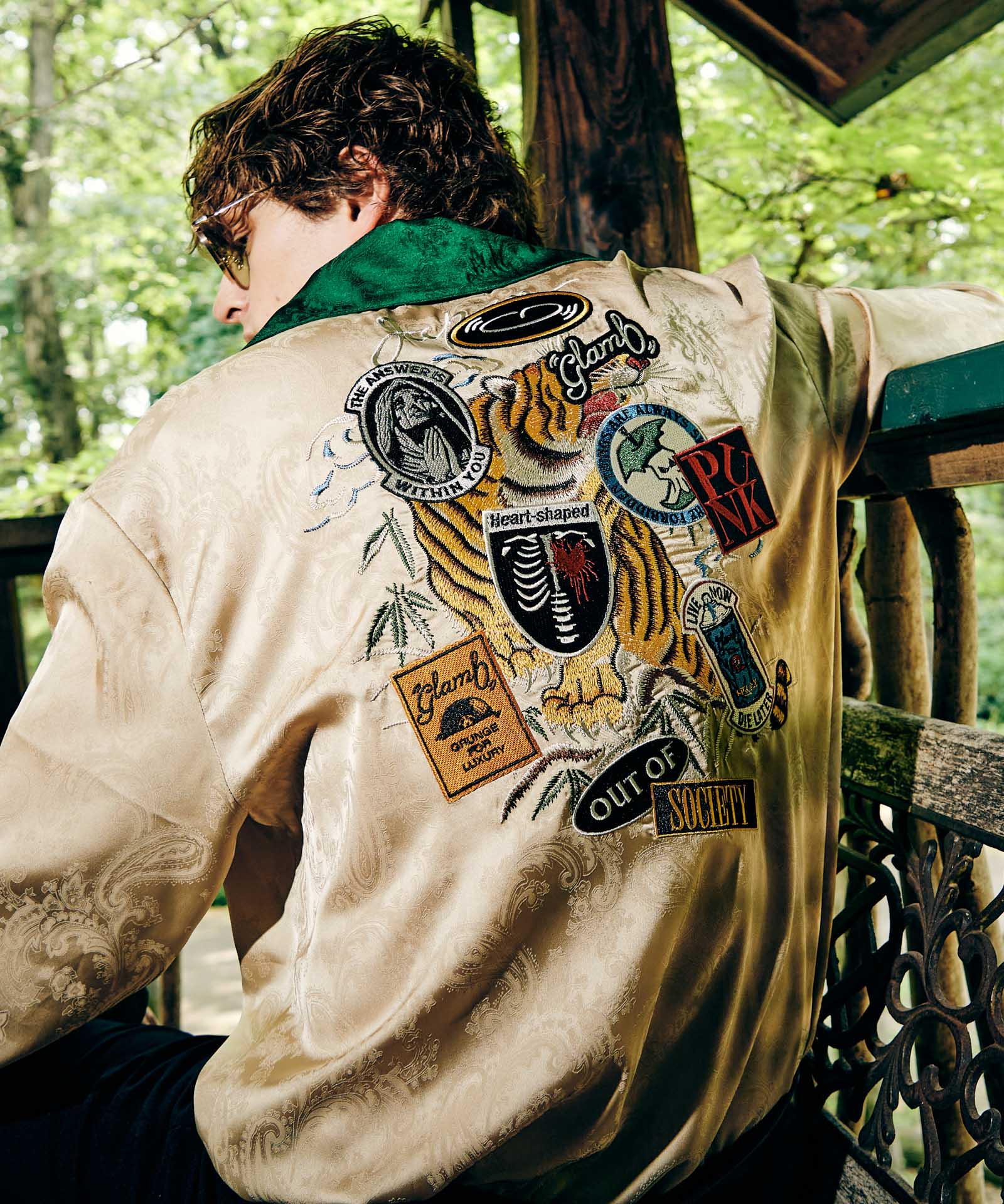将纪念夹克的设计融入衬衫的Out of Society Ska Shirt。 咆哮的老虎图案上点缀着品牌logo和本季系列主题,以及最近品牌的象征图案。 徽章上能看到的部分也全部用刺绣装饰,抑制厚度,从单品穿着到叠穿都带来了搭配的好处。 有放松气氛的身体使用在纺织品显出琉克斯的光泽的佩斯利花纹提花缎。 开领衬衫的野性和质地、刺绣的优质纹理相辅相成,将原始风格升华为奢华的1枚。